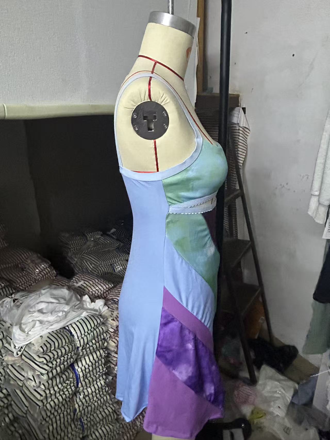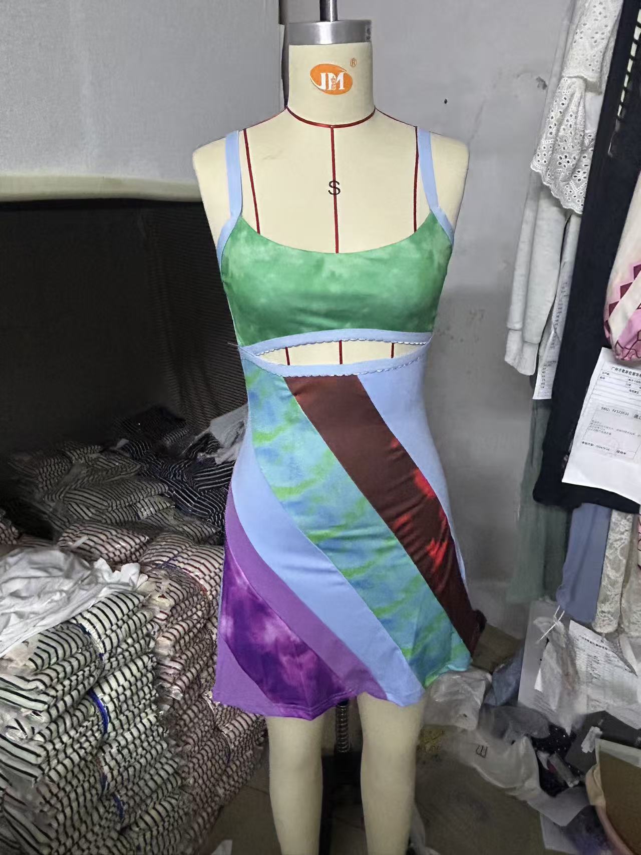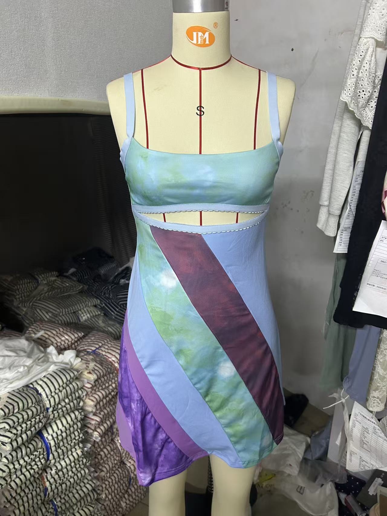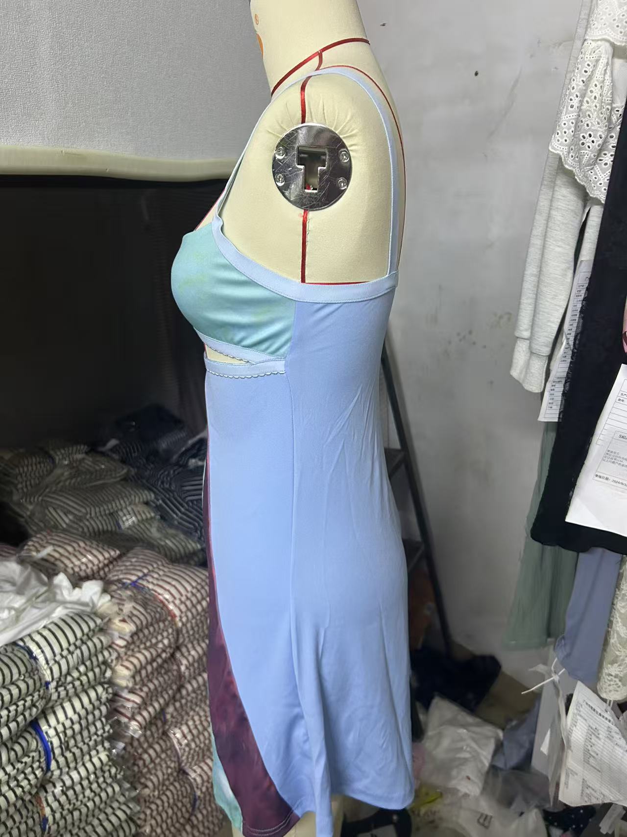 Cross-border 2023 Summer European and American Fashion Backless Skirt Sexy U-collar Chest Color-matching Hollow A- line Dress for Women