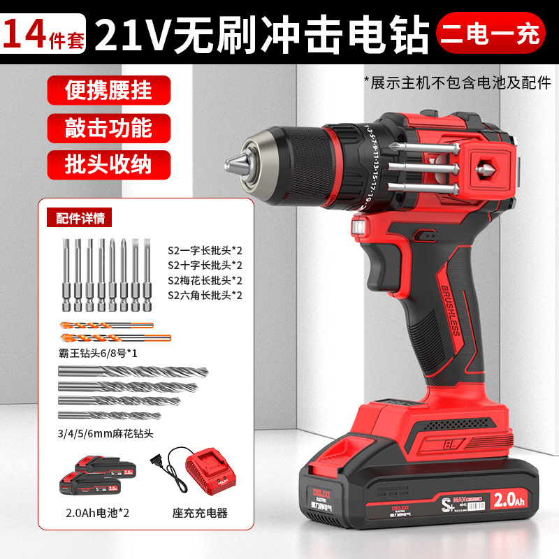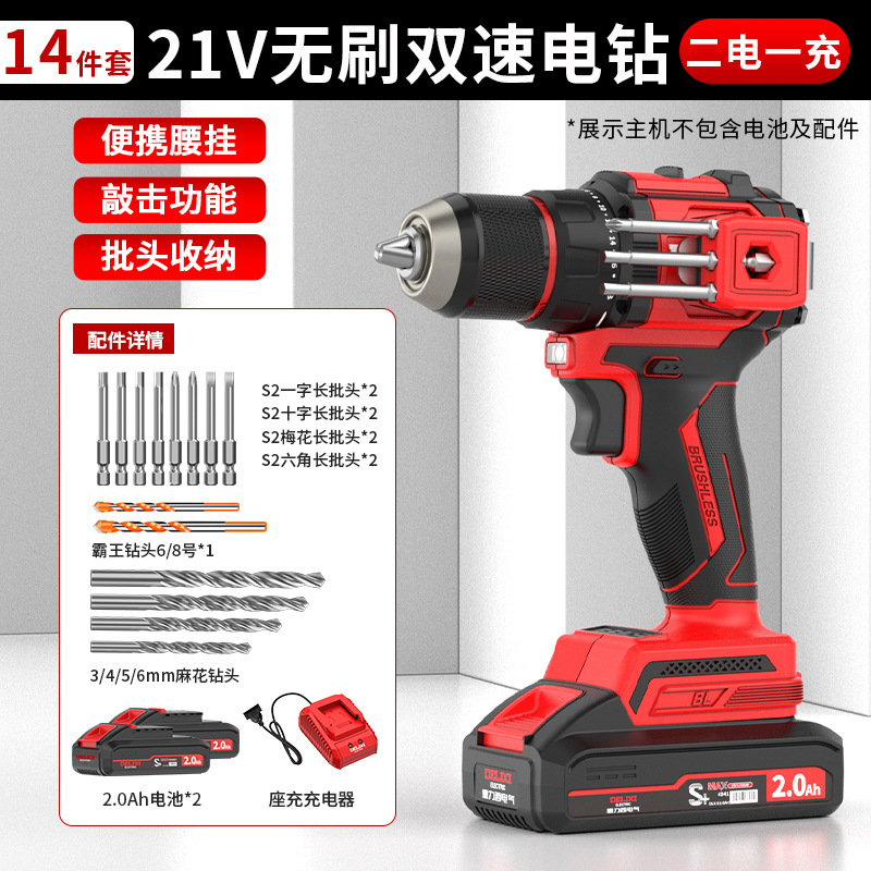 21v dual-speed electric drill 2.0ah [two batteries and one charger] + percussion block accessory package + 14-piece drill bit set
