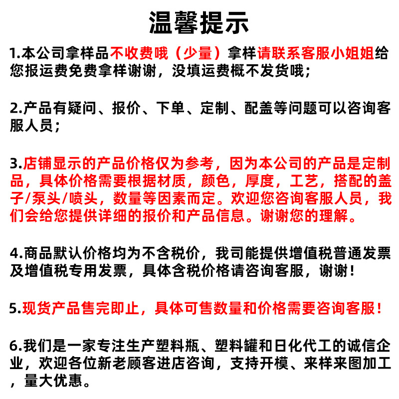 1、不用担心遇到:HDPE瓶子瓶口歪斜,瓶口不平整,有毛刺,瓶身有明显黑点、杂点、线条,厚薄不均,甚至漏液等;