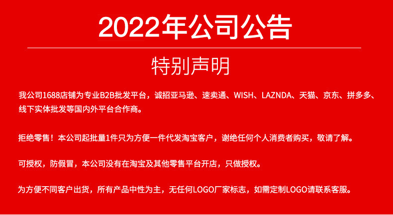 3.代发客户请严格按照规我厂规定的市场指导价销售,低价乱价者,一经发现,我厂将通过专利以及图片知识产权等方式进行投诉,取消代发资格,感谢支持!