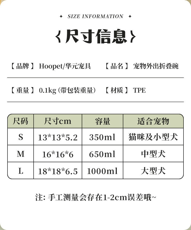 【品名】:HOOPET 外出折叠碗小号/中号/大号-蓝色/绿色/黄色