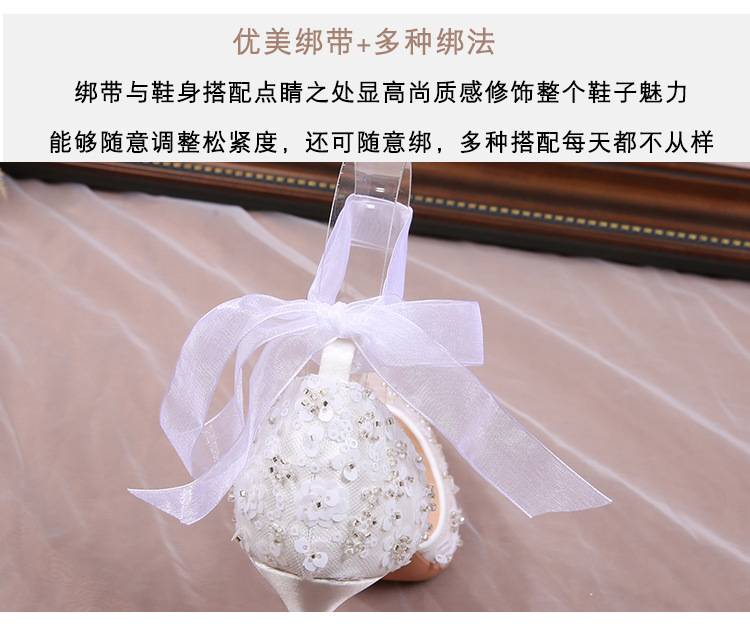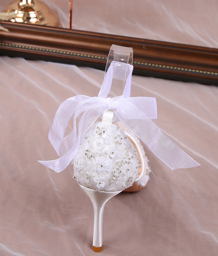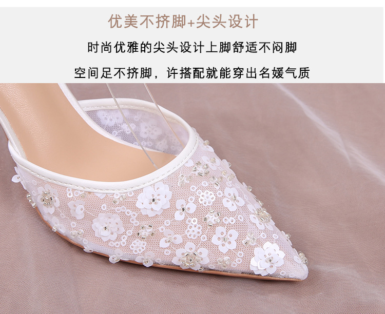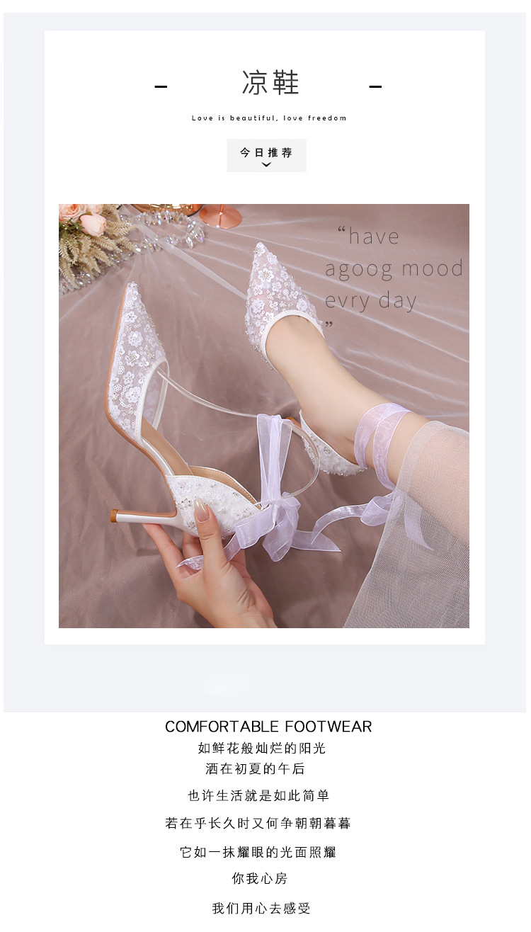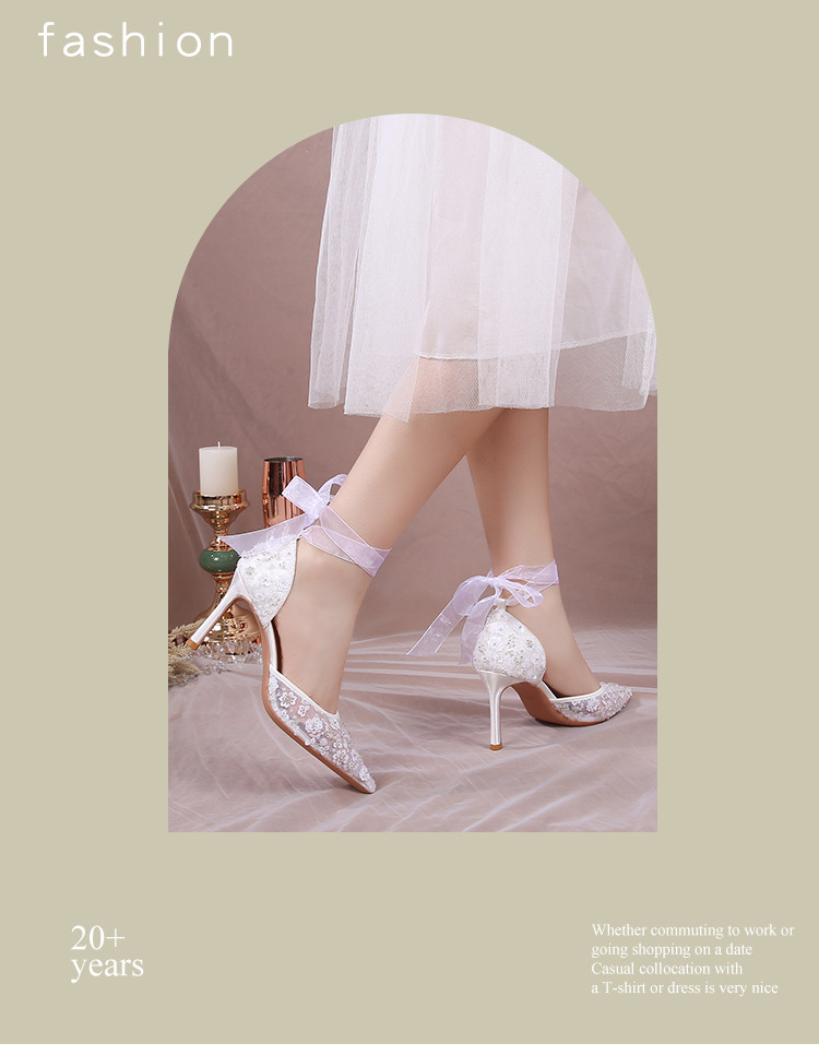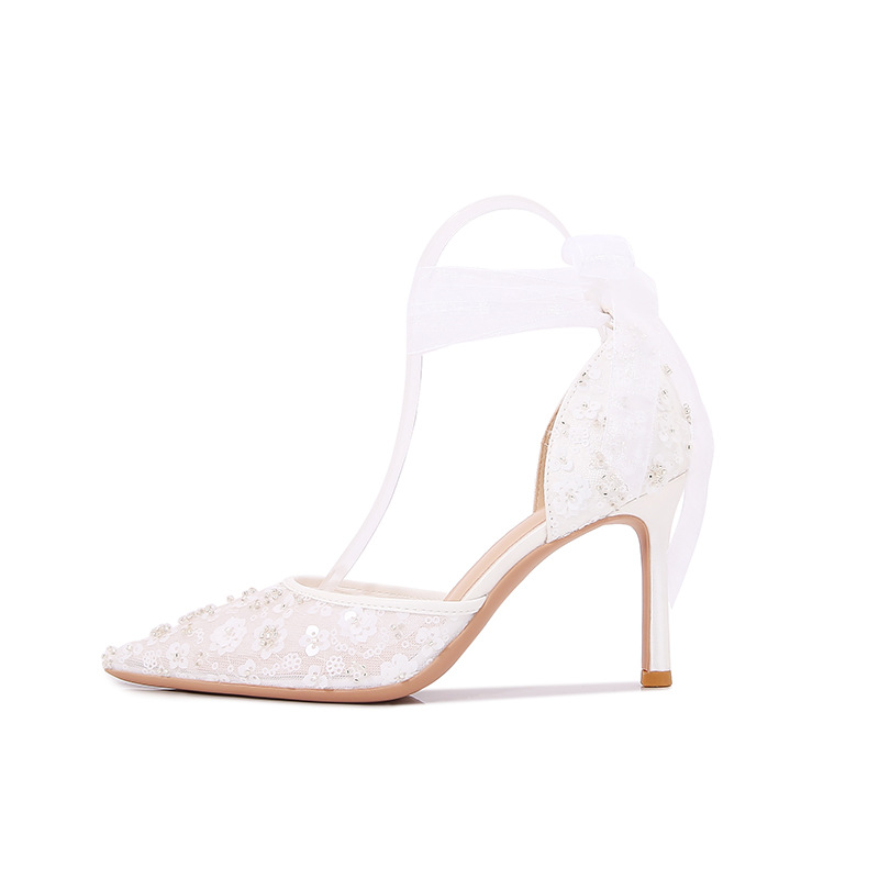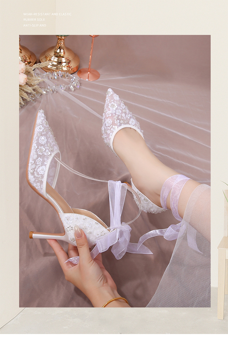 Carefully Selected 2023 Summer French-Style Sequin Hollow Sandals, White Lace-Up Pointed Toe Stiletto Wedding Shoes