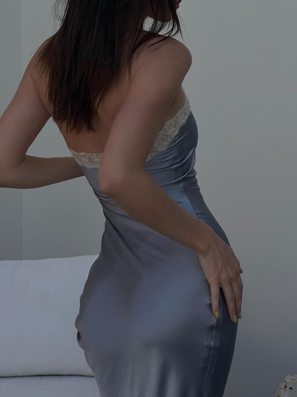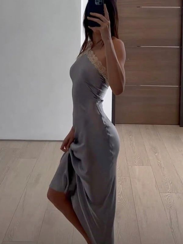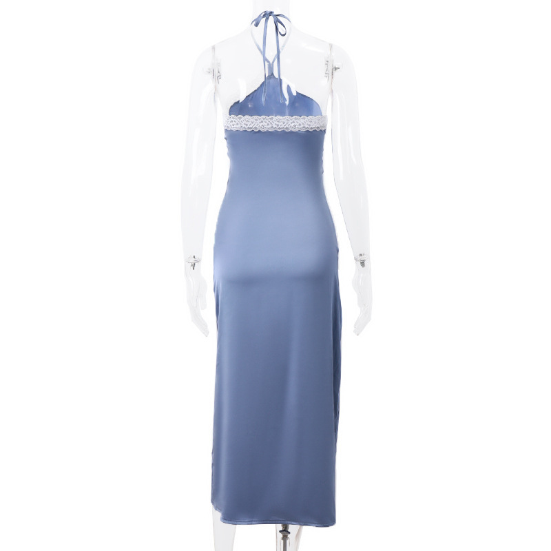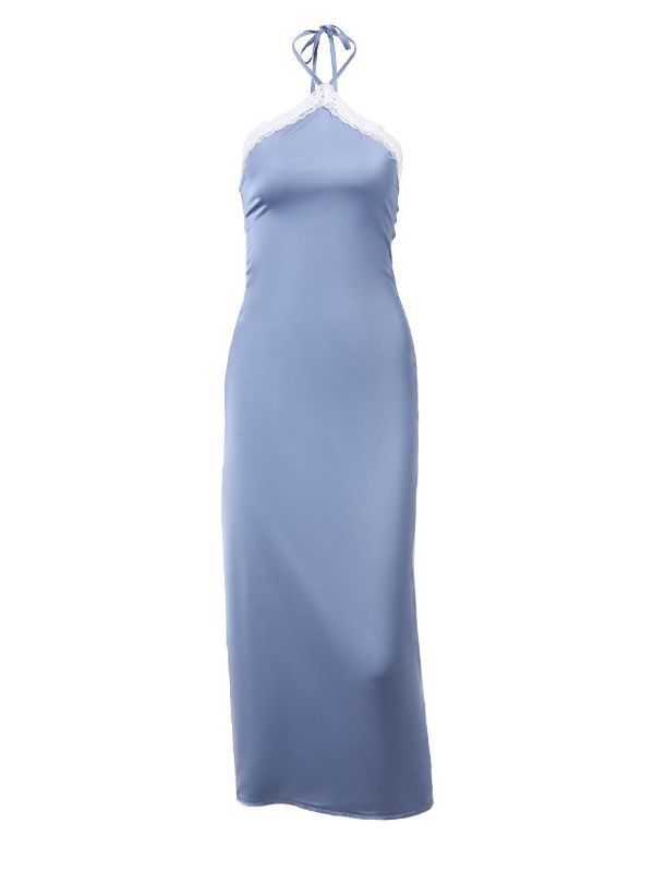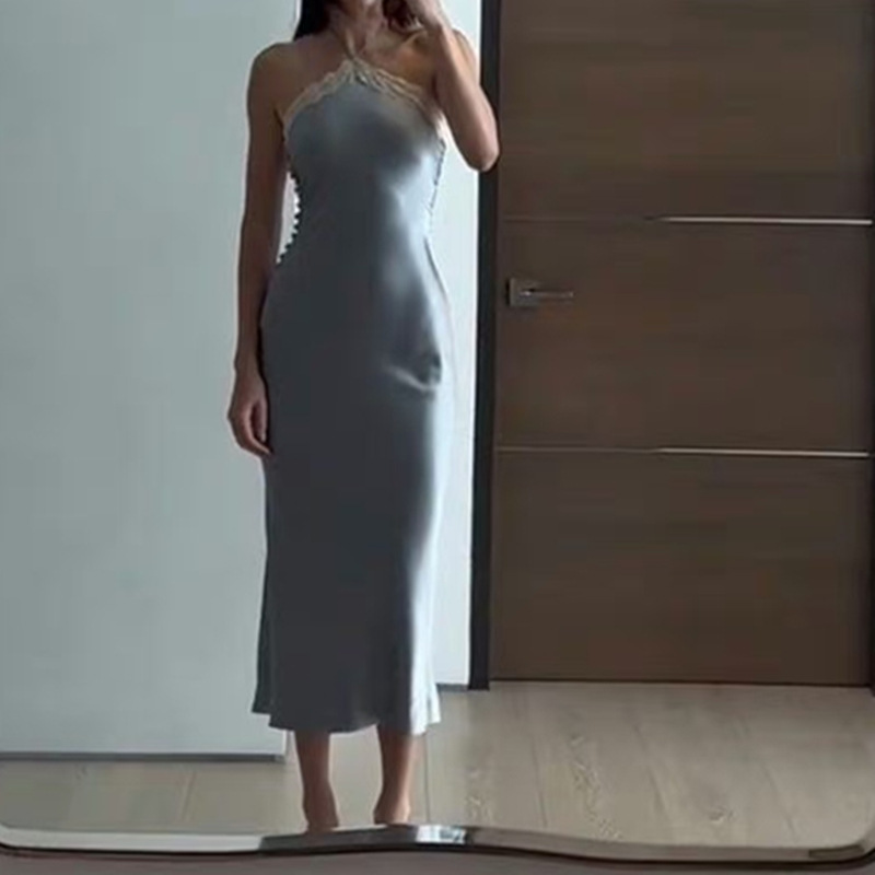 European and American Women's Clothing Spring New Style Sexy Socialite Satin Pleated Lace Halter Neck Dress