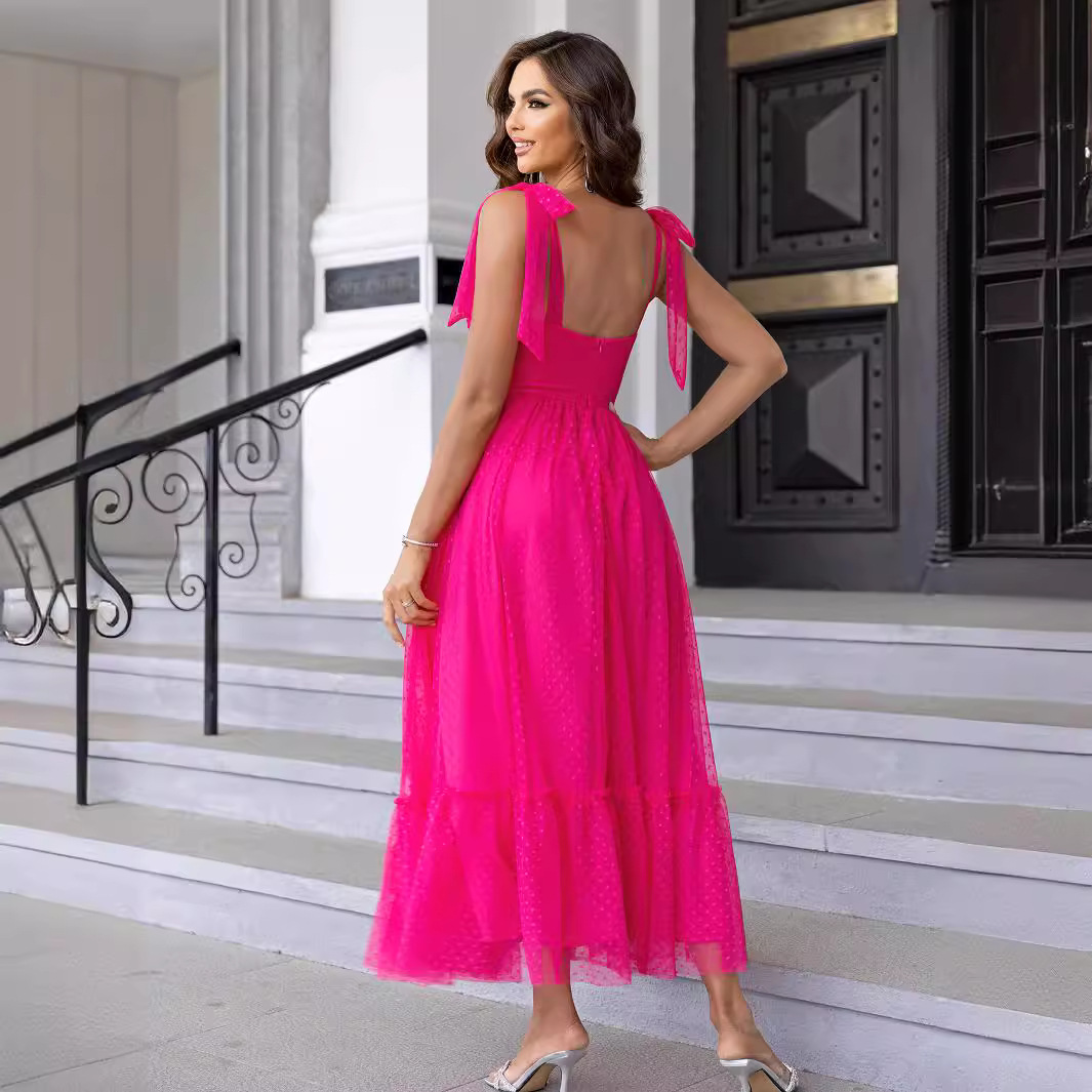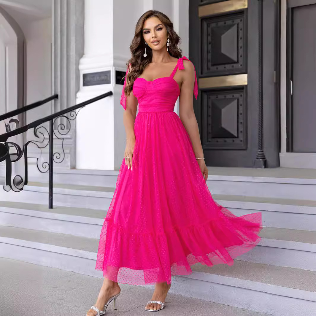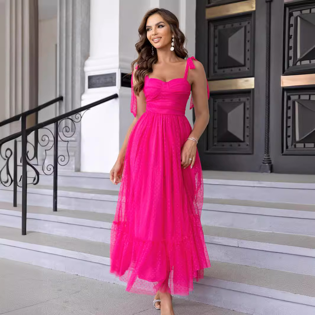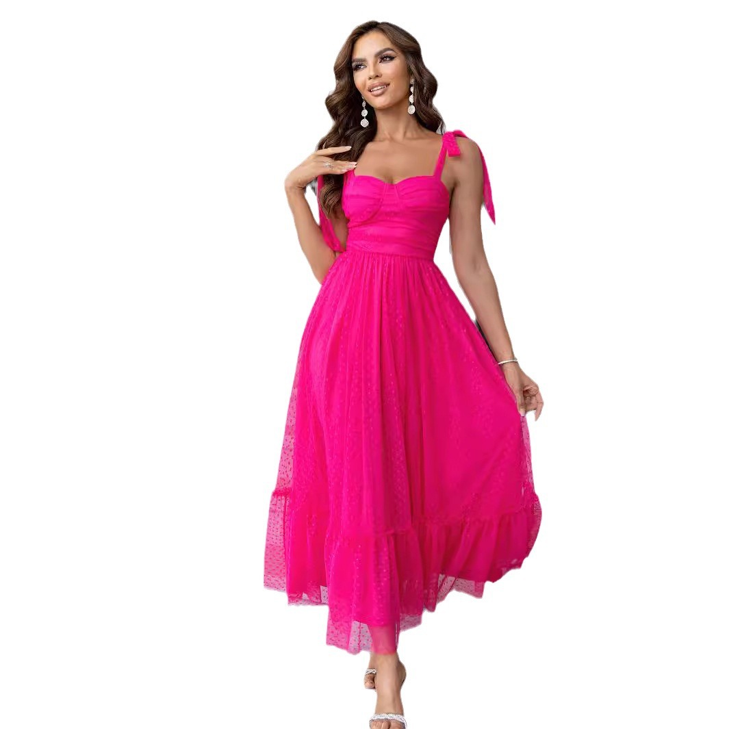 Summer new fashion lace-up shoulder pleated bust ruffled hem mesh fabric covered camouflage dress