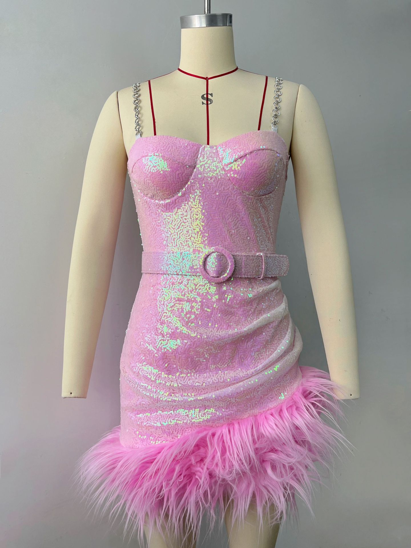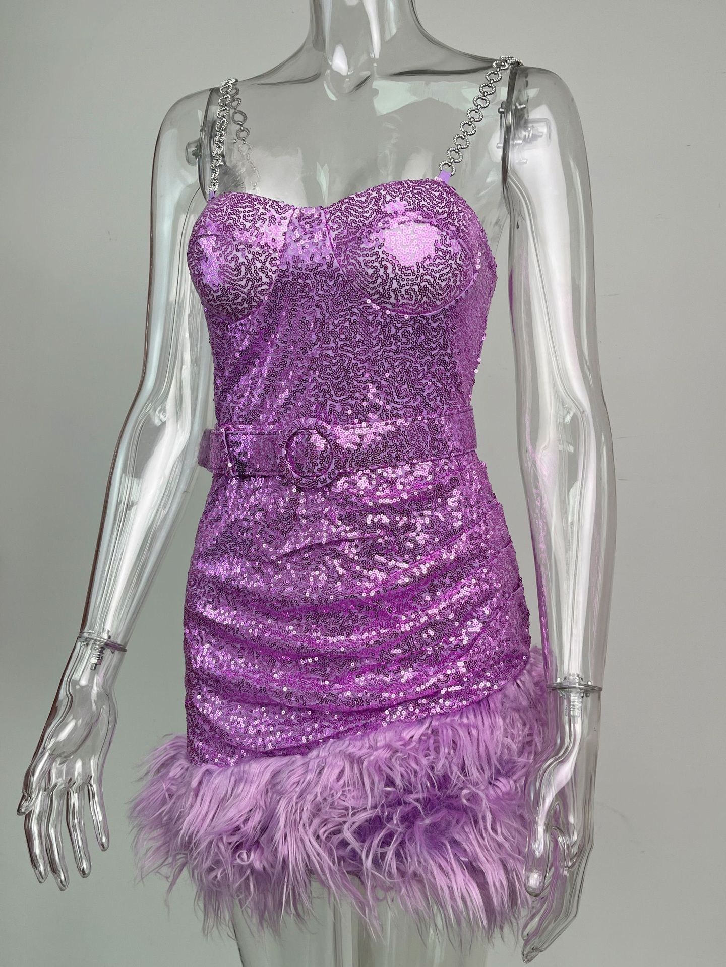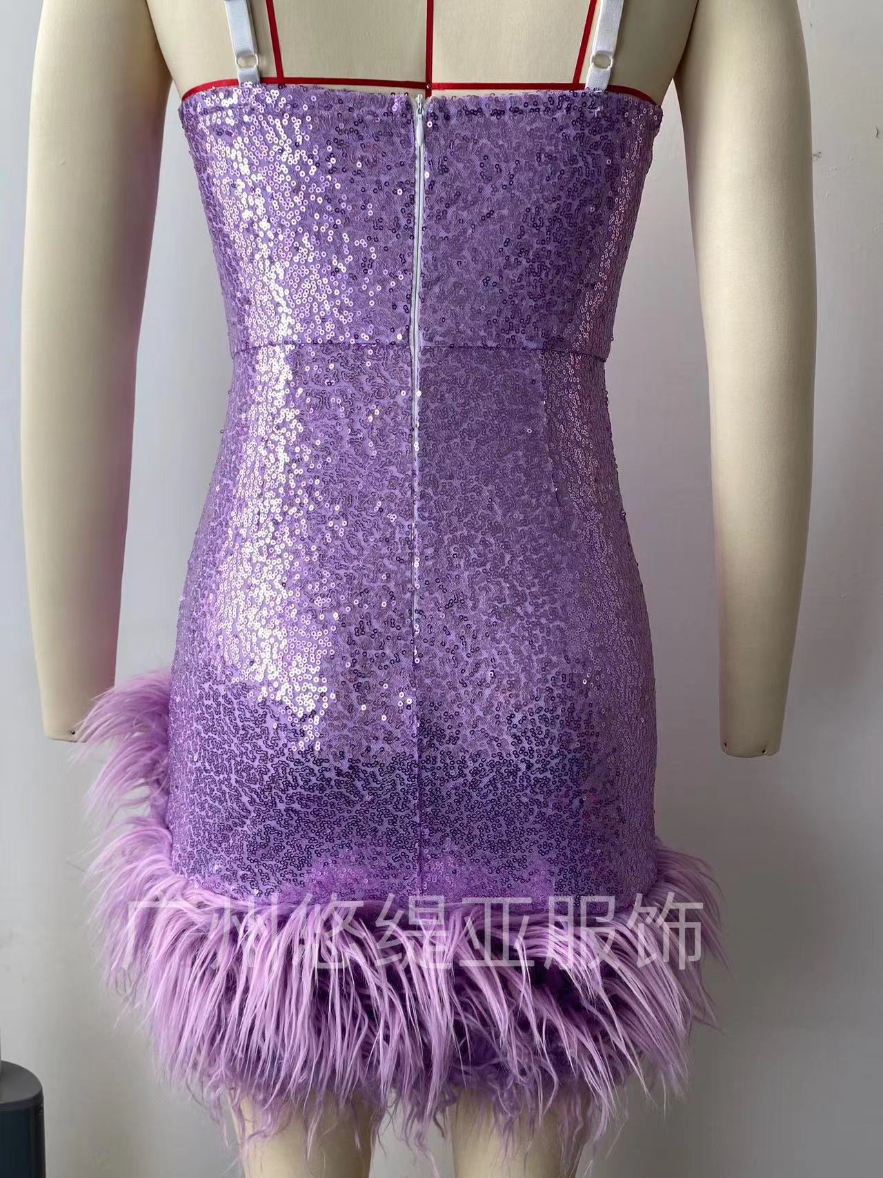 Cross-Border Evening Dress Women's Sexy Tight One-Step Skirt Dress Artificial Fur Belt Purple Sequin Suspender Skirt