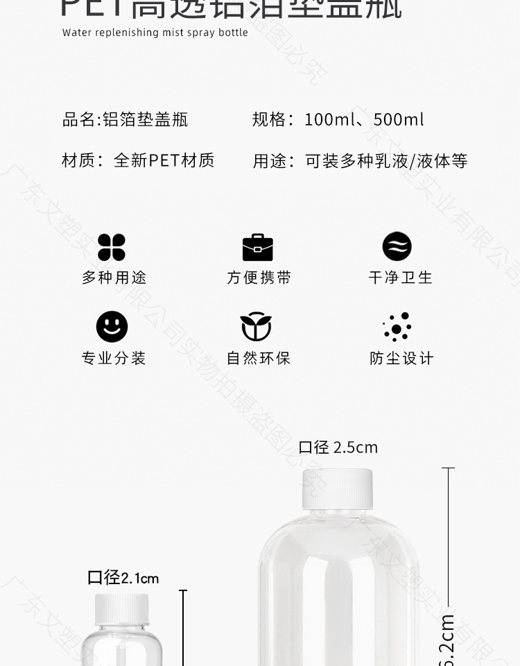 Pre-sale 500ml; extra-thick bottle with aluminum foil pads with white cap (sold by box of 60 pieces, not shipped if one box is insufficient); pet