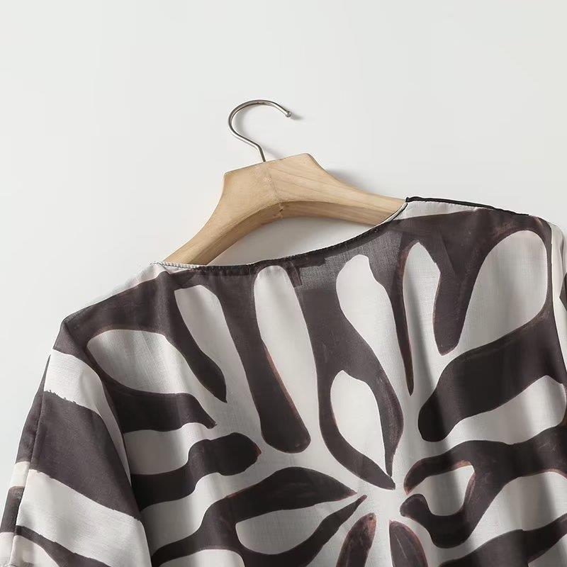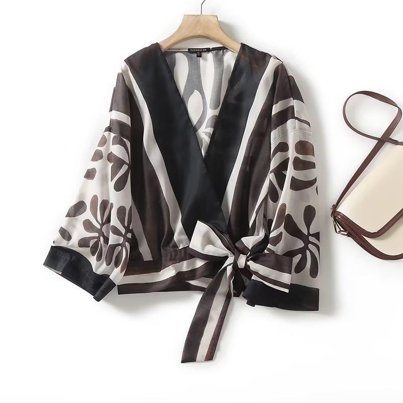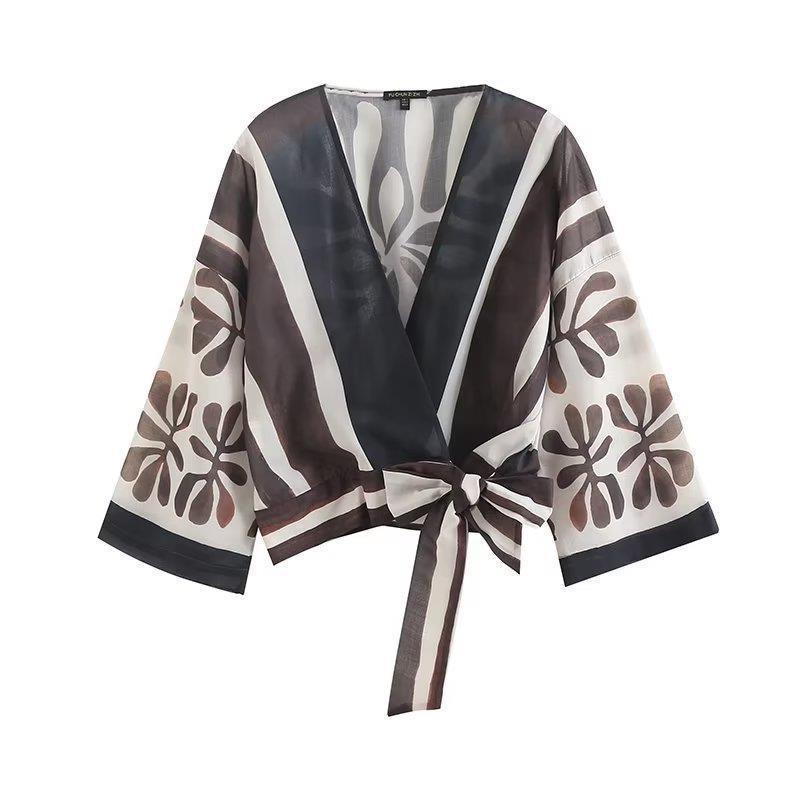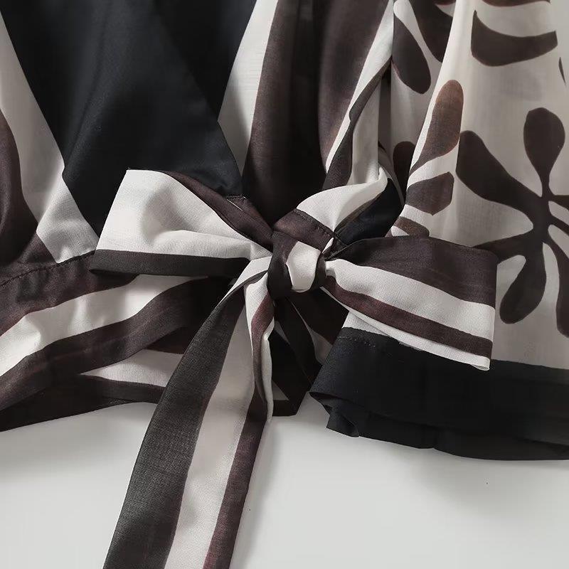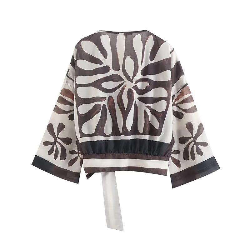 BM & MD & ZA Summer Women's New Bohemian Printed Short Shirt Lace-up Long Sleeve Shirt