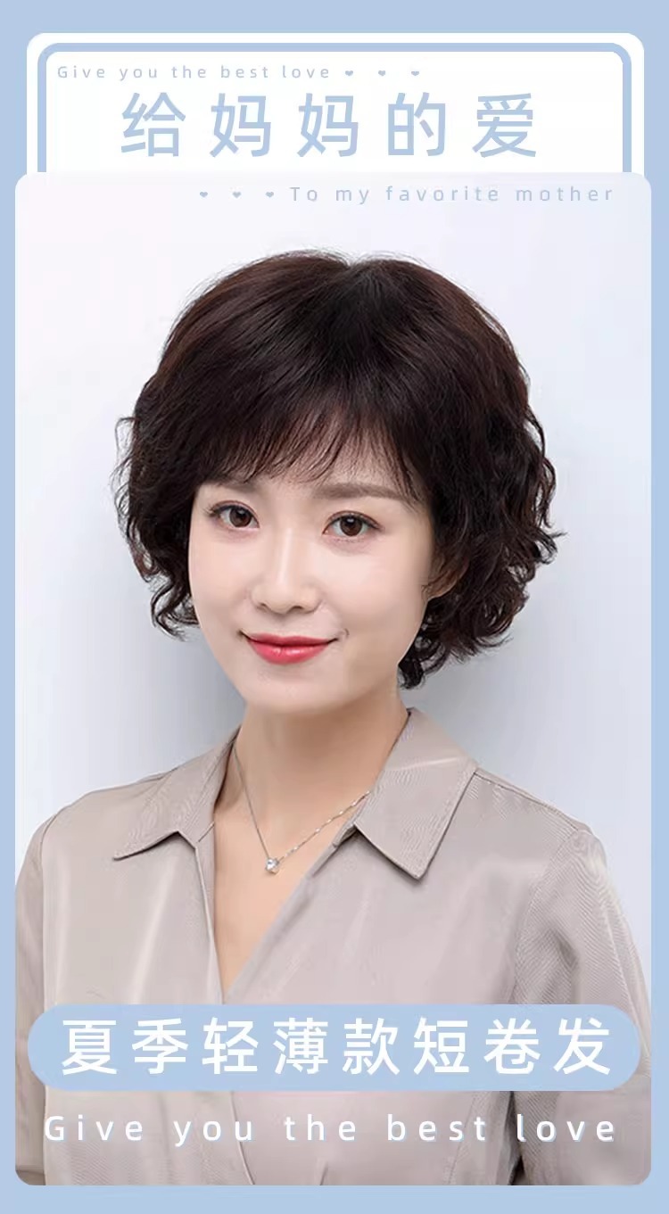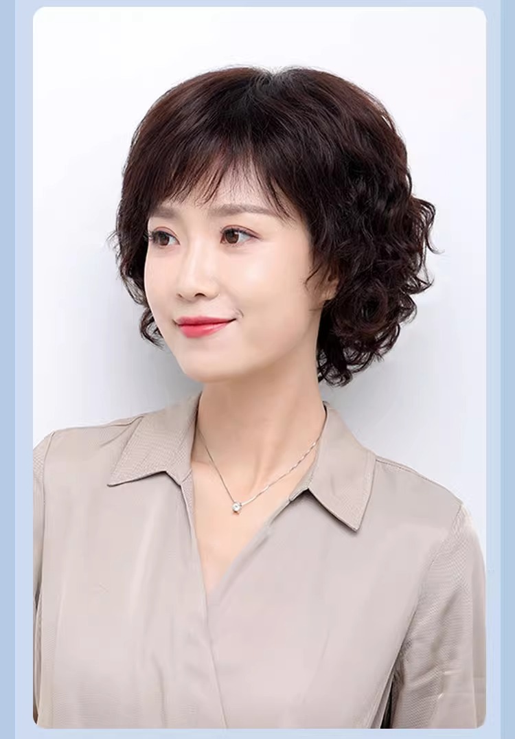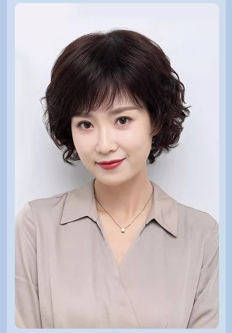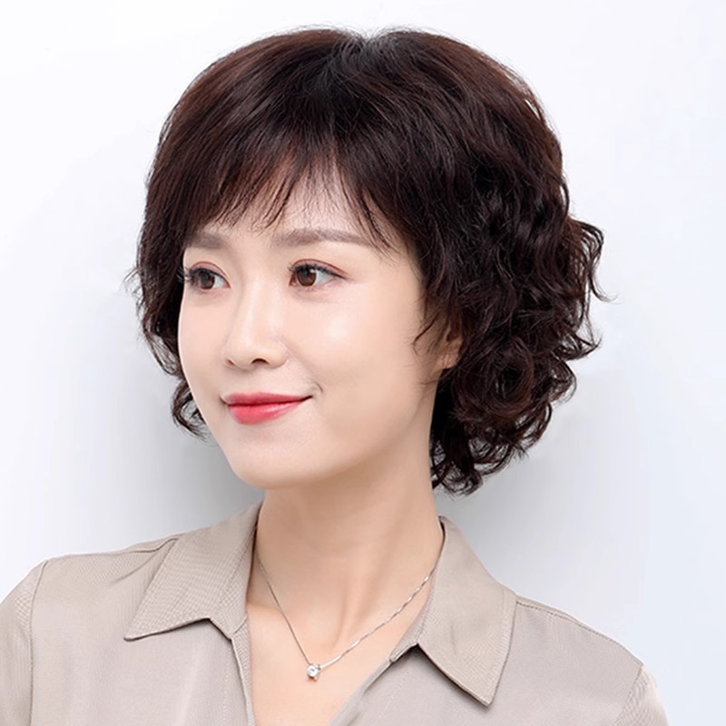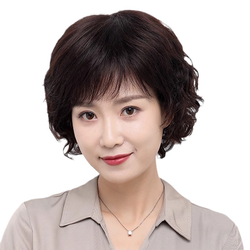 Wig women's short hair women's real hair full top short curly hair fashion middle-aged and elderly mother wig full head real hair natural