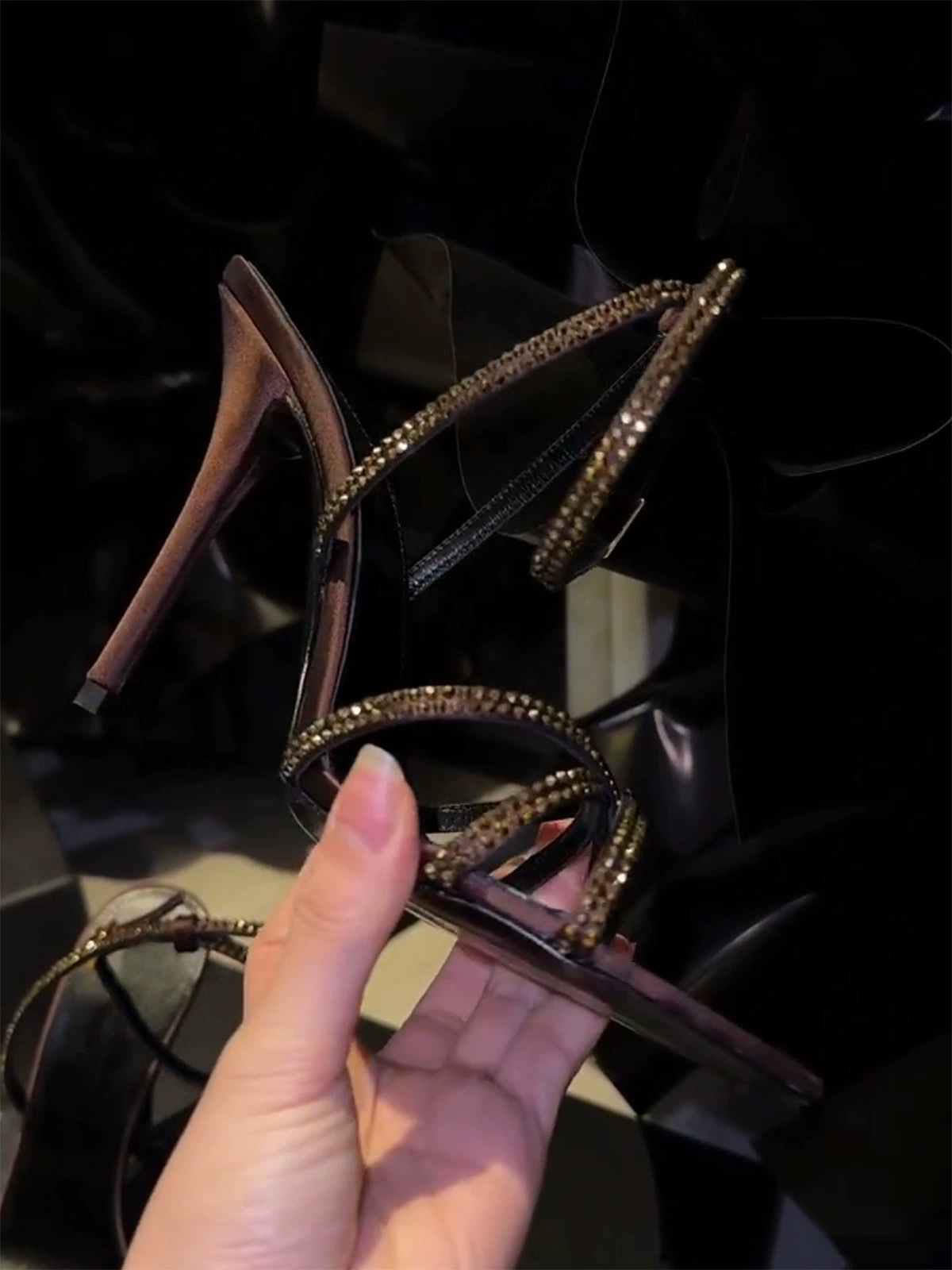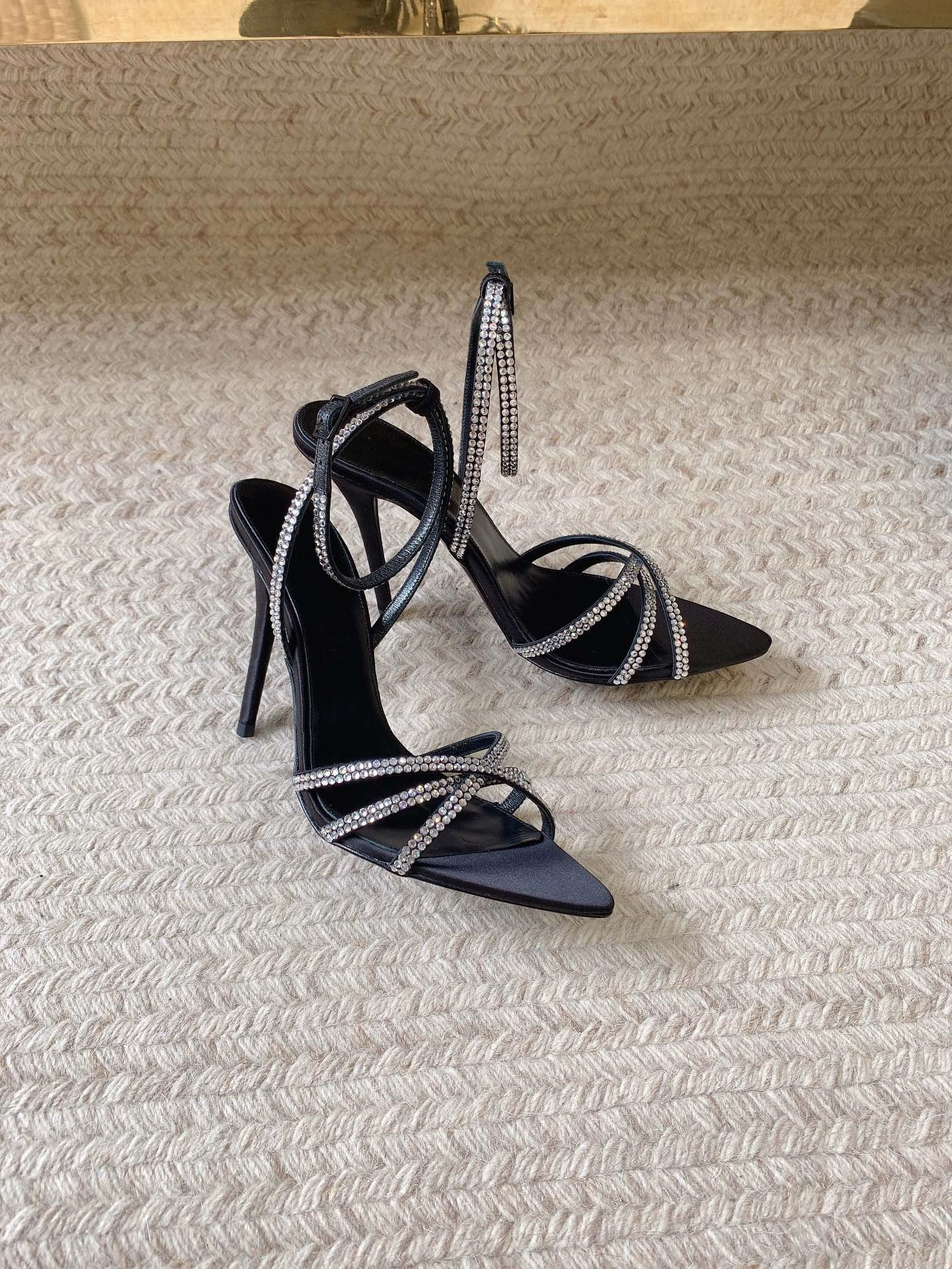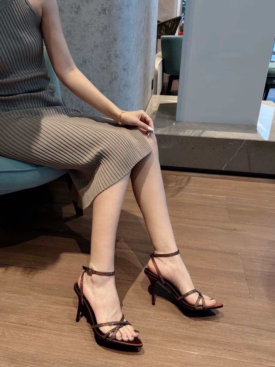 2024 Summer Rhinestone Brown Stiletto Satin Open-Toe Pointed Toe Cross Strap Sandals Women's High Heels