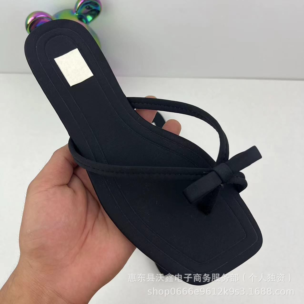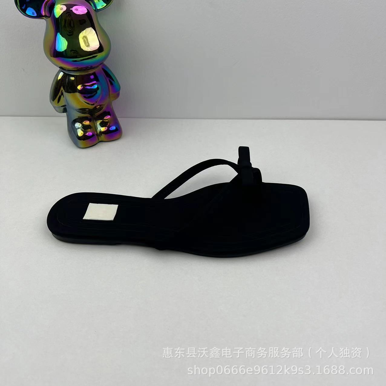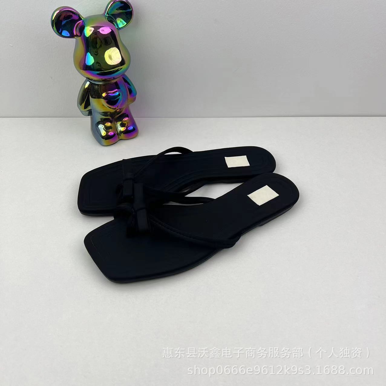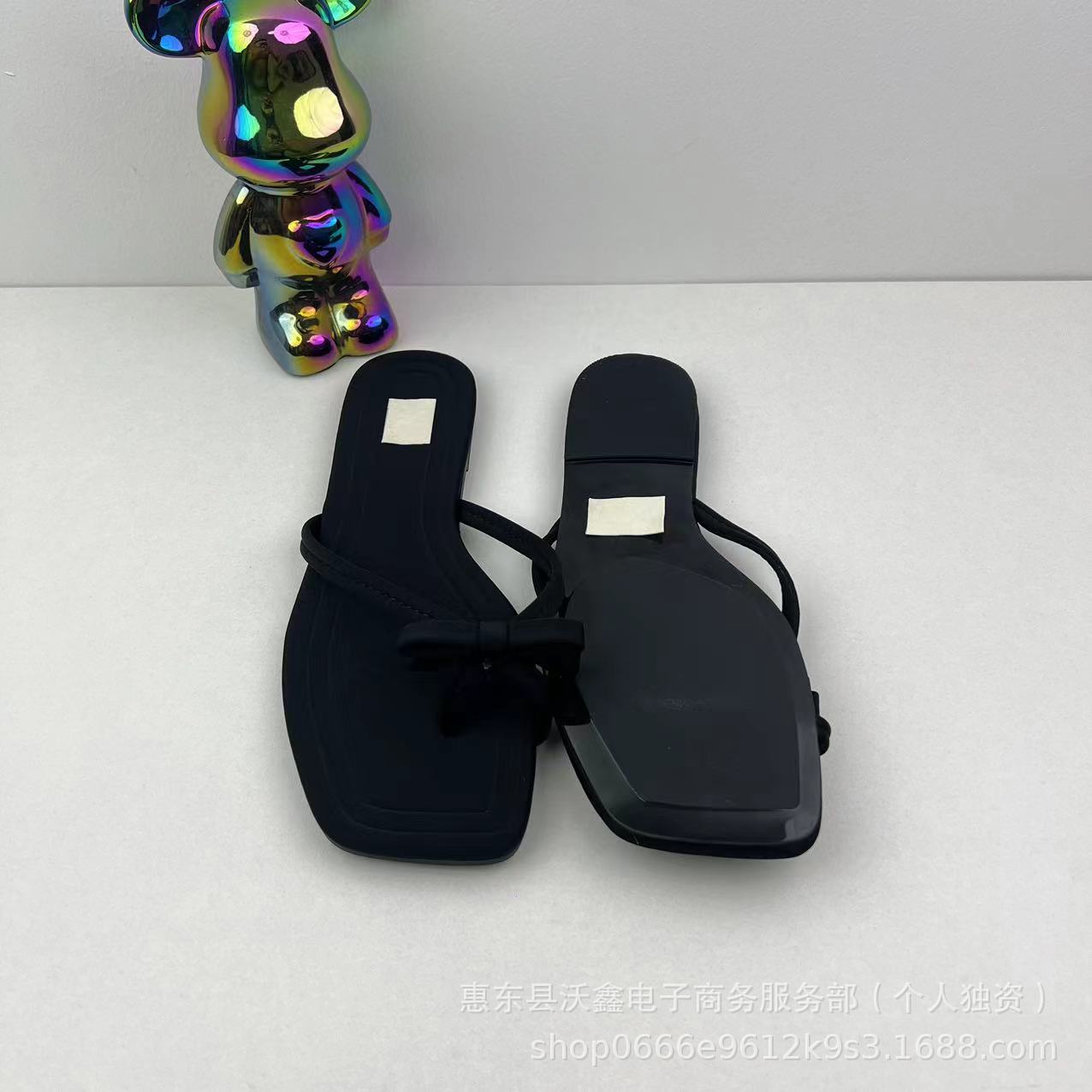 沃鑫ZA夏季新品TR女鞋黑色蝴蝶结装饰夹趾平底凉鞋方头外穿凉拖
