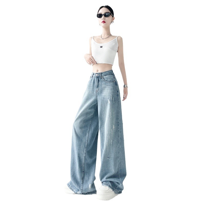 [Jinyin] Retro Washed Scratch Jeans Women's Loose High Waist Slimming Straight Leg Wide Leg Pants Mop Pants