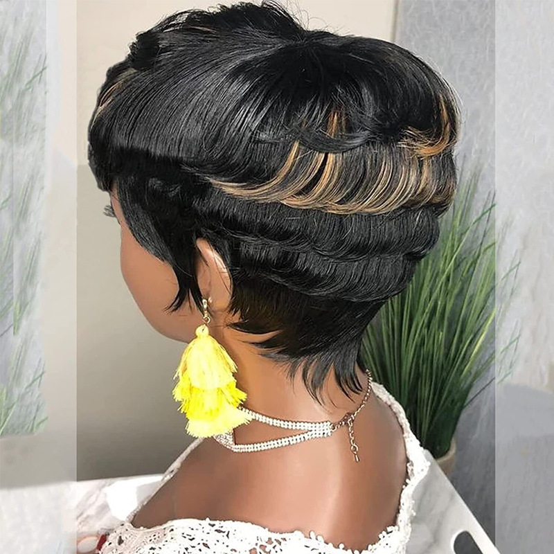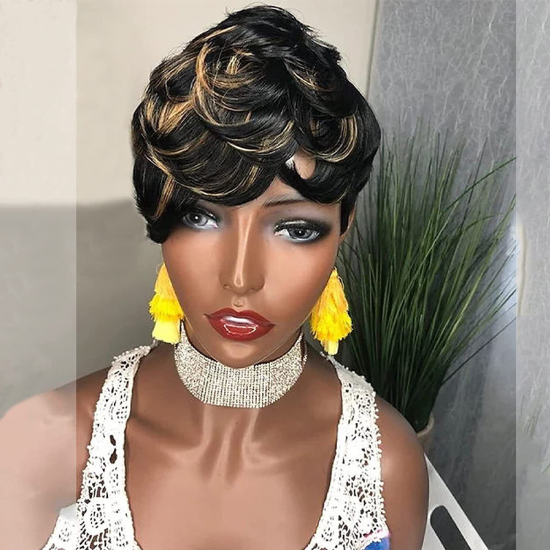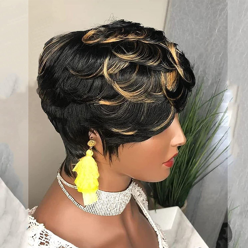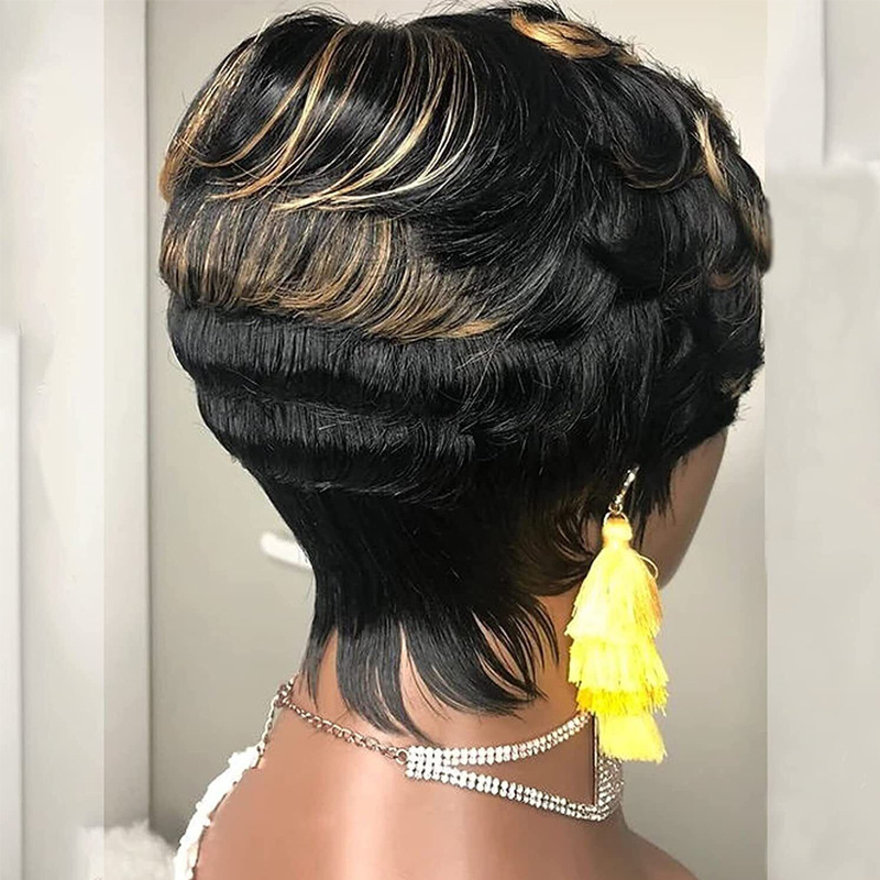 Realistic natural black gold shortwave wig elf cut wig with rippled bangs black blonde mix