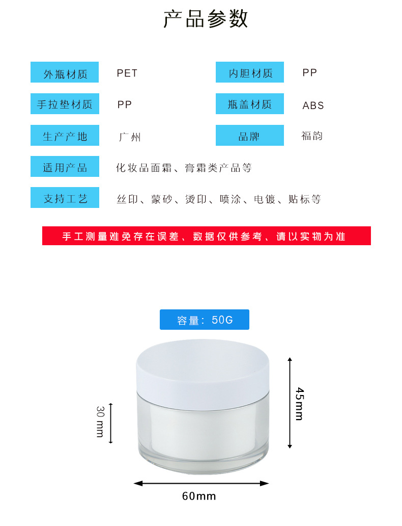 现货50G厚壁面霜瓶子PET双层膏霜瓶化妆品高档眼霜瓶广 口分装瓶罐