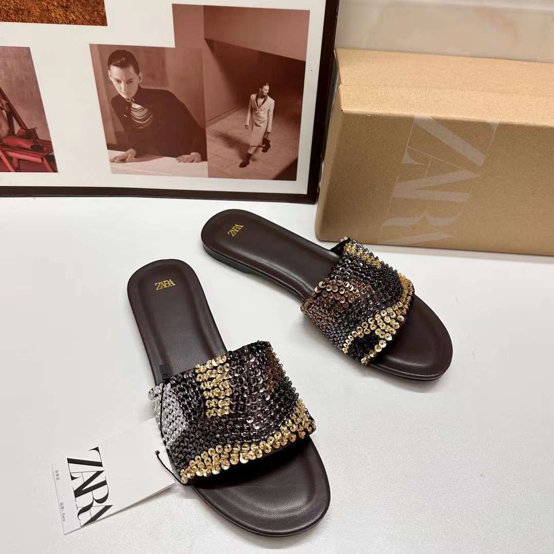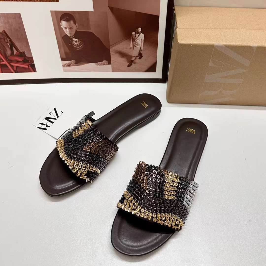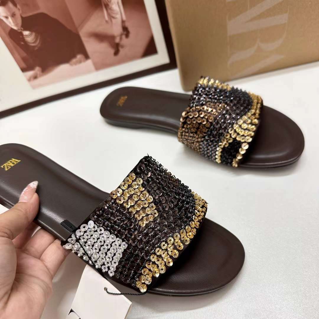 ZA2024 New Summer Slippers Round Toe Easiest for Match Flat Bottom Rhinestone Strap Color Matching Outerwear Sandals Fashionable Women's Shoes