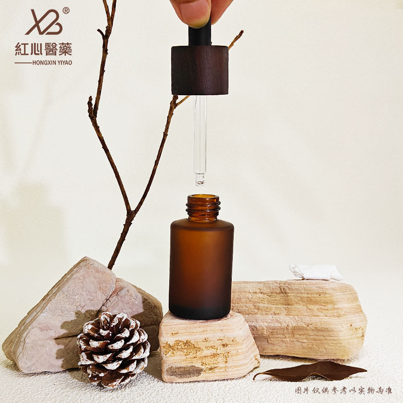 Empty bottle; glass; 30ml brown frosted cylindrical bottle with brown wooden ring frosted vinyl head