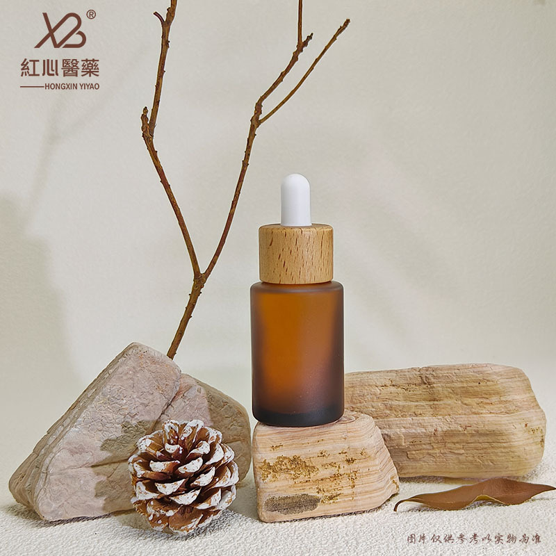 Empty bottle; glass; 30ml brown frosted cylindrical bottle with primary color wooden ring frosted white plastic head