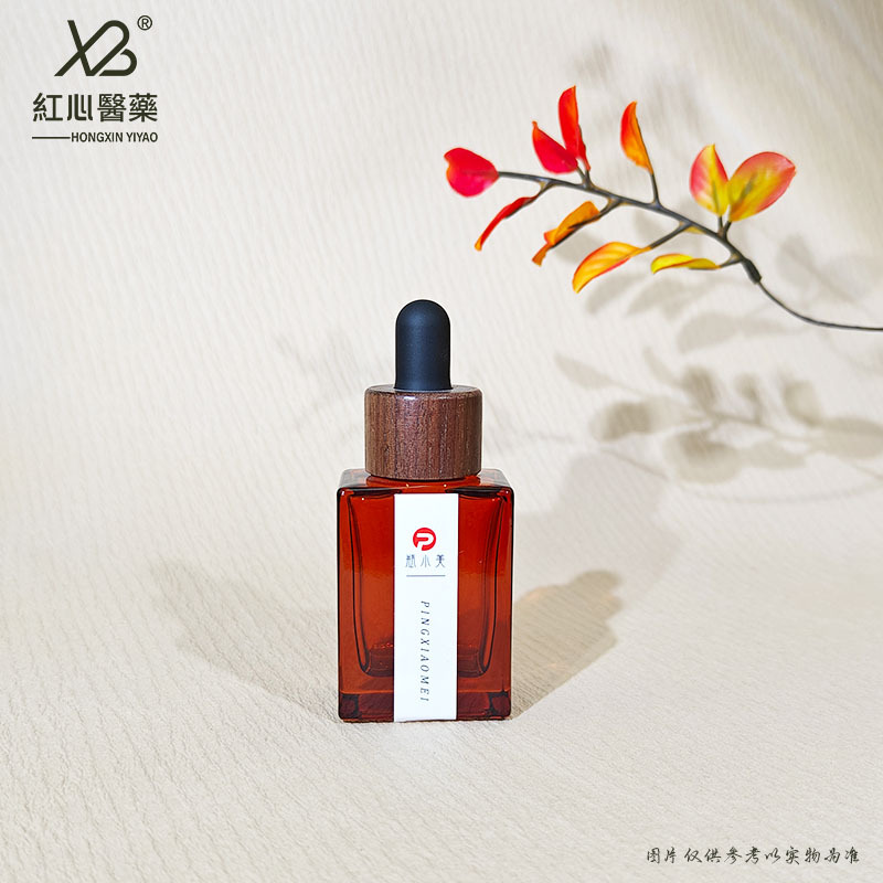 Empty bottle; glass; 30ml burgundy square bottle with brown wooden circle frosted white plastic head + 1.5 gasket