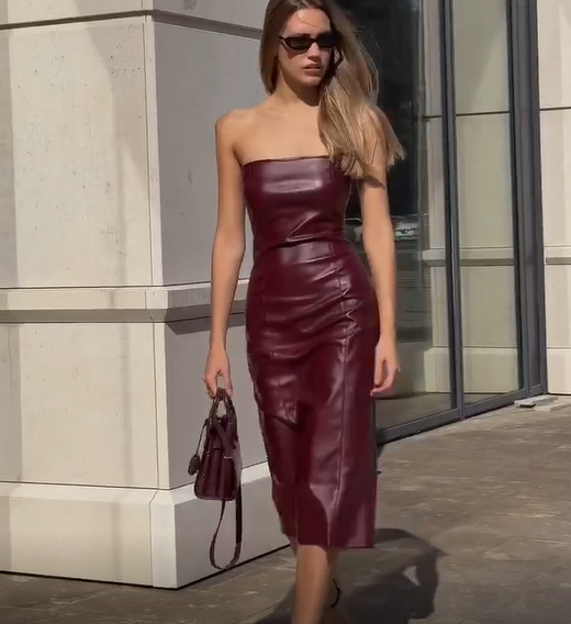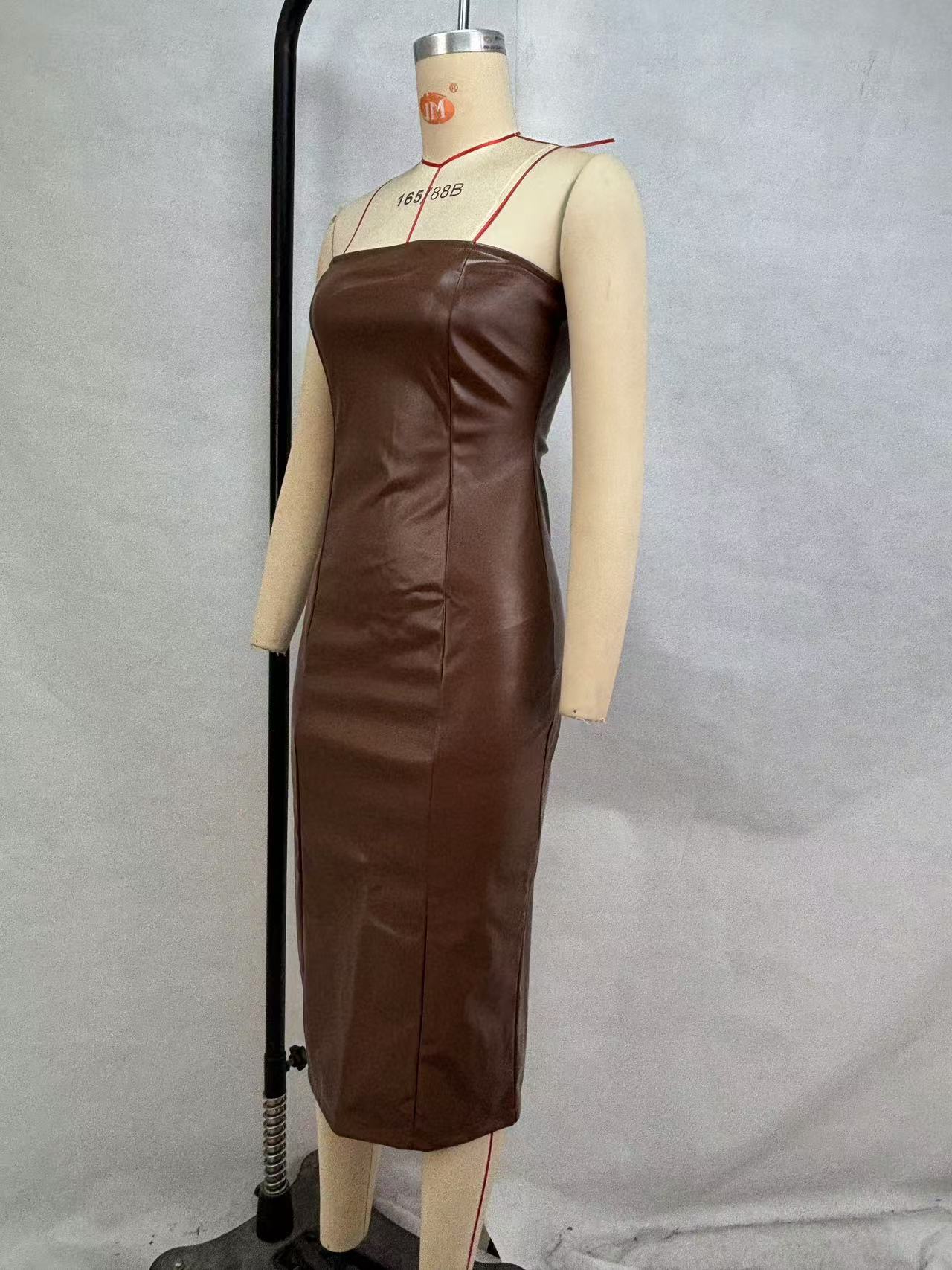 Cross-border European and American Women's 2024 Autumn and Winter Sexy Strapless dress PU Leather Solid Color Elegant Skirt Split Slim Fit