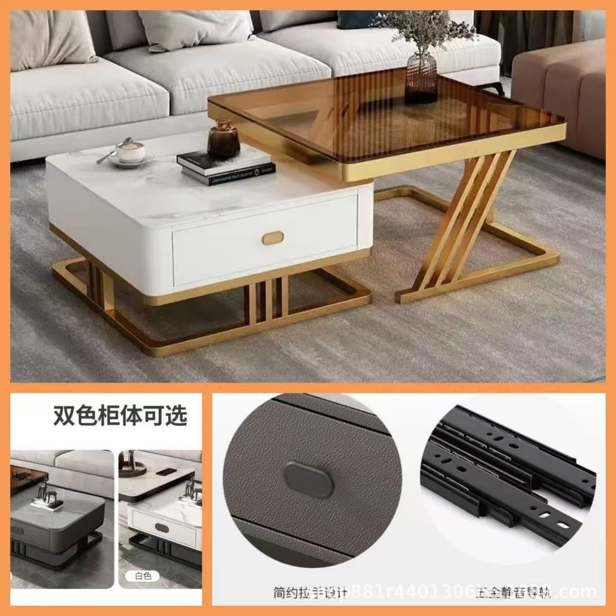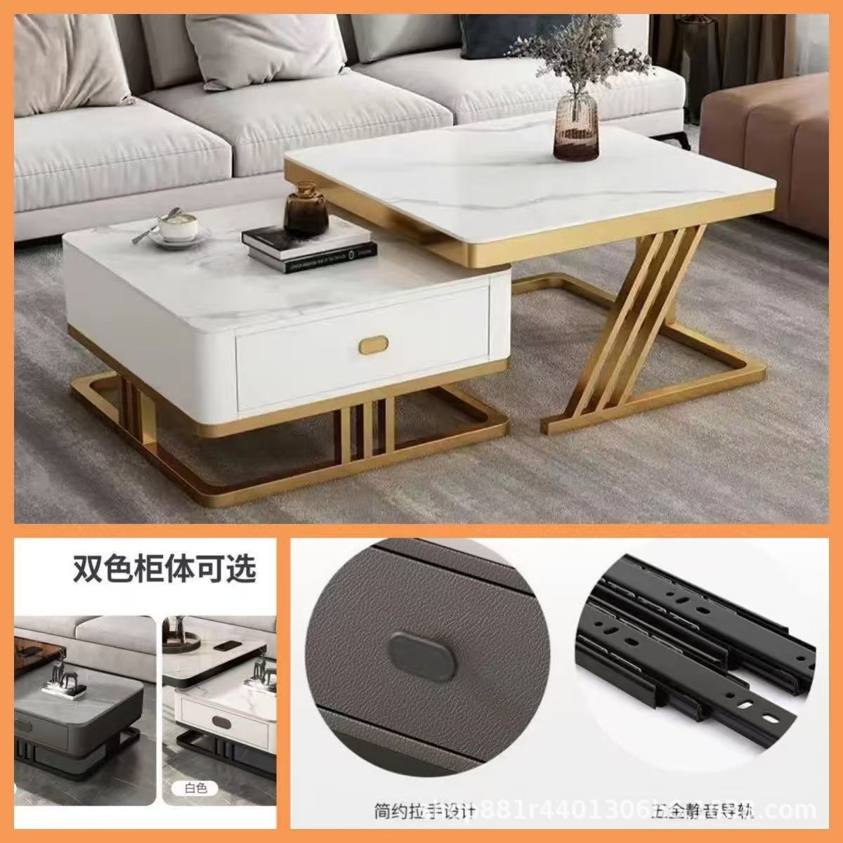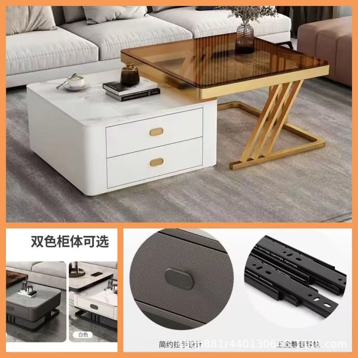 Gold frame double-layer white cabinet (white slate + brown glass)
