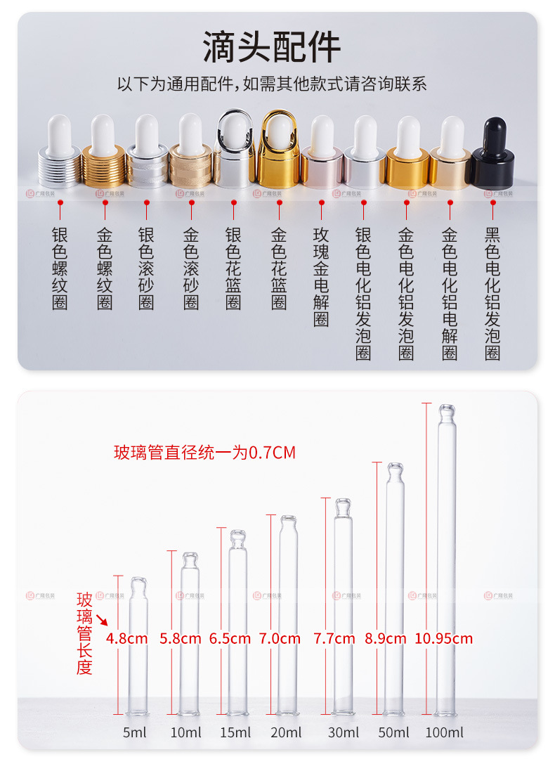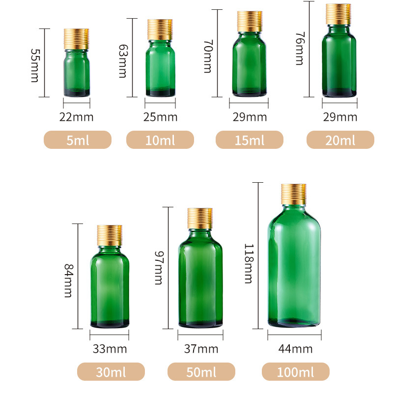 5ml (765 pieces/box), please take the whole box; green bottle + threaded gold ring + white plastic head + dropper; glass