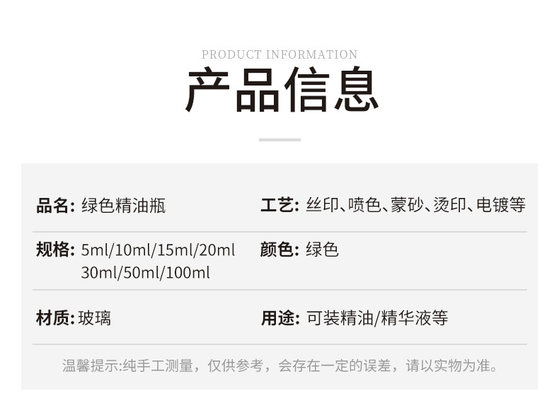 5ml (765 pieces/box), please take the whole box; green empty bottle (excluding accessories); glass