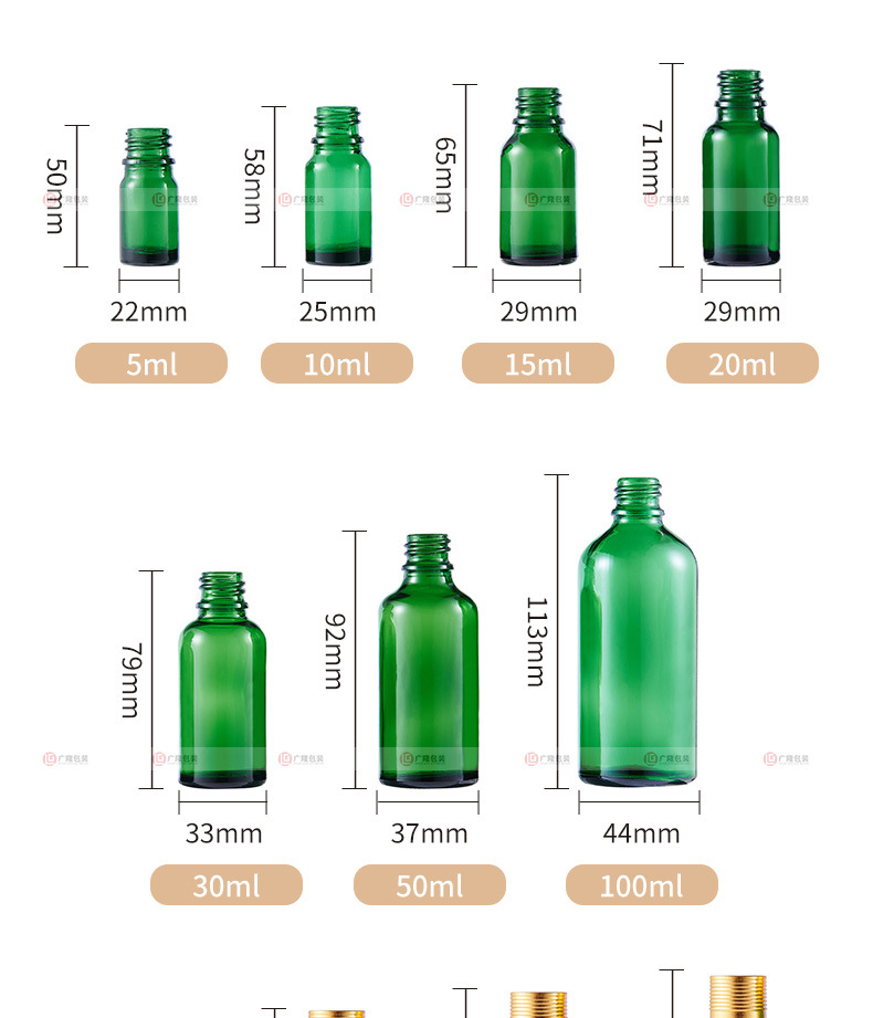 100ml (140 pieces/box), please take the whole box; green bottle + foamed glossy gold cap + non-porous concave plug; glass
