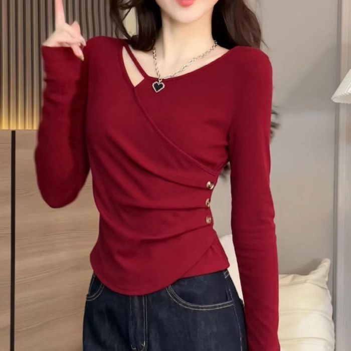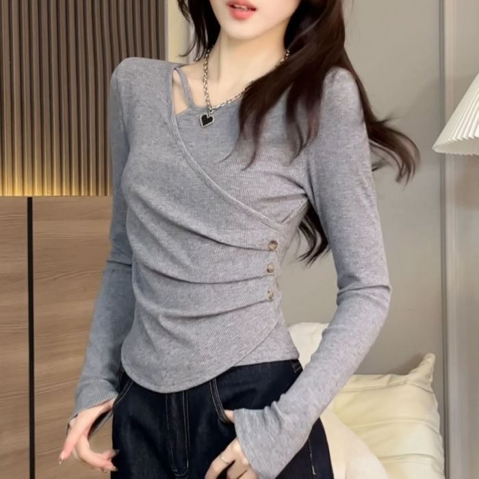 Design Sense Long-sleeved T-shirt Base Shirt Women's Spring Autumn and Winter New Waist Slim-fit Slimming plus size Styline Top Women