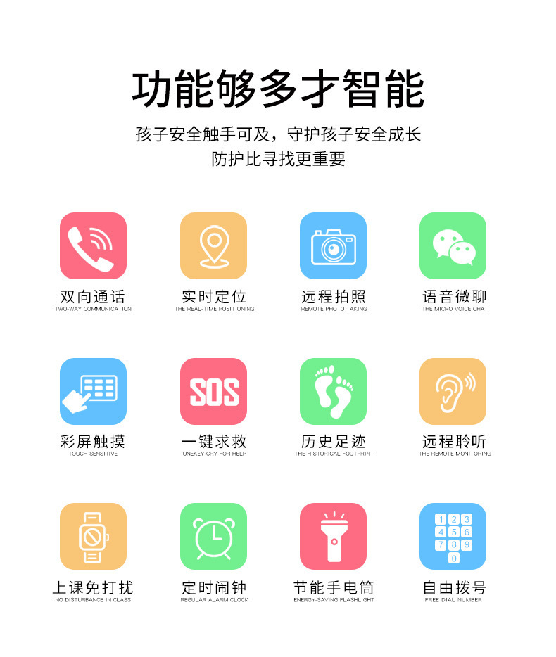 【新 款 优 势】:儿童智能手表,带有自由拔号键盘,无需存号码,可方便拔打电话。新增:闹钟功 能,和学习灯,口算题等功能。礼品、教育、银行积分兑换等行业的活动。售后率低!