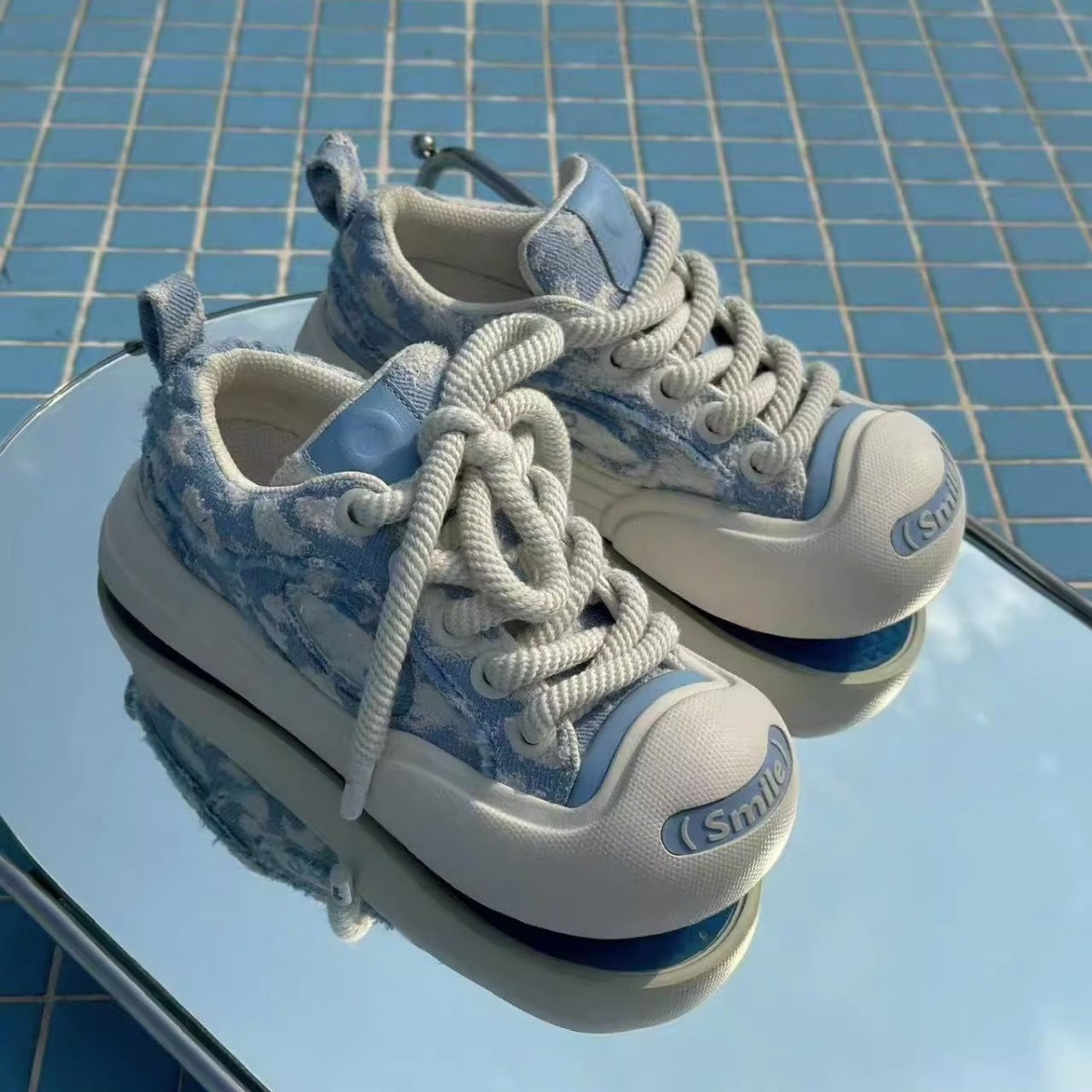 Blue with pom poms