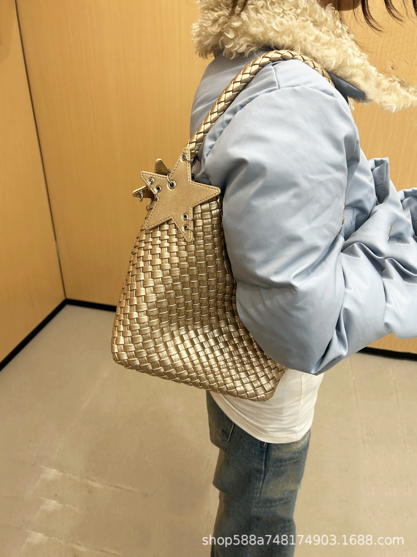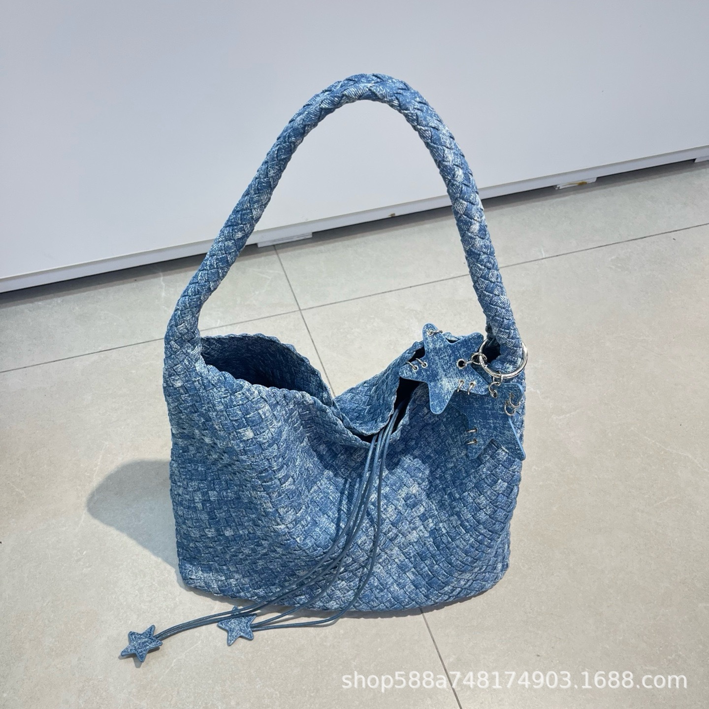 Large denim light blue + five-pointed star pendant + inner bag, high quality