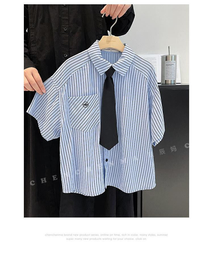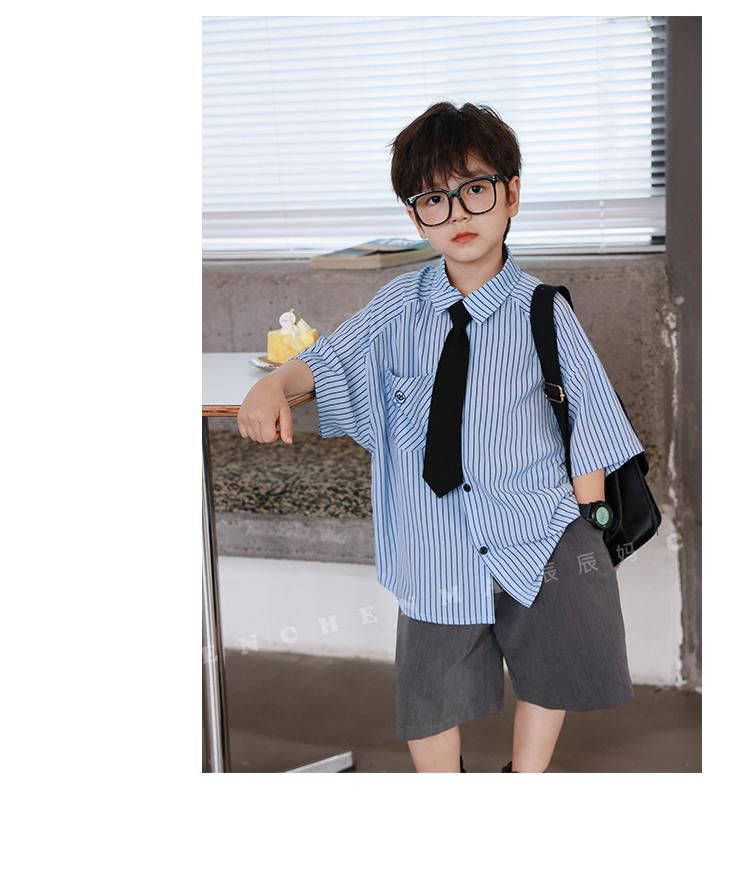 Blue stripes short-sleeved gray shorts tie, high quality anti-wrinkle and cool