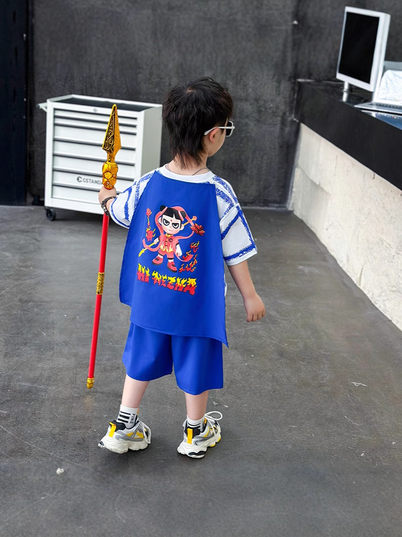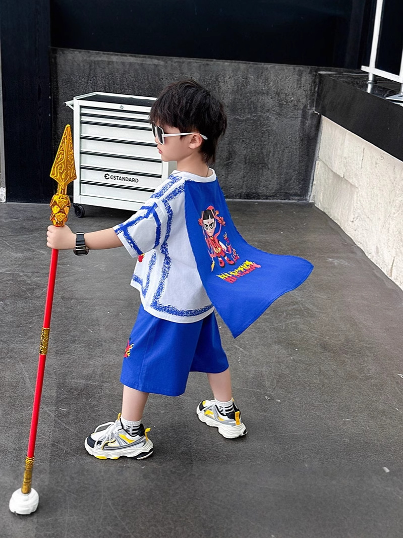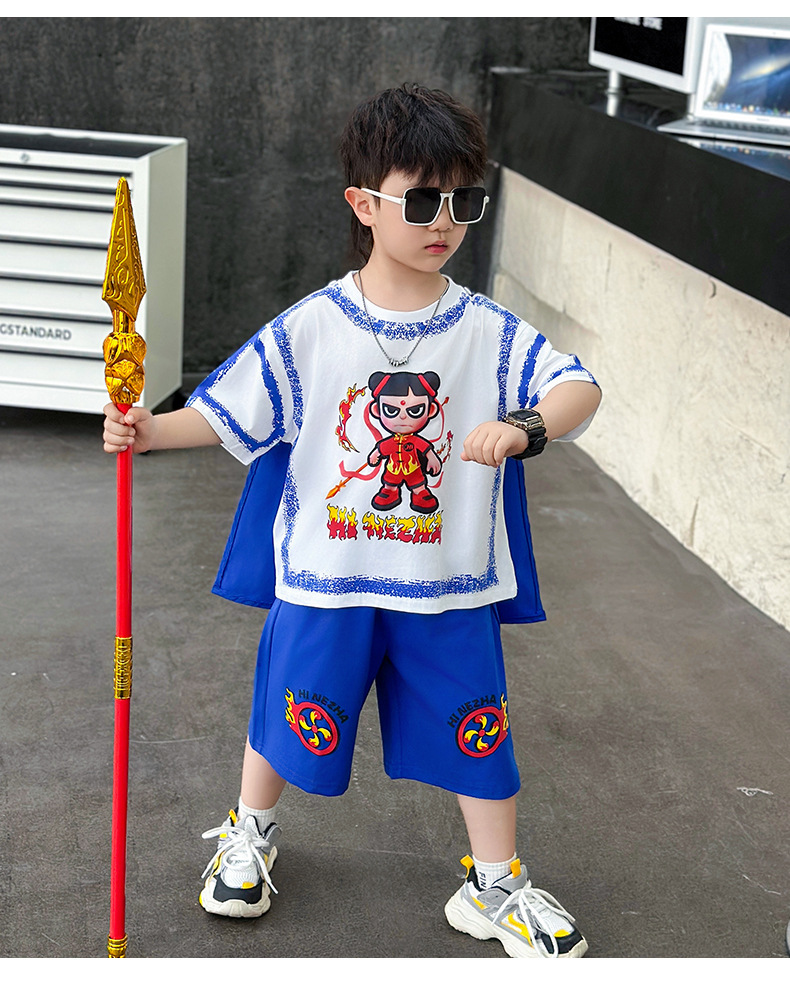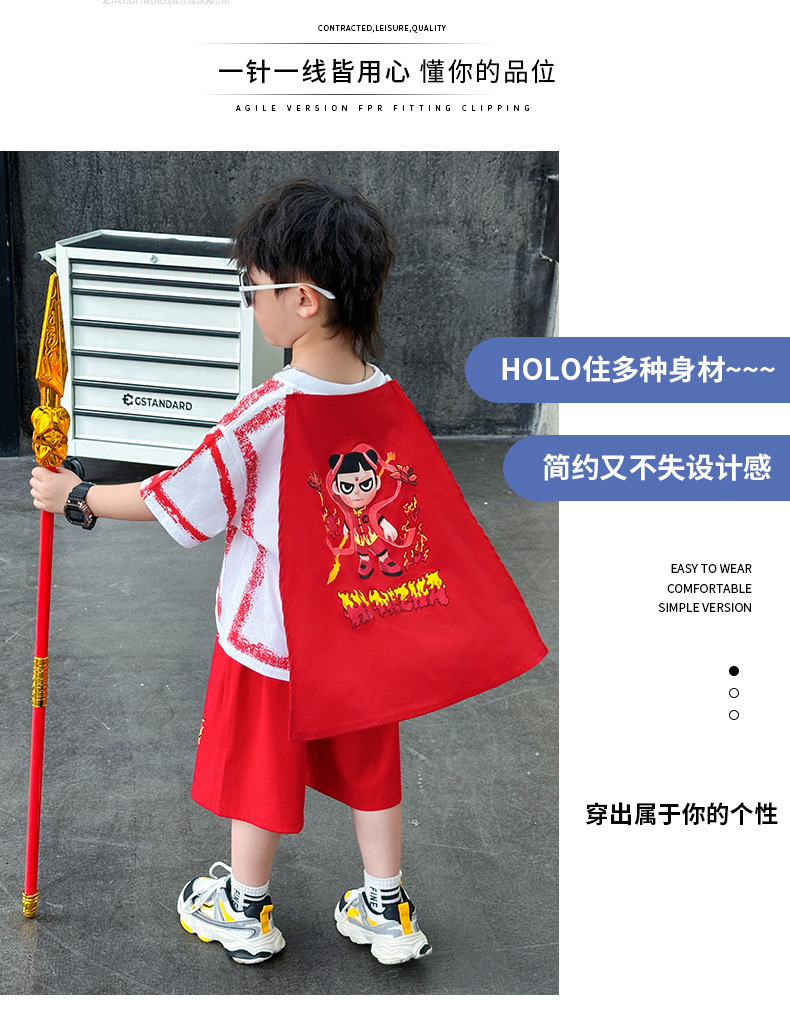 Boys' Pure Cotton Cape Nezha Summer Outfit New Stylish and Fashionable Short-Sleeve Cool Sweat-Absorbent Soft Solid Color