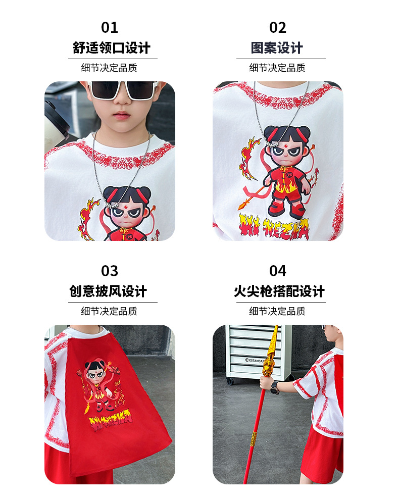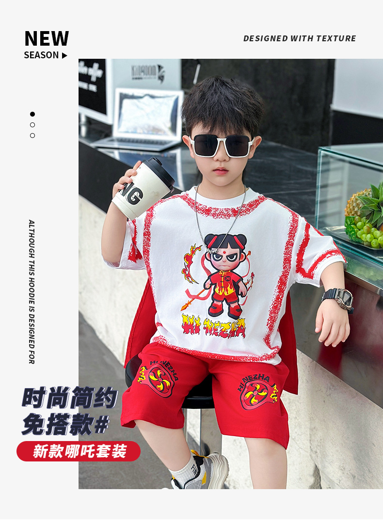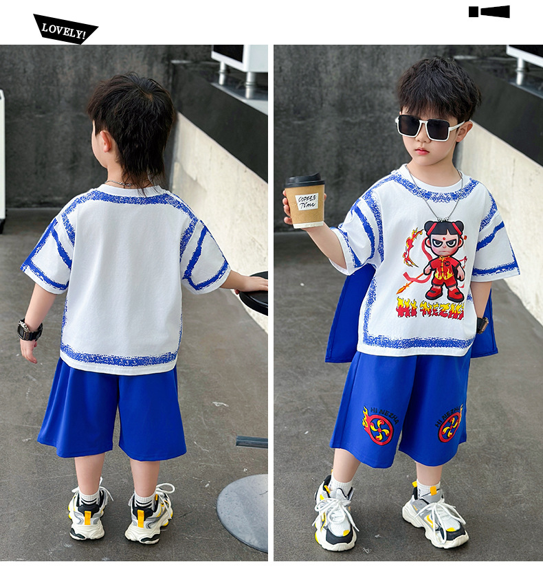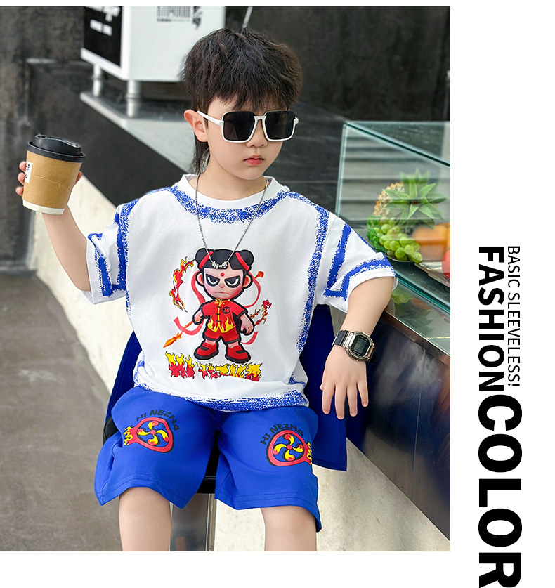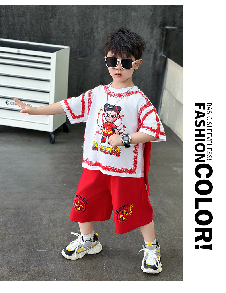 Boys' Pure Cotton Cape Nezha Summer Outfit New Stylish and Fashionable Short-Sleeve Cool Sweat-Absorbent Soft Solid Color