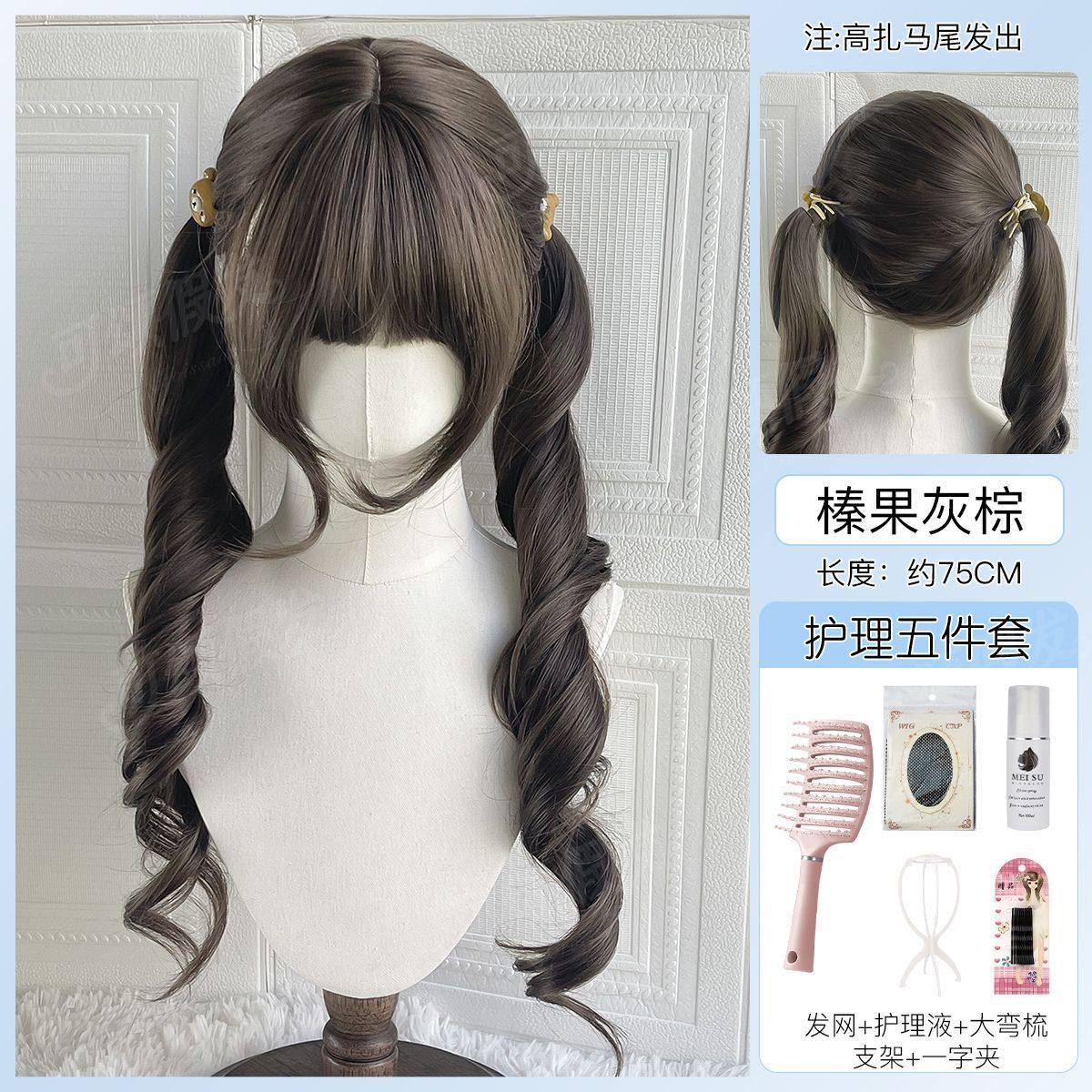 [low-tied double ponytail] hazelnut gray brown + three-piece care set