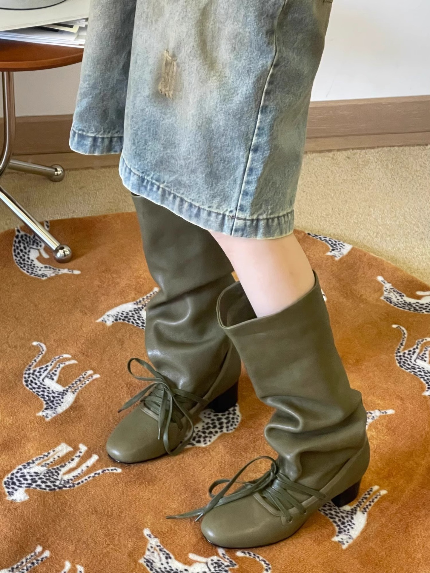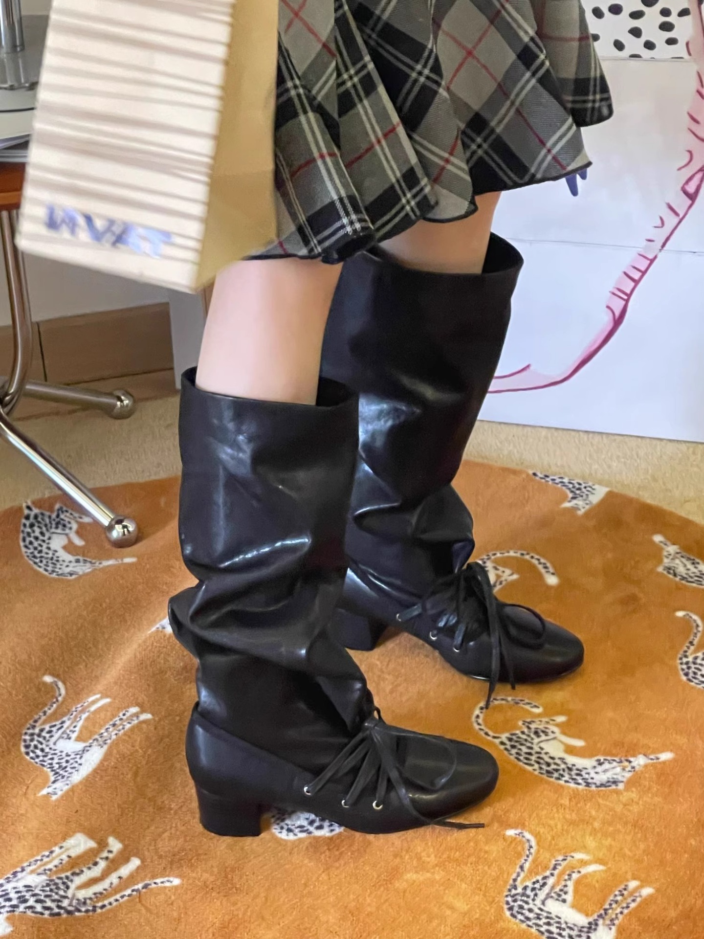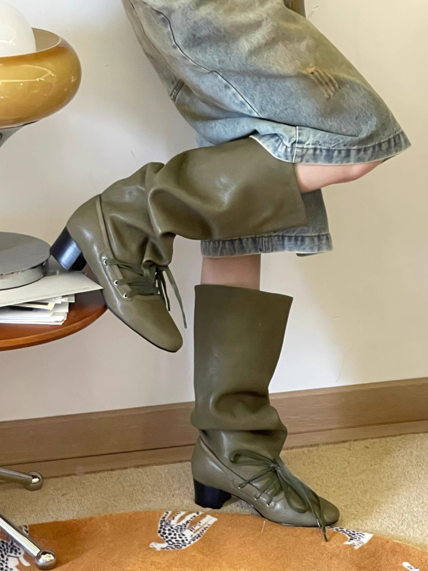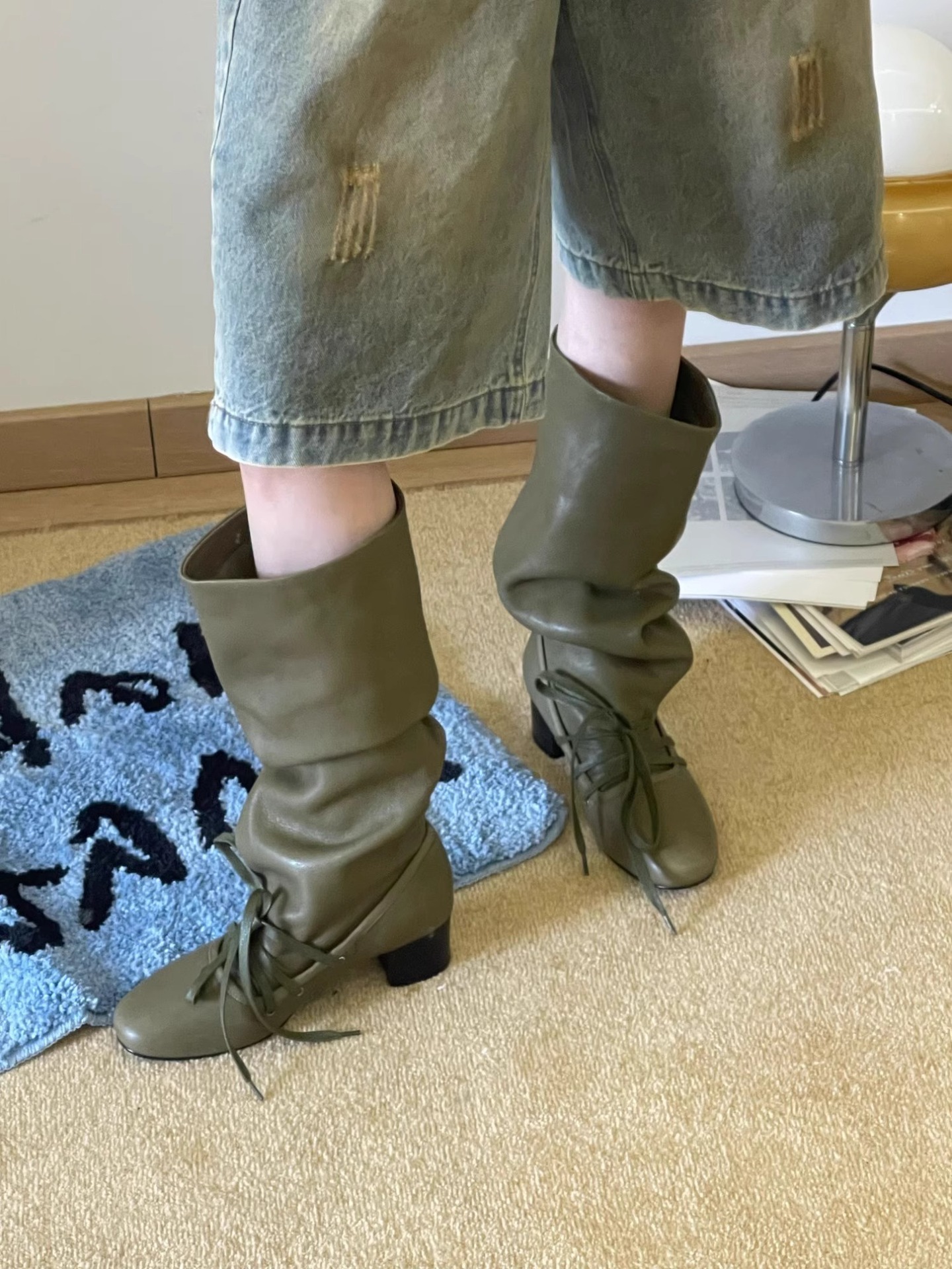 Retro Strappy New Niche Design Trouser Boots Thick Heel Thick Sole Boots No More Than Knee Pointed Toe Lace up Knight Boots