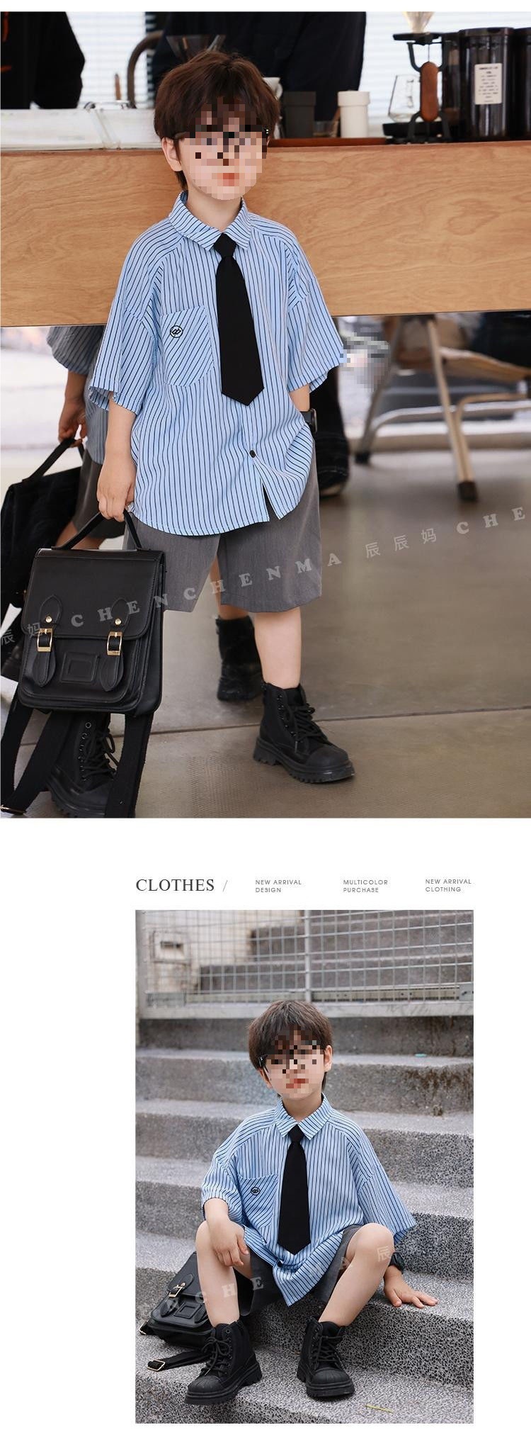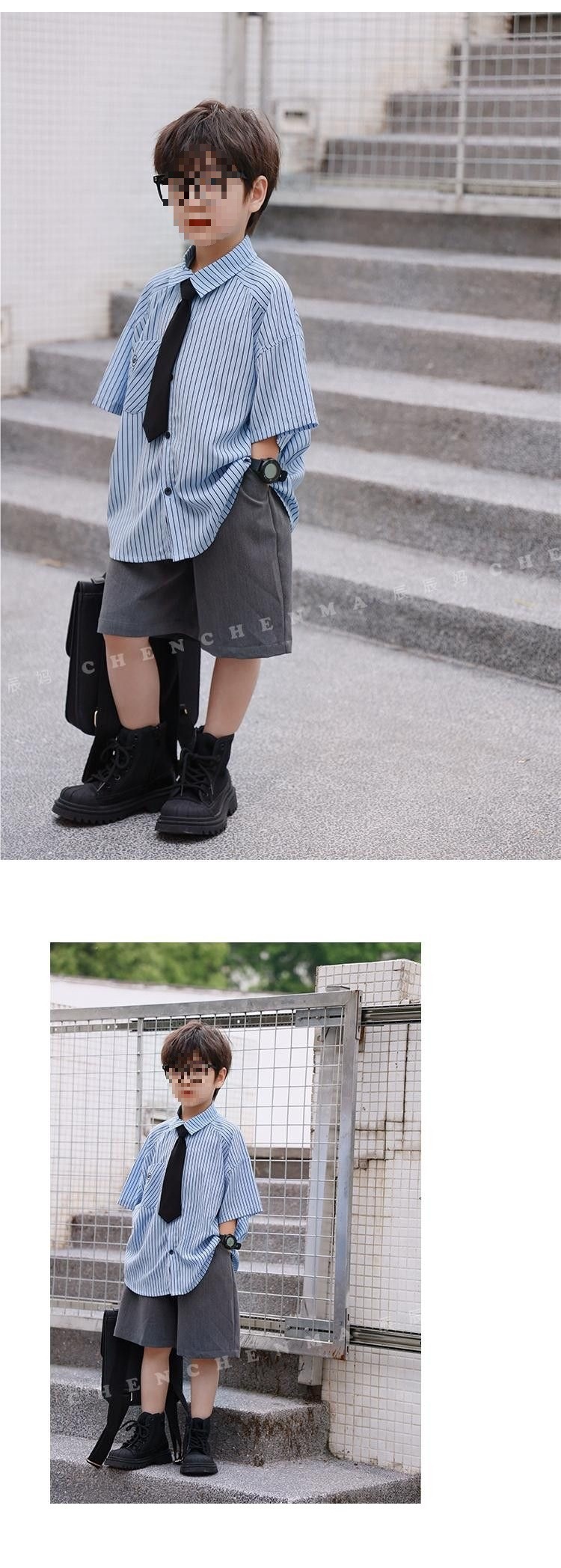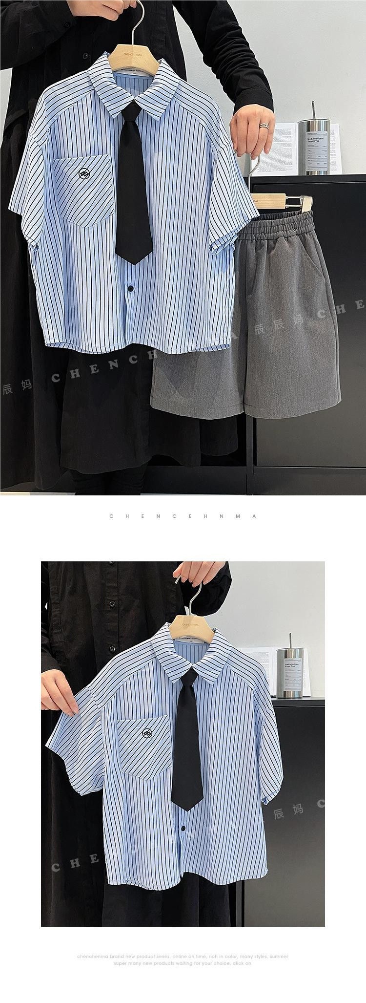 Blue stripes short-sleeved gray shorts tie, high quality anti-wrinkle and cool