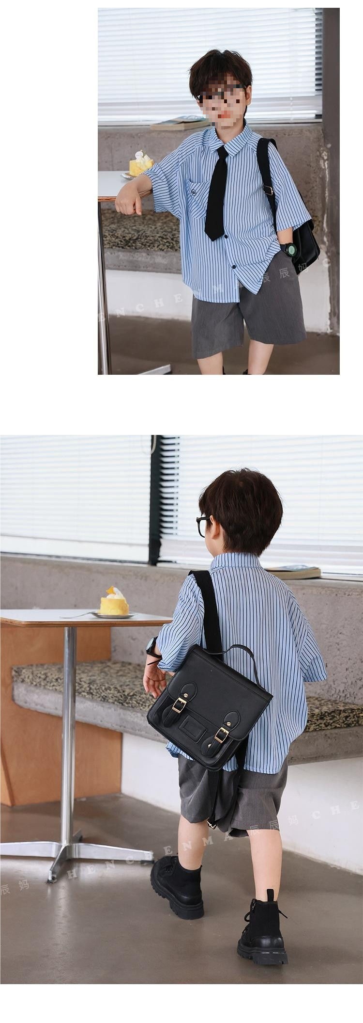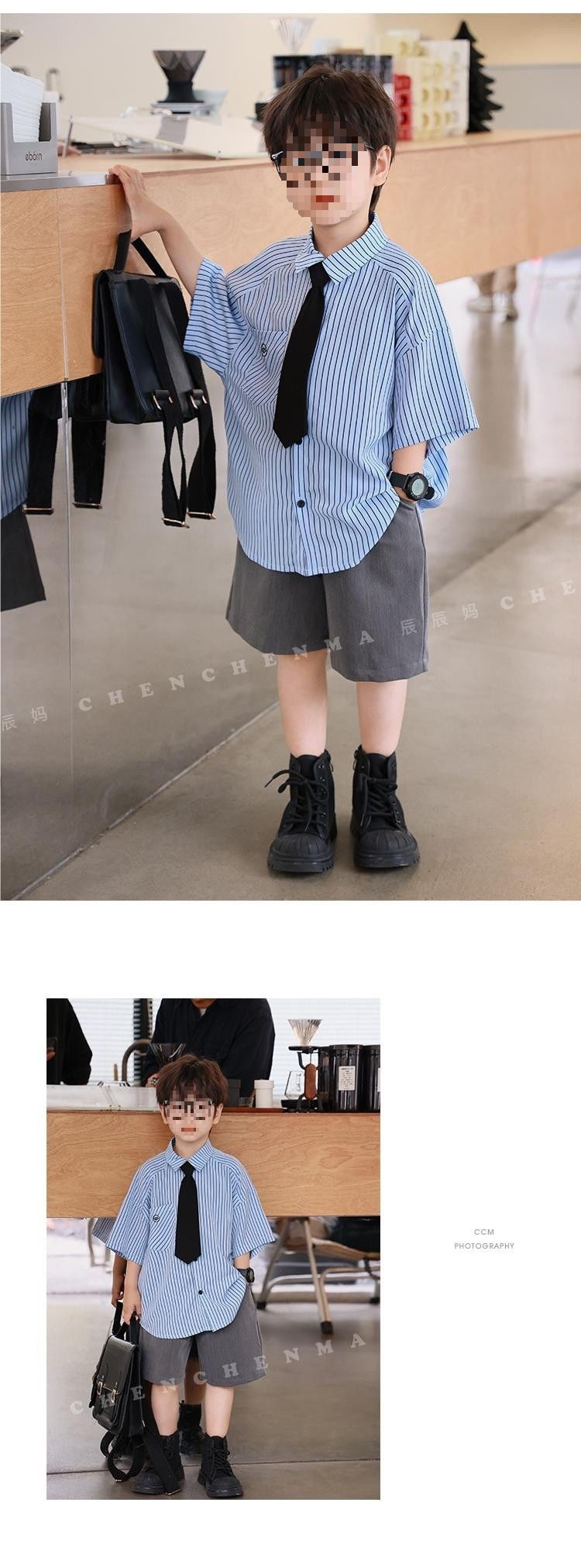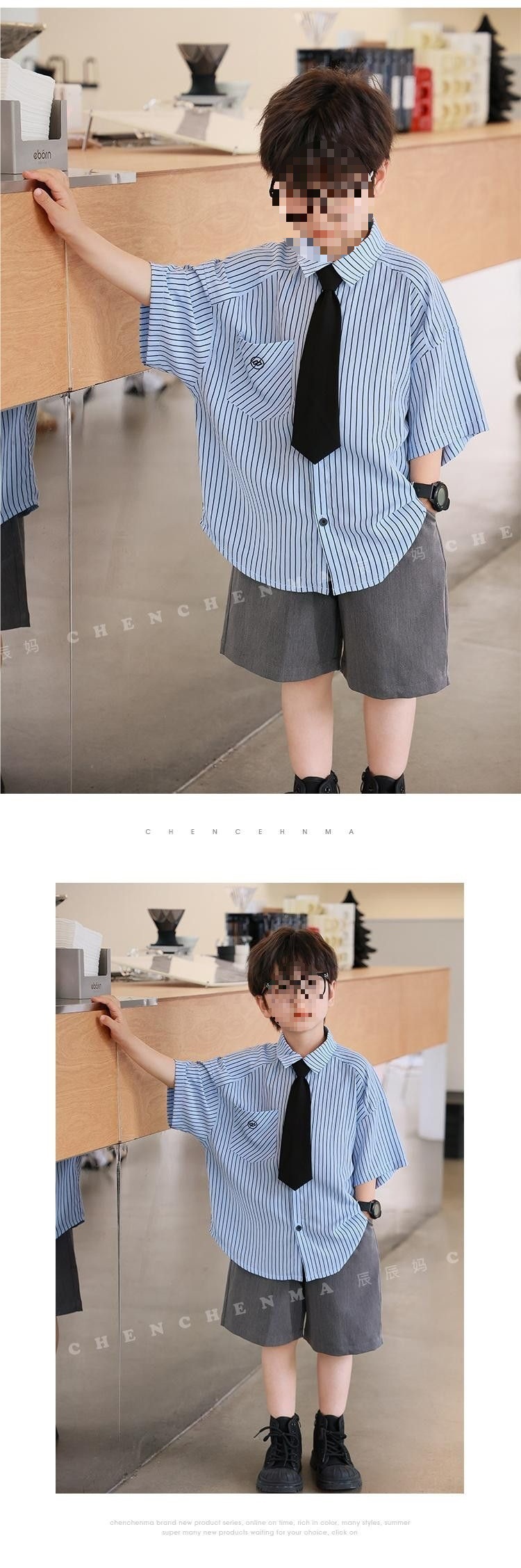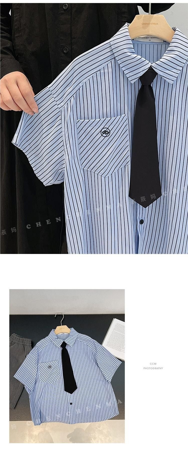 Blue stripes short-sleeved gray shorts tie, high quality anti-wrinkle and cool