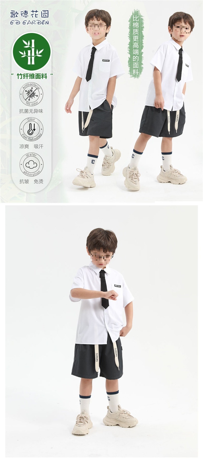 White shirt, gray shorts, tie, high quality anti-wrinkle and super cool material