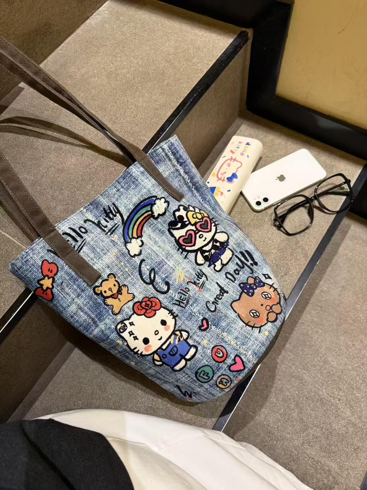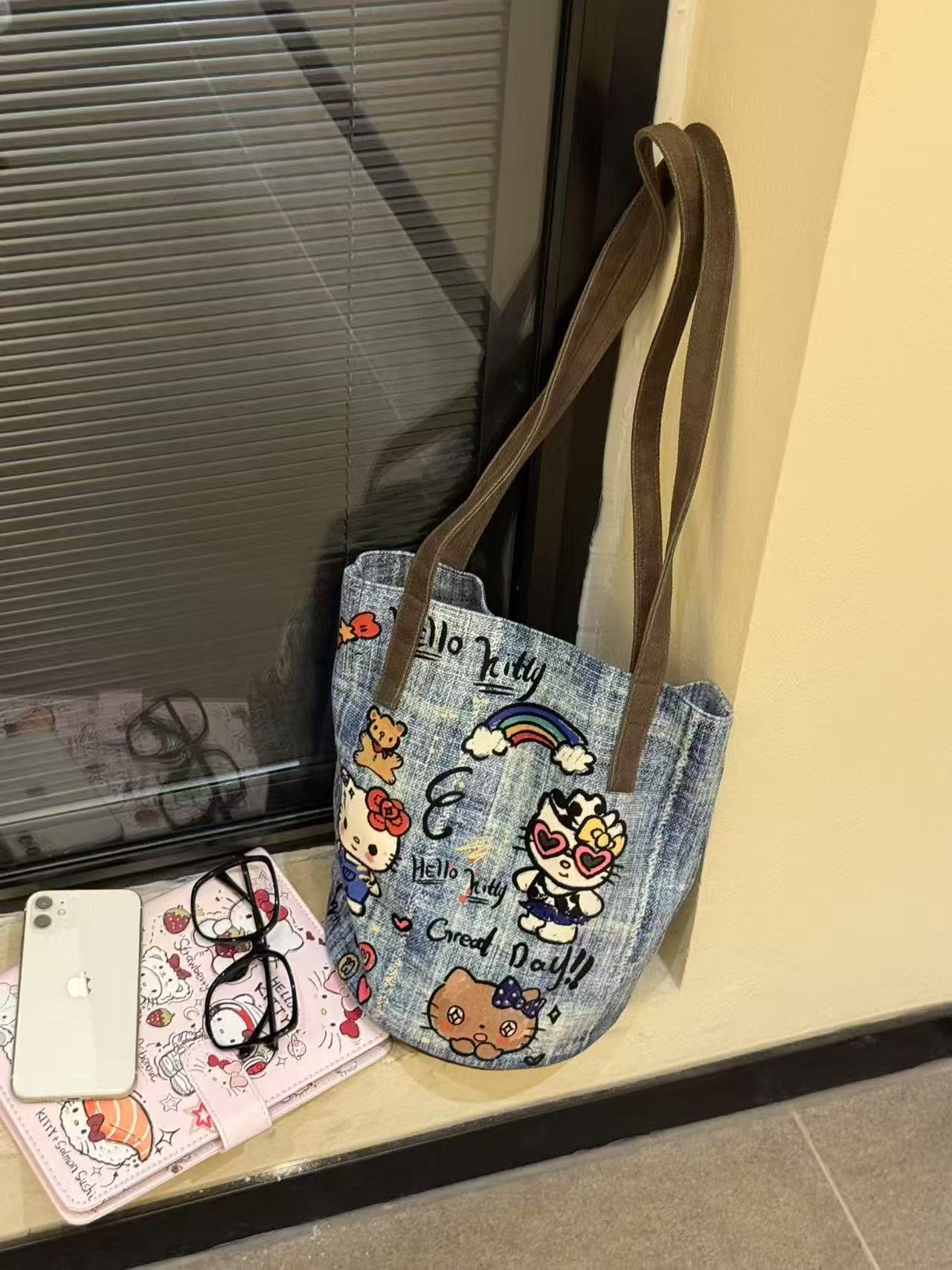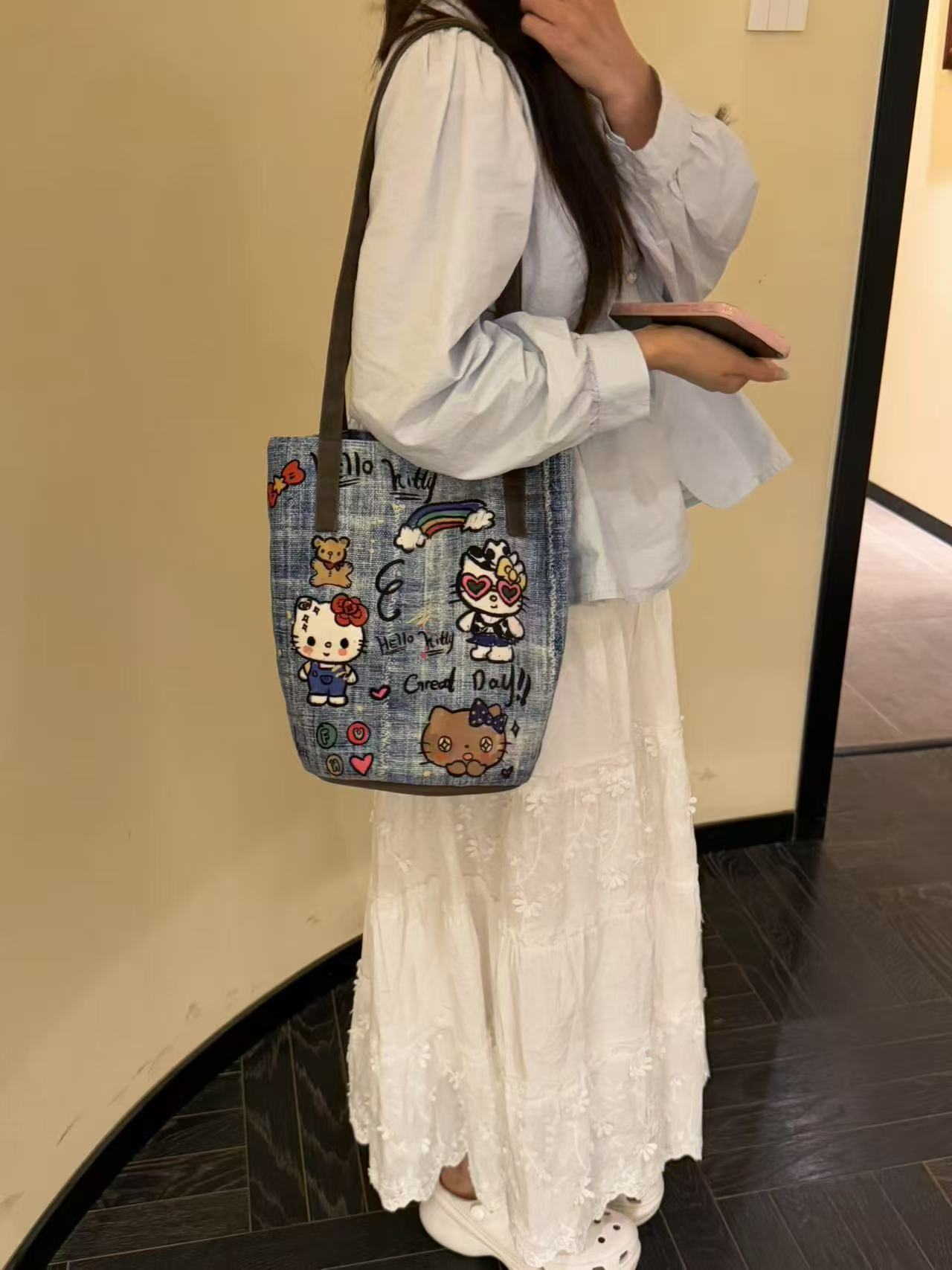 New 2025Kitty Illustration Retro Bucket Large Capacity Giant Cute Cartoon Shoulder Bucket Bag for Women