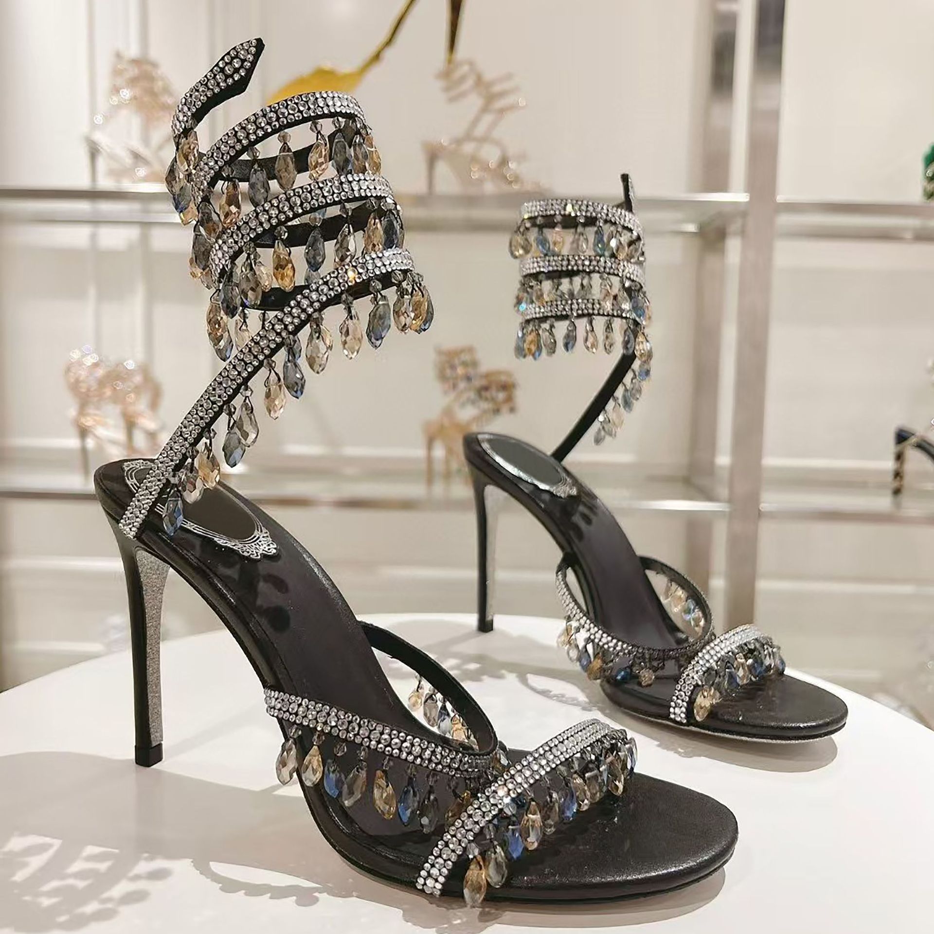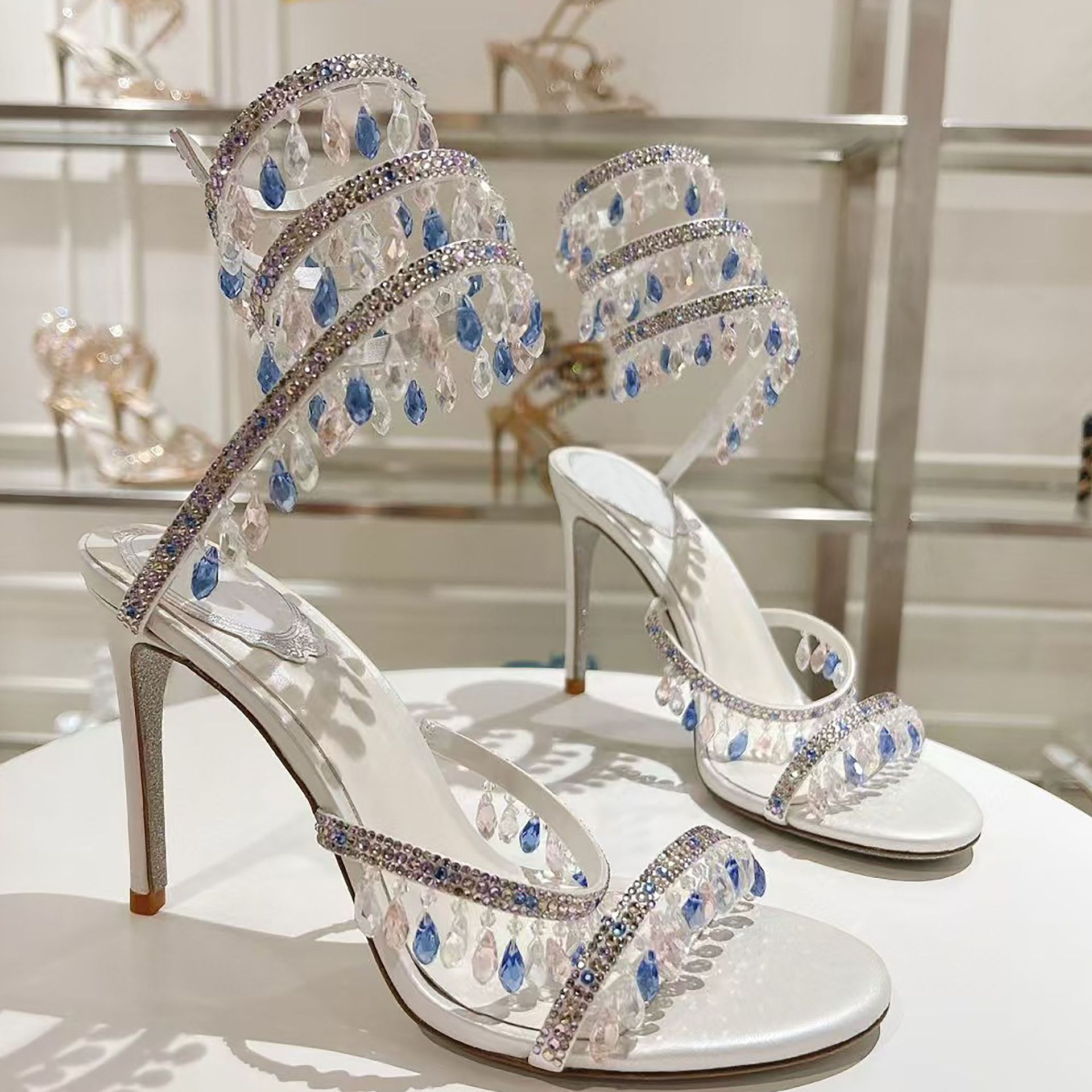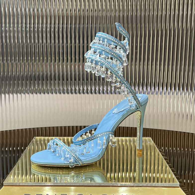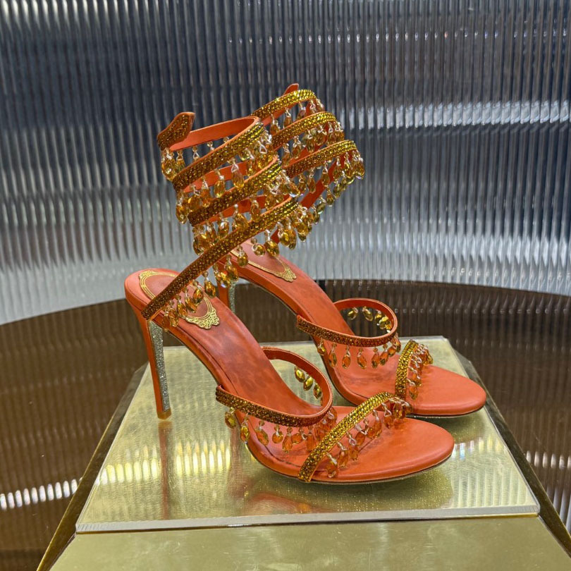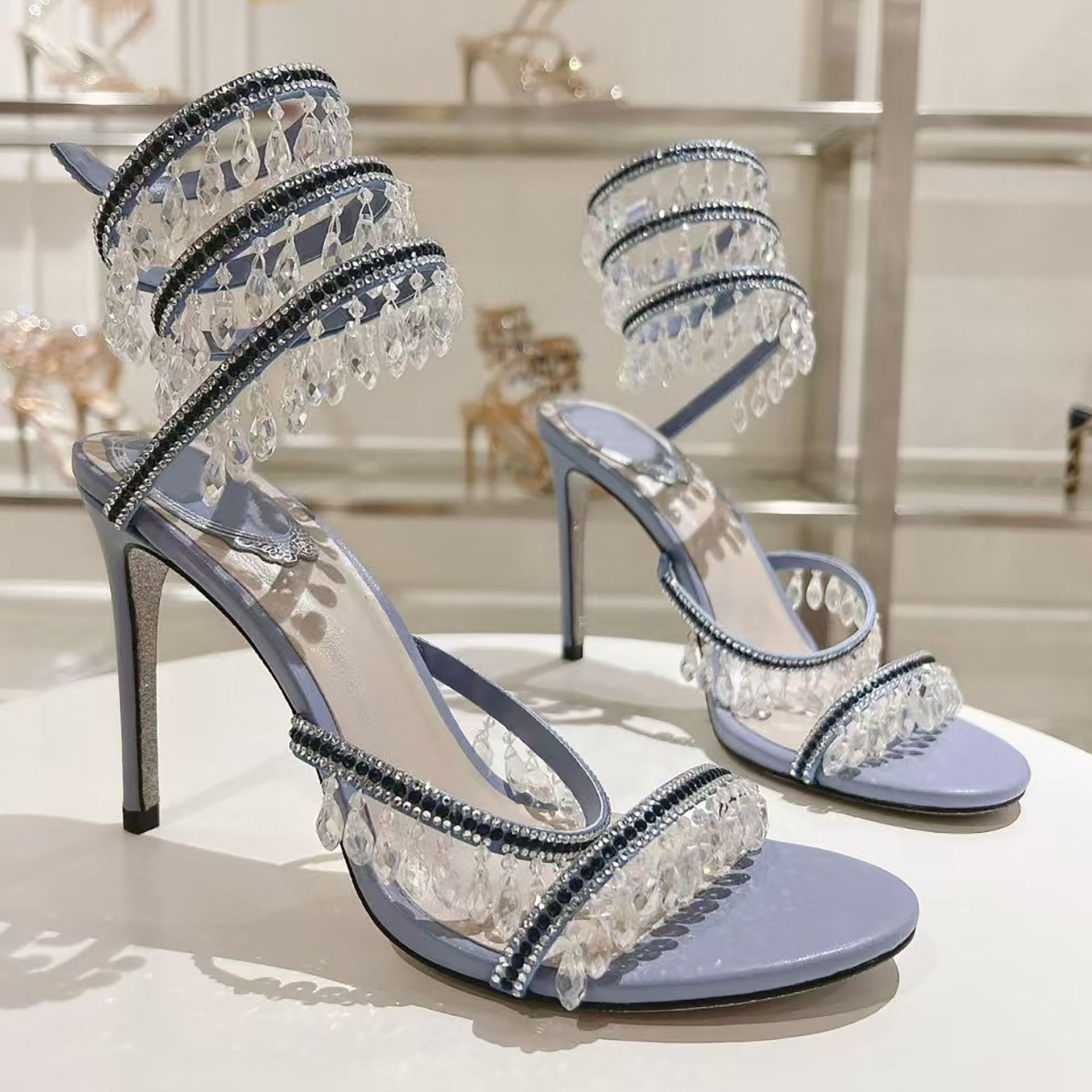 Rc Crystal Chandelier High-Heeled Sandals Fly-Shaped Winding Sexy Fashion Stiletto Dress Shoes Party Wedding 9.5cm