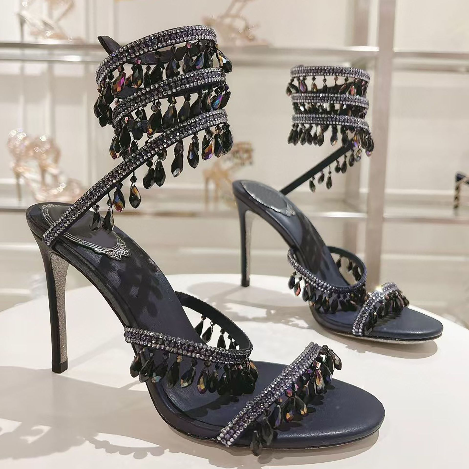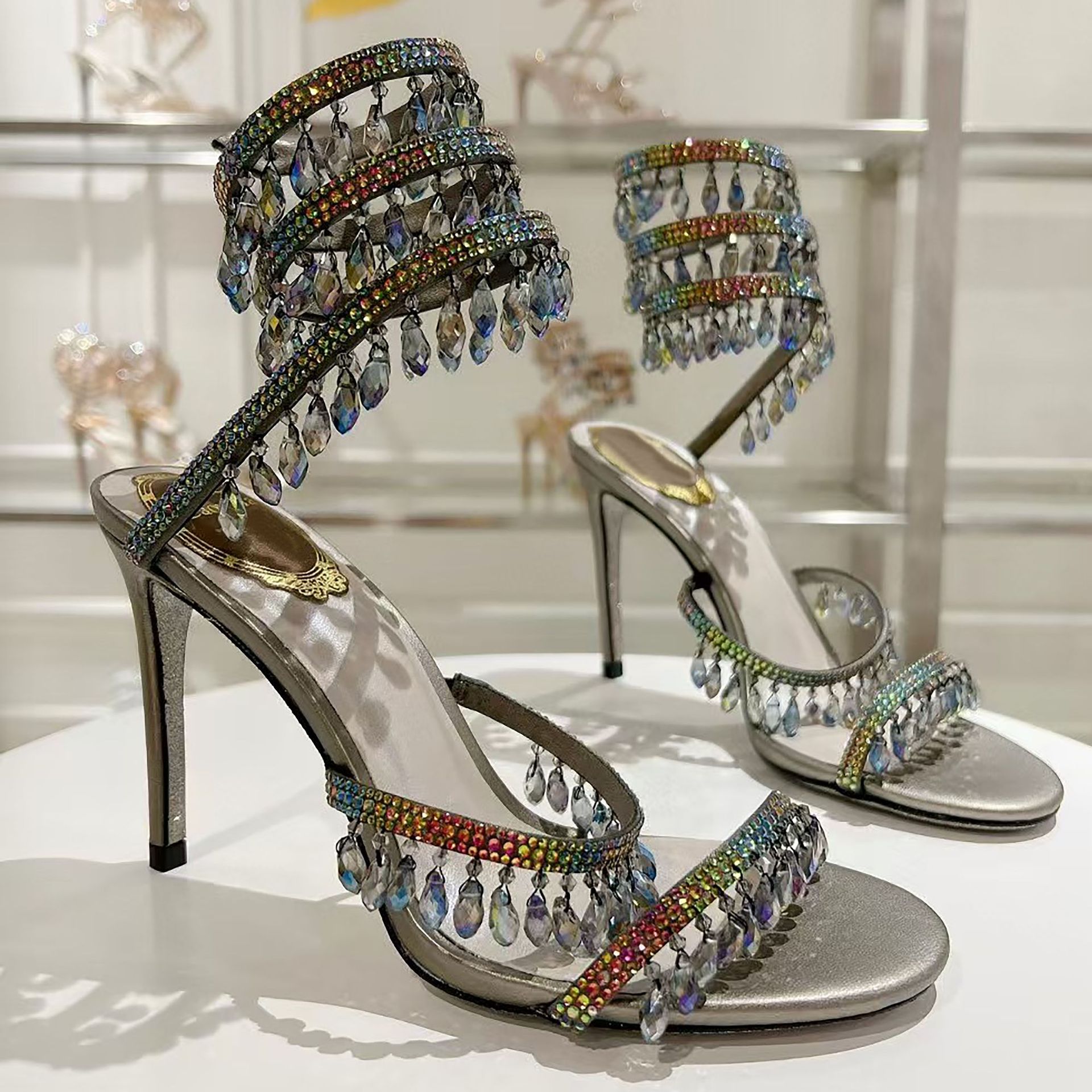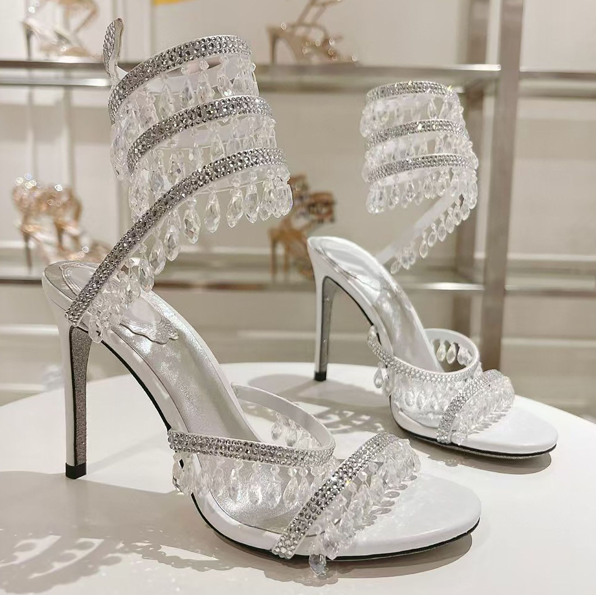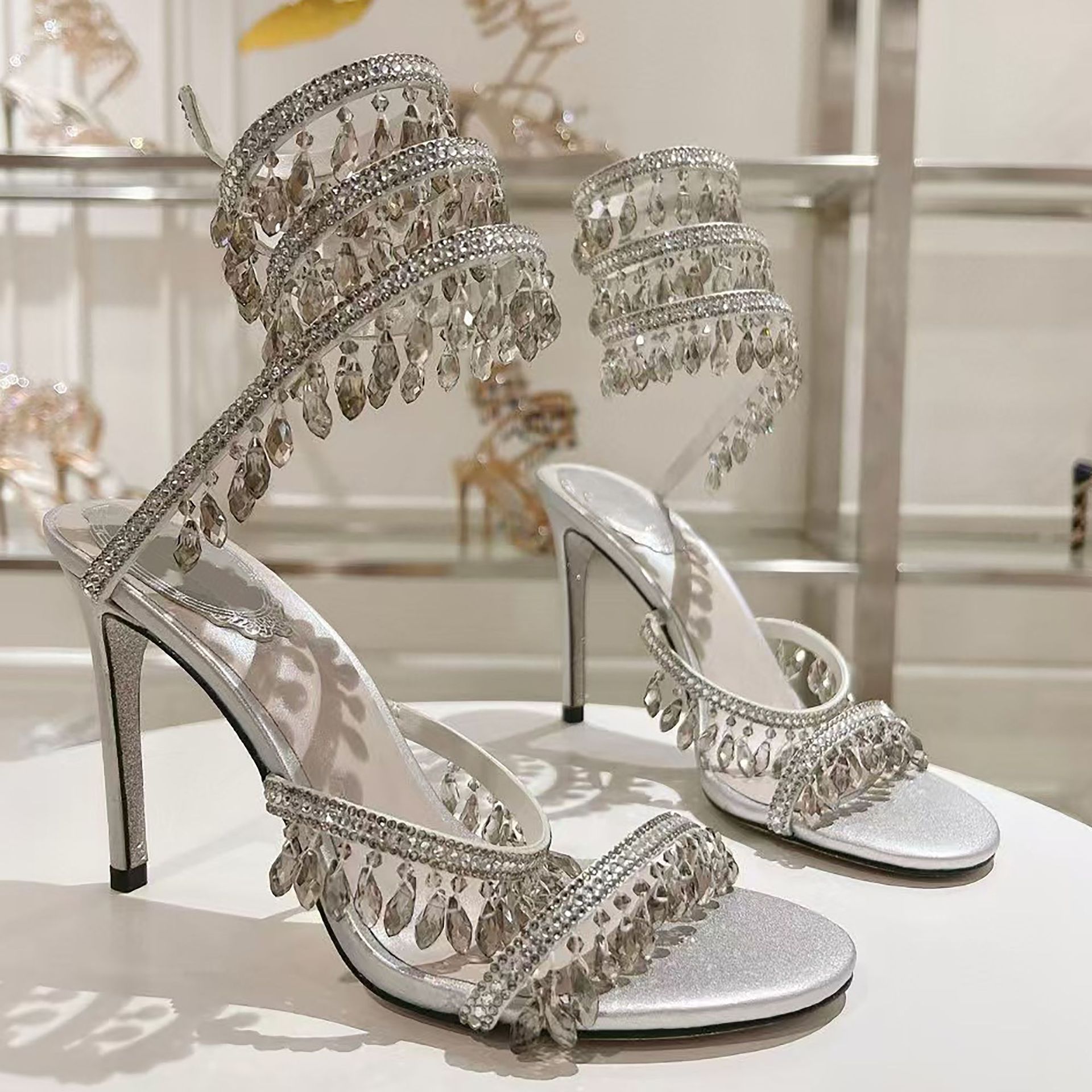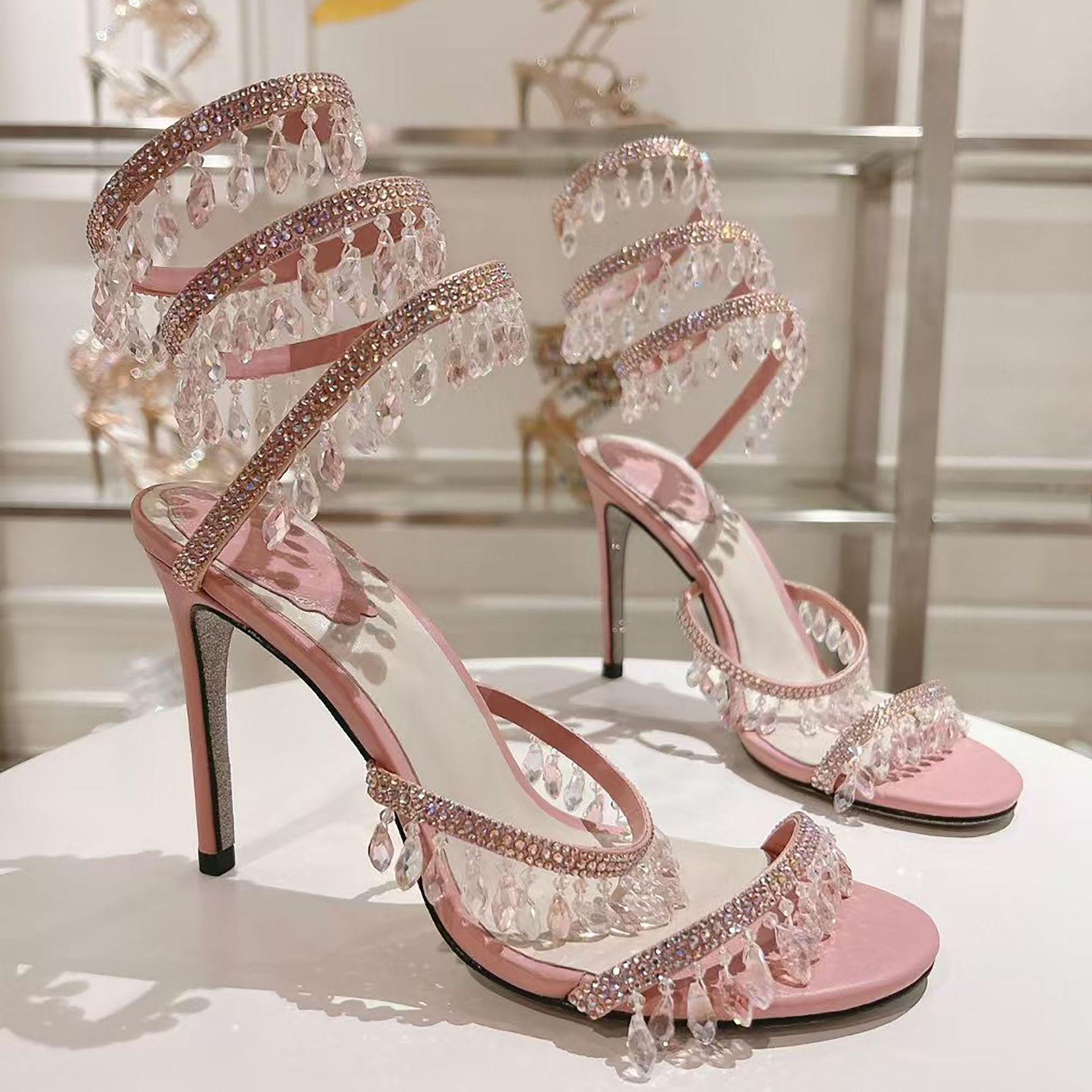 Rc Crystal Chandelier High-Heeled Sandals Fly-Shaped Winding Sexy Fashion Stiletto Dress Shoes Party Wedding 9.5cm