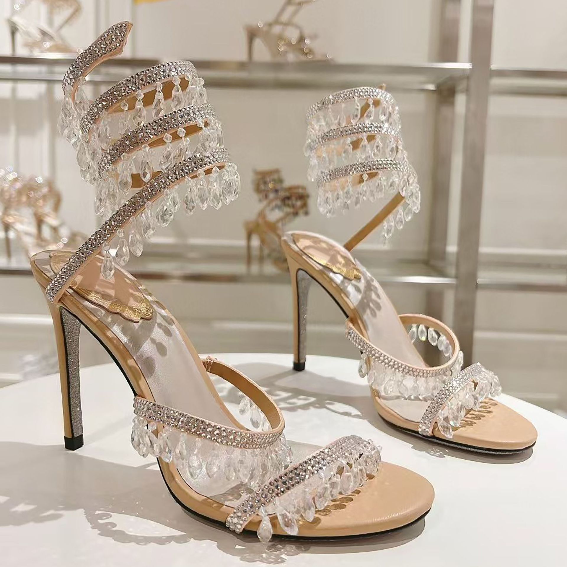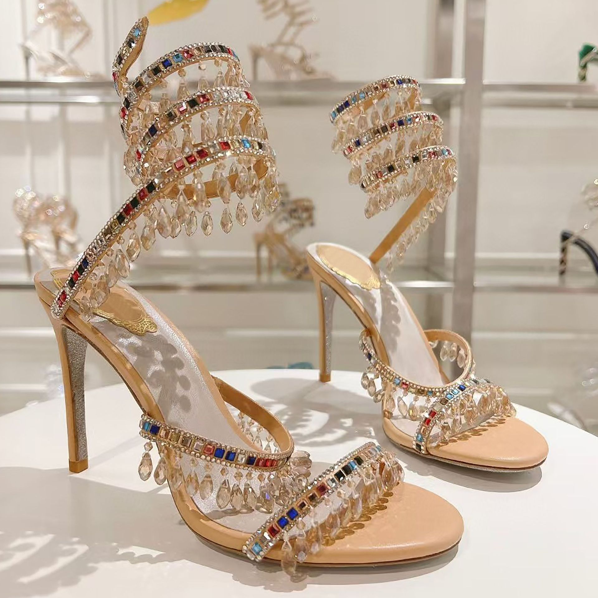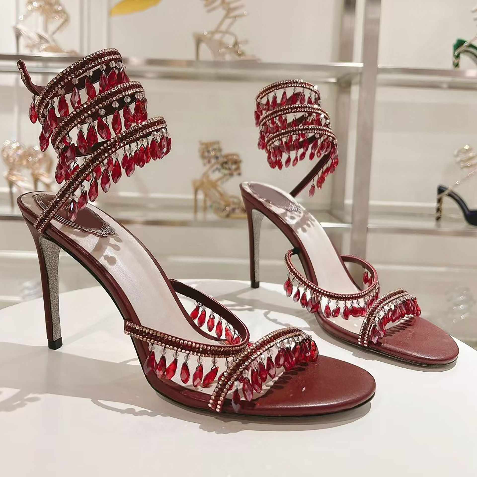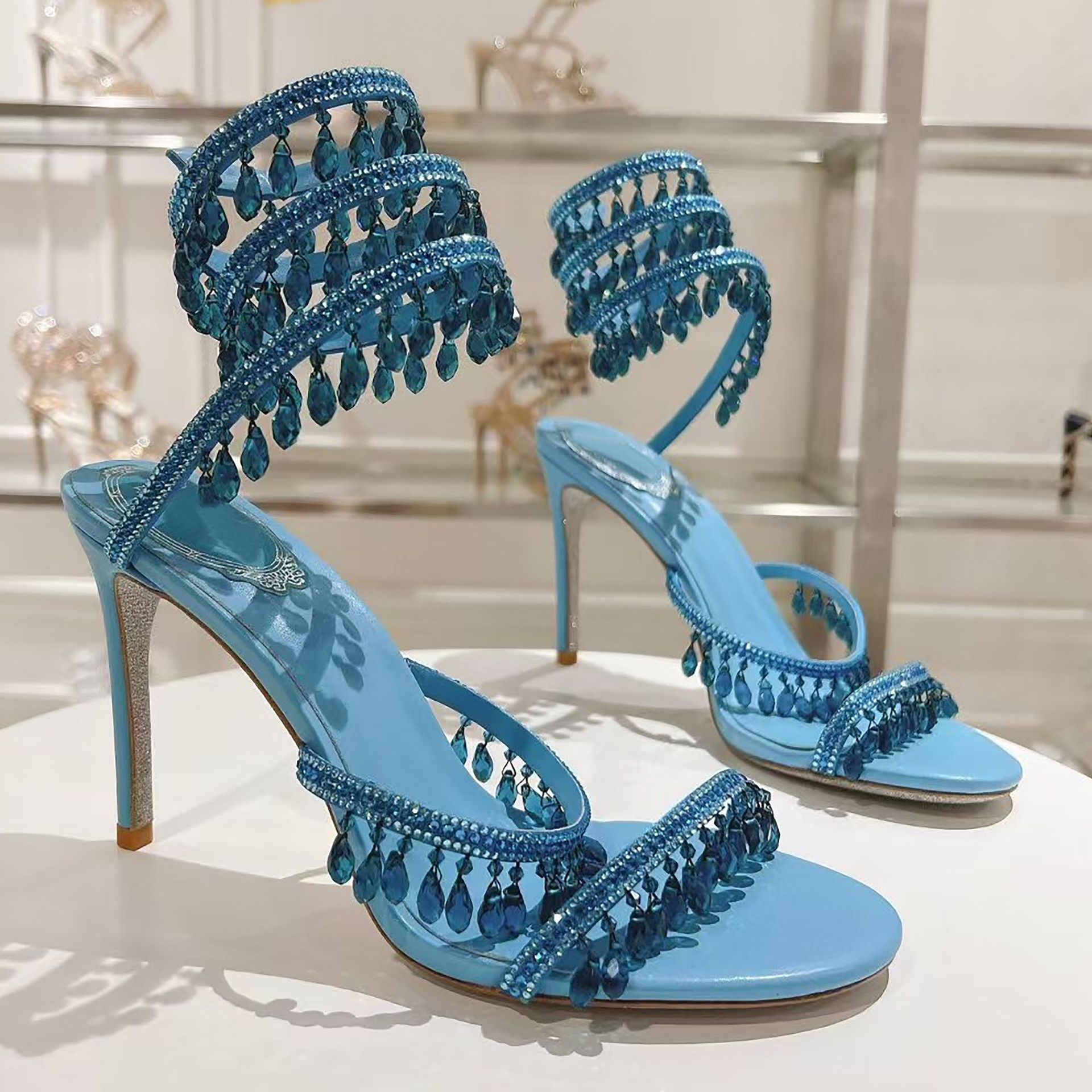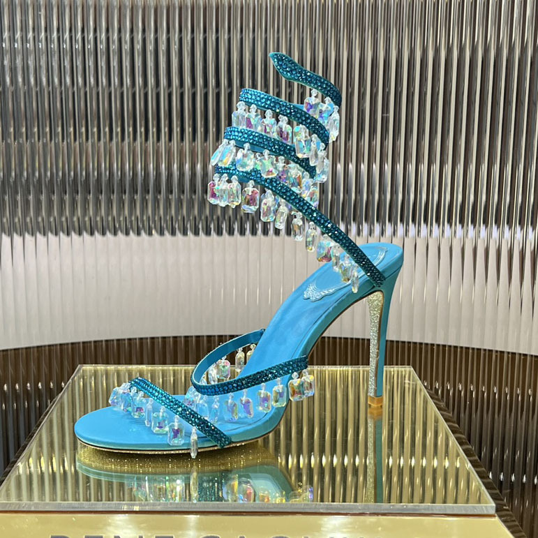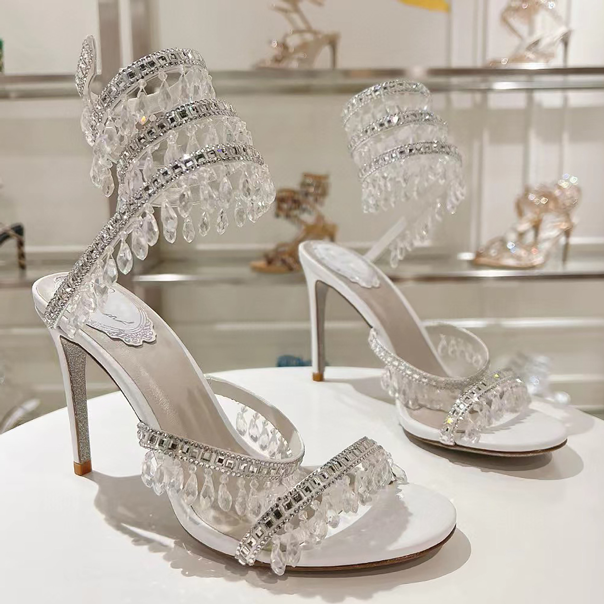 Rc Crystal Chandelier High-Heeled Sandals Fly-Shaped Winding Sexy Fashion Stiletto Dress Shoes Party Wedding 9.5cm