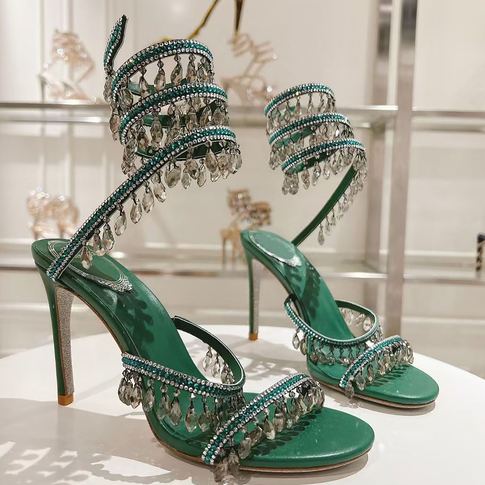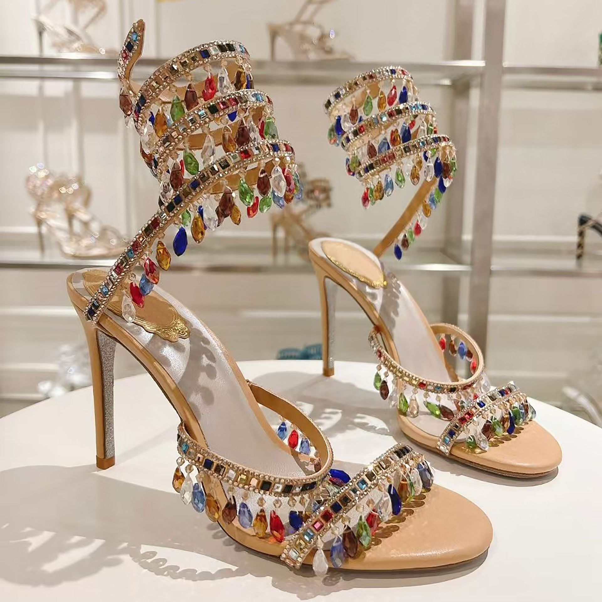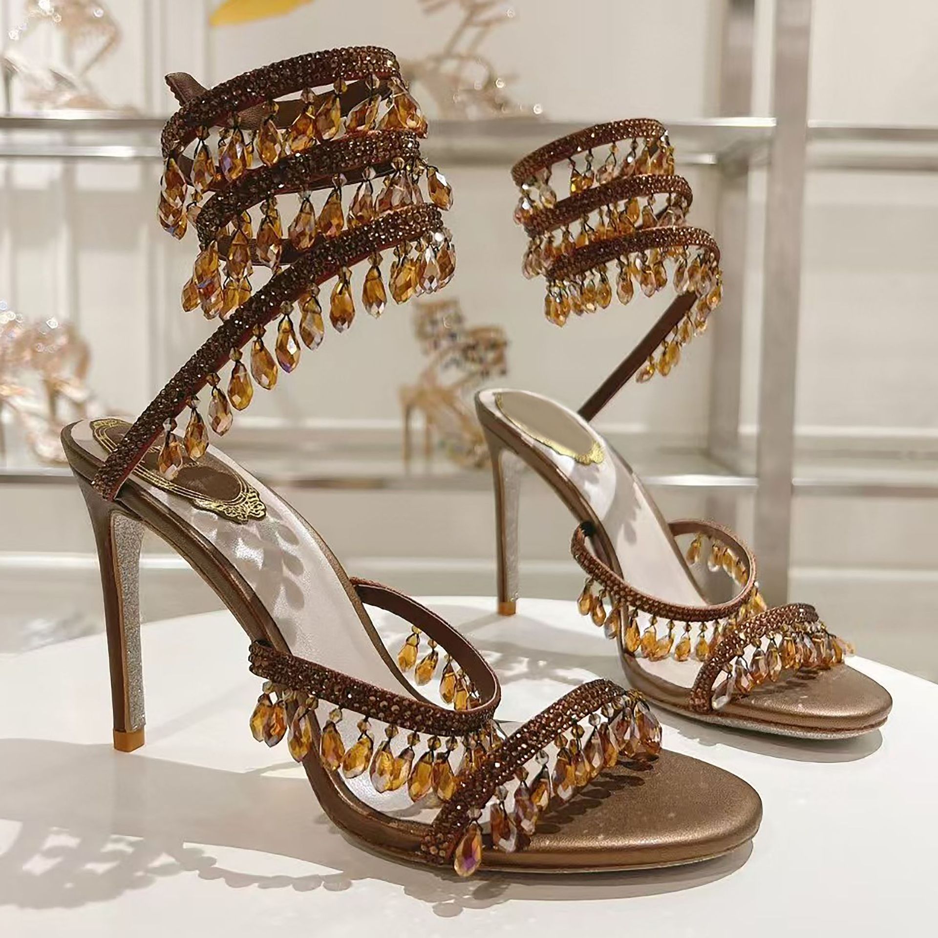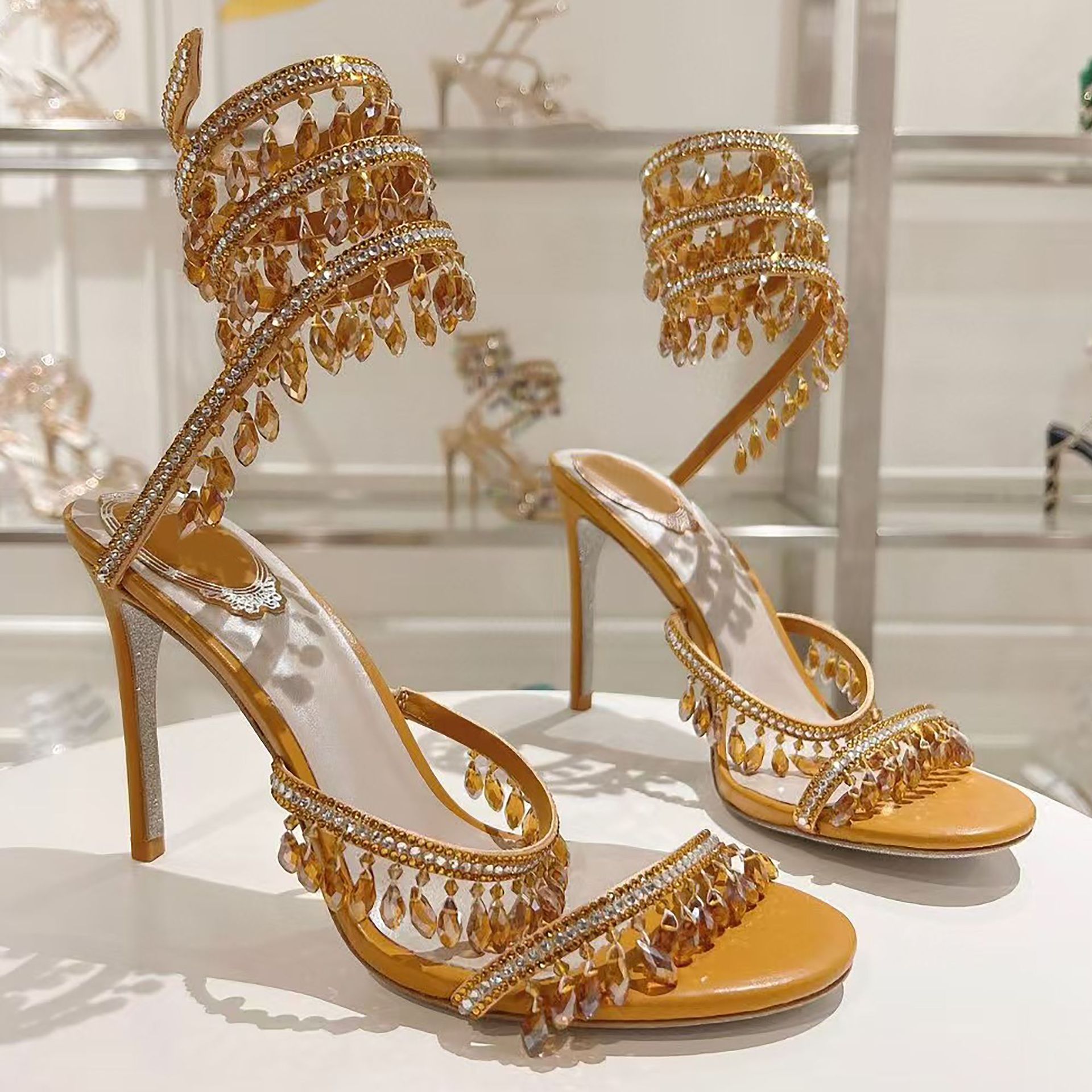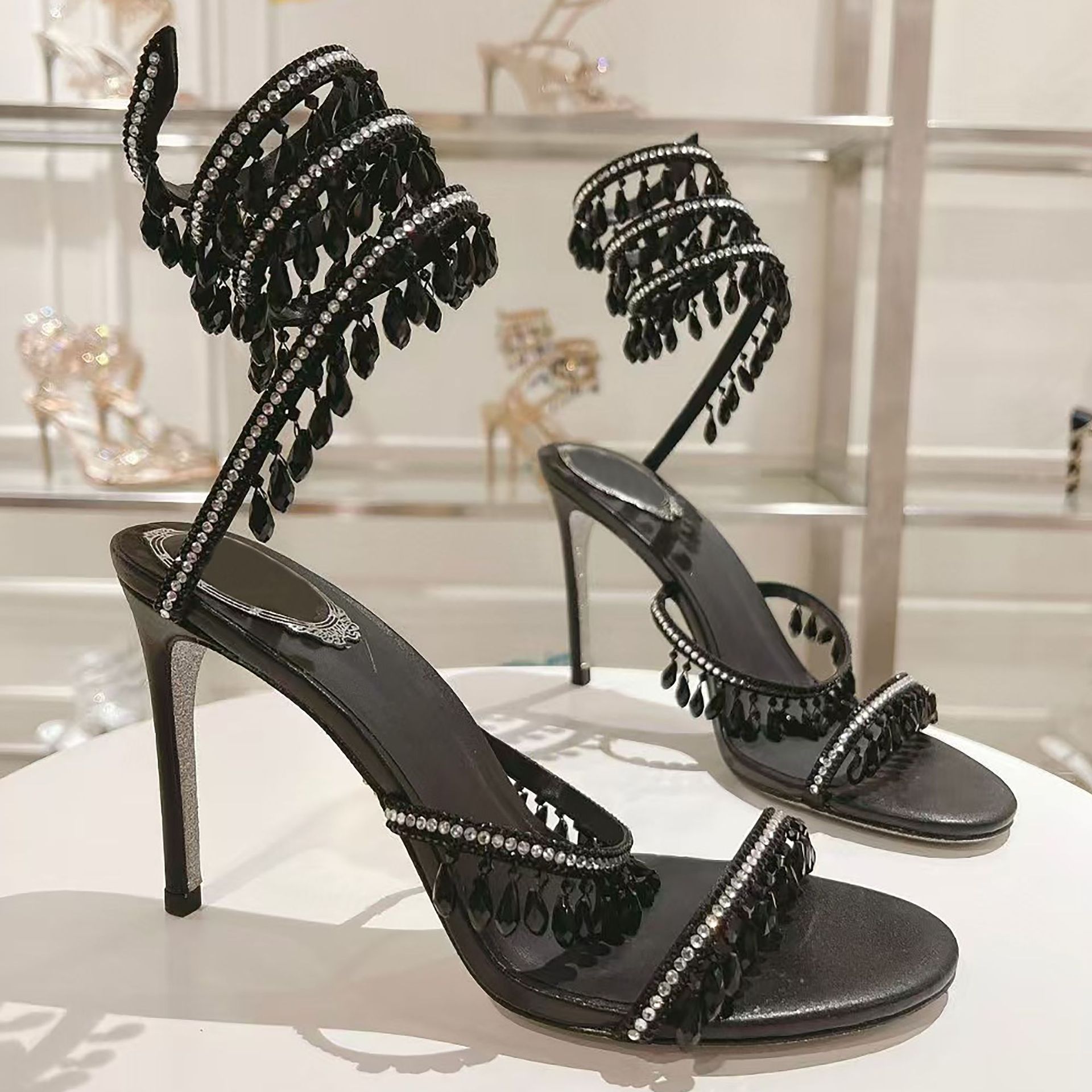 Rc Crystal Chandelier High-Heeled Sandals Fly-Shaped Winding Sexy Fashion Stiletto Dress Shoes Party Wedding 9.5cm