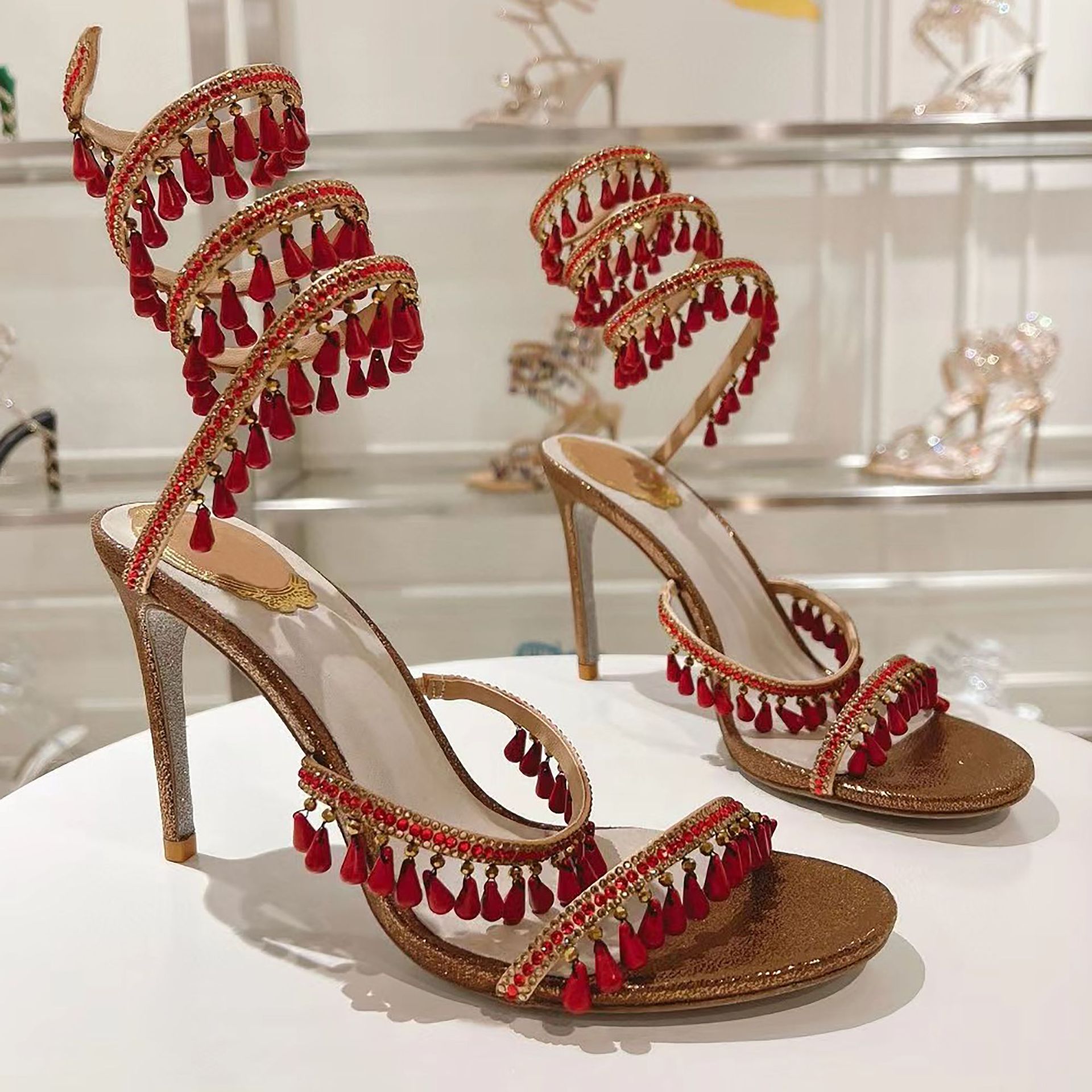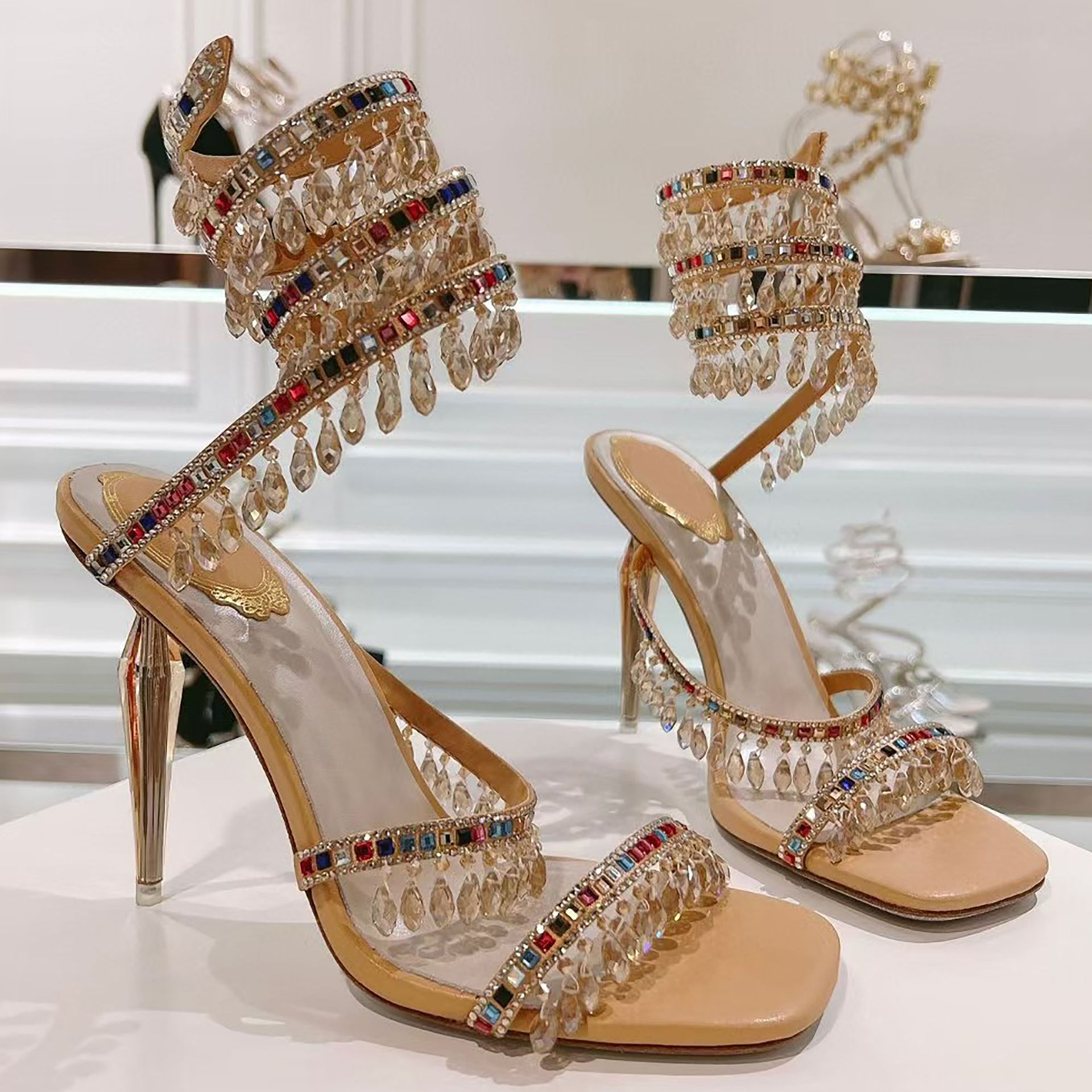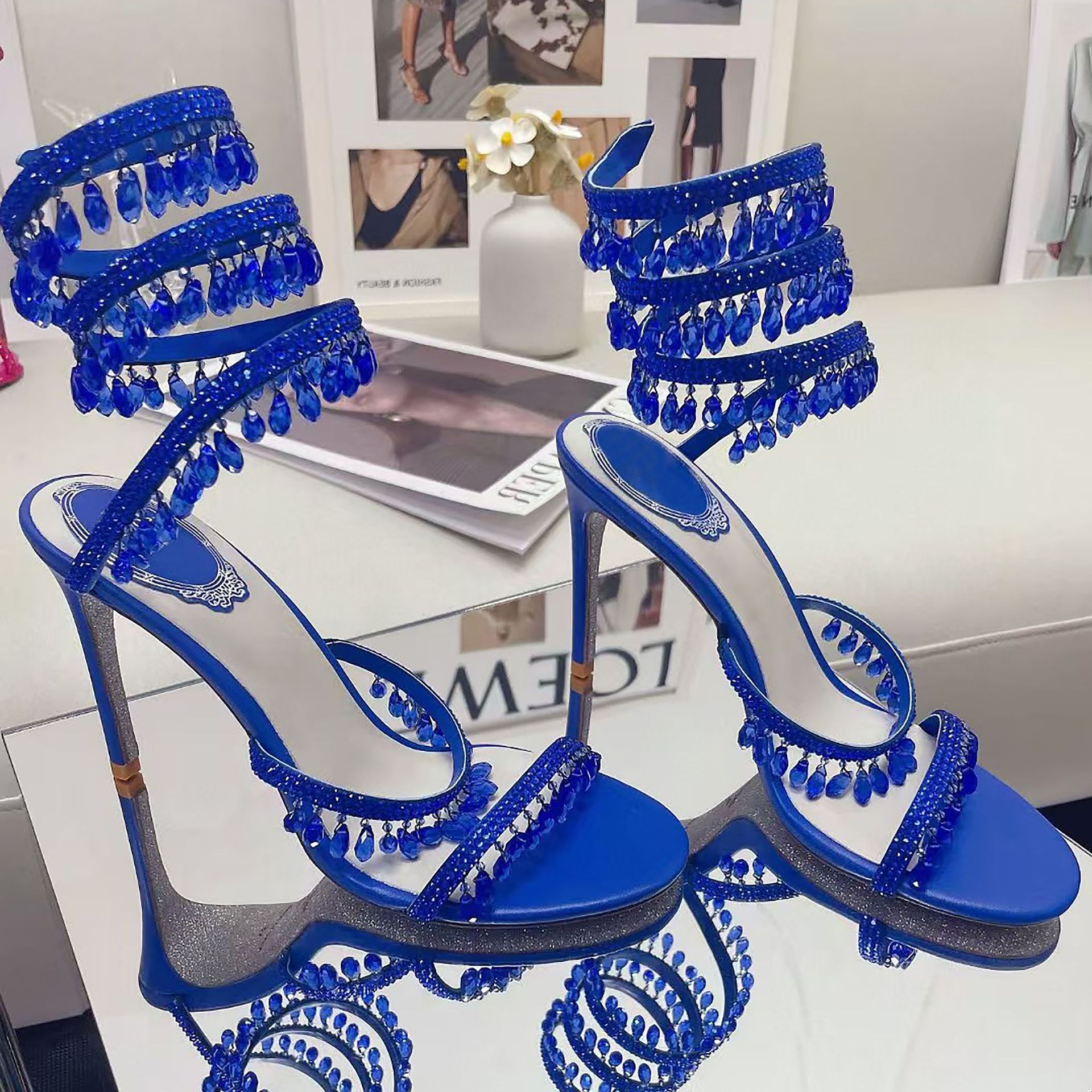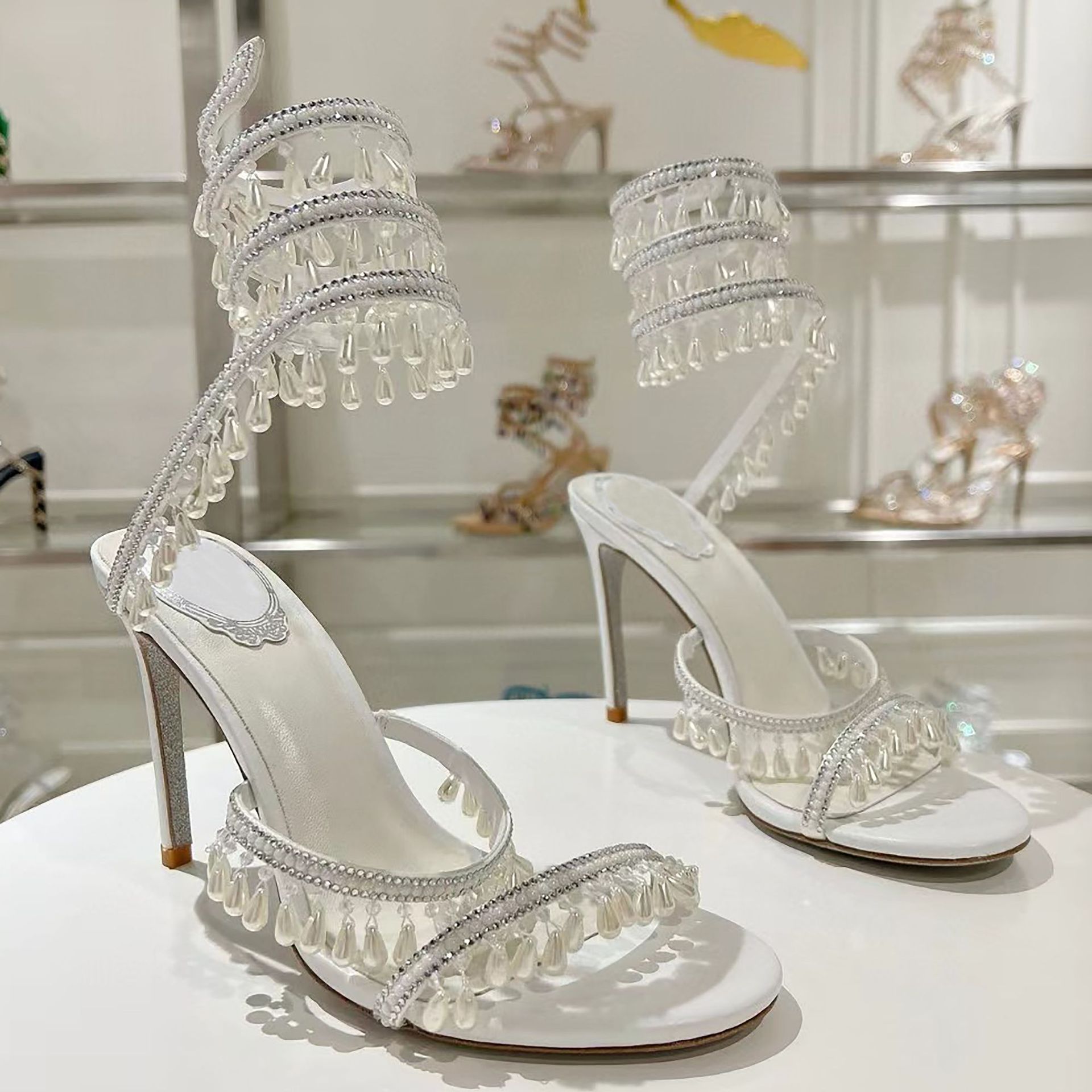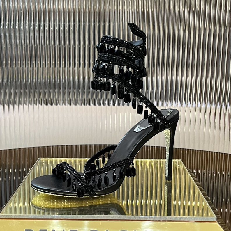 Rc Crystal Chandelier High-Heeled Sandals Fly-Shaped Winding Sexy Fashion Stiletto Dress Shoes Party Wedding 9.5cm