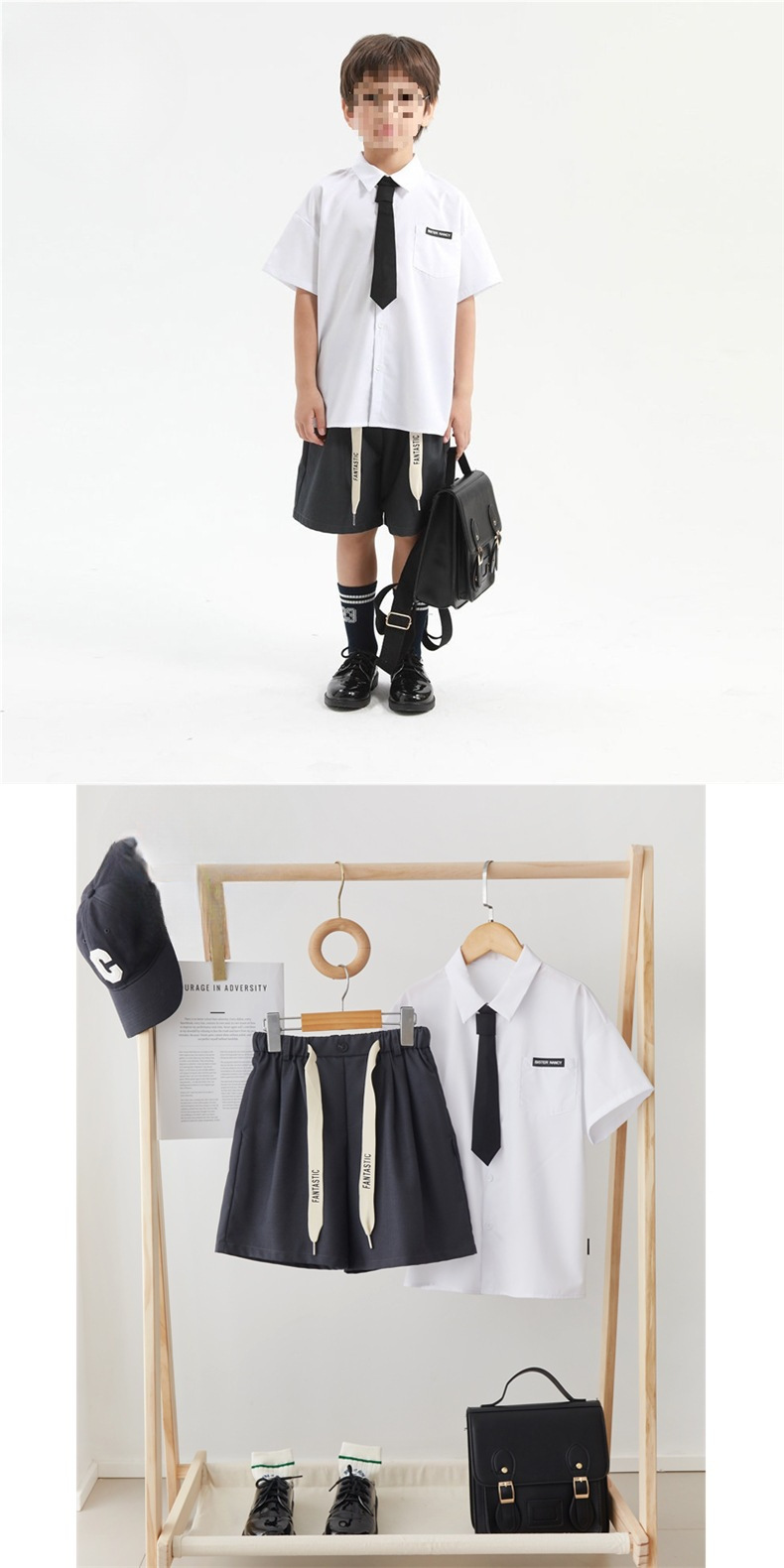 White shirt, gray shorts, tie, high quality anti-wrinkle and super cool material