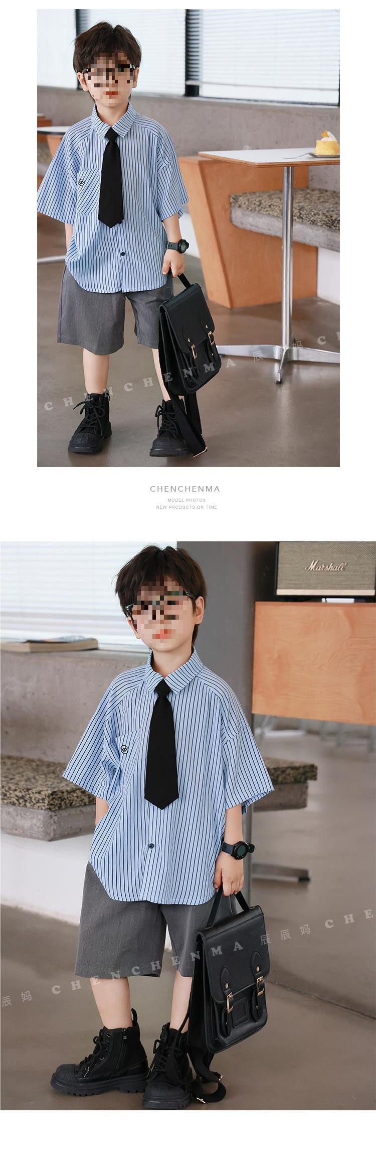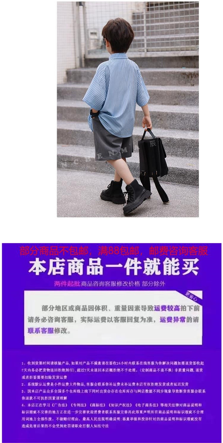 Blue stripes short-sleeved gray shorts tie, high quality anti-wrinkle and cool