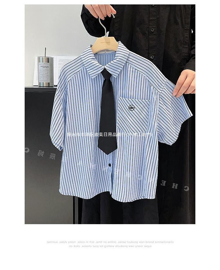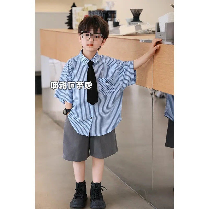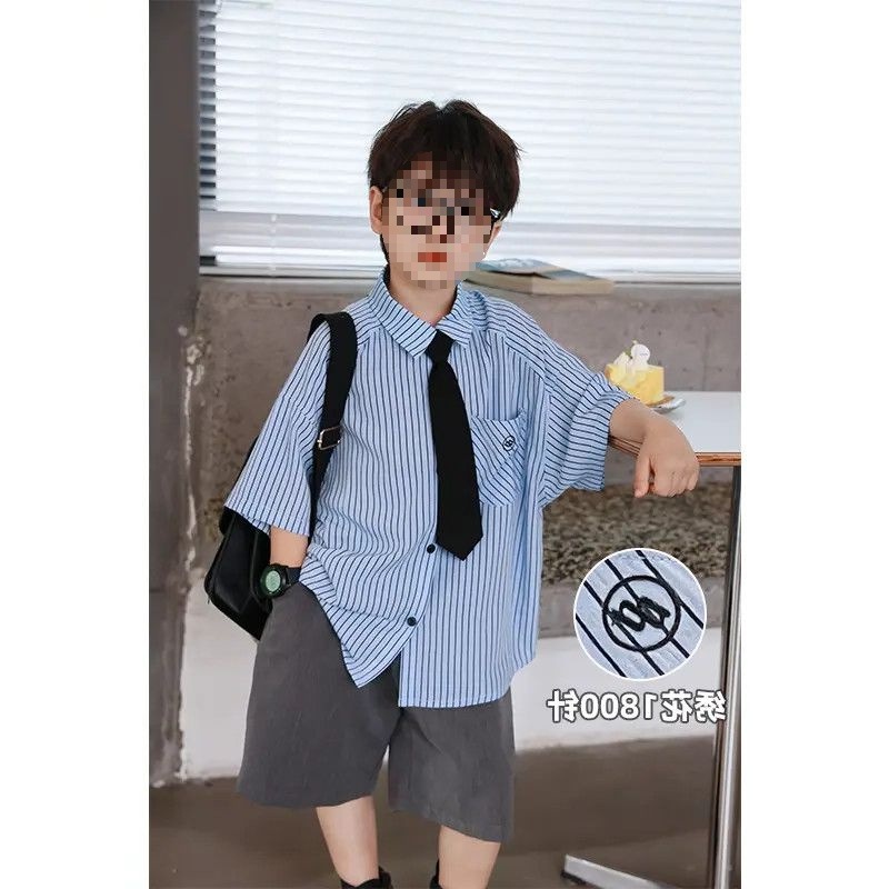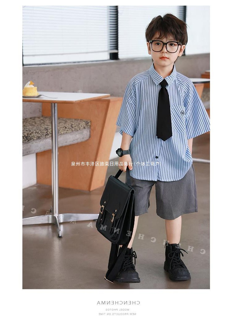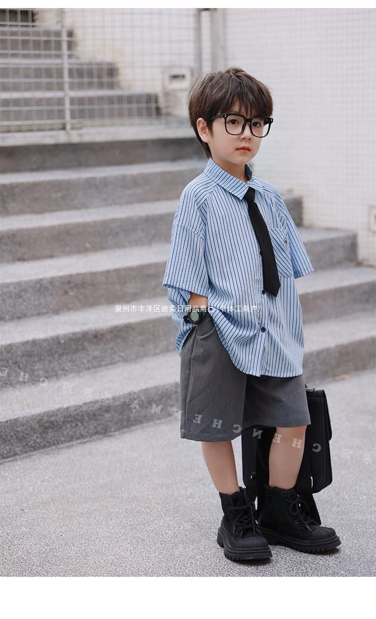 Blue stripes short-sleeved gray shorts tie, high quality anti-wrinkle and cool
