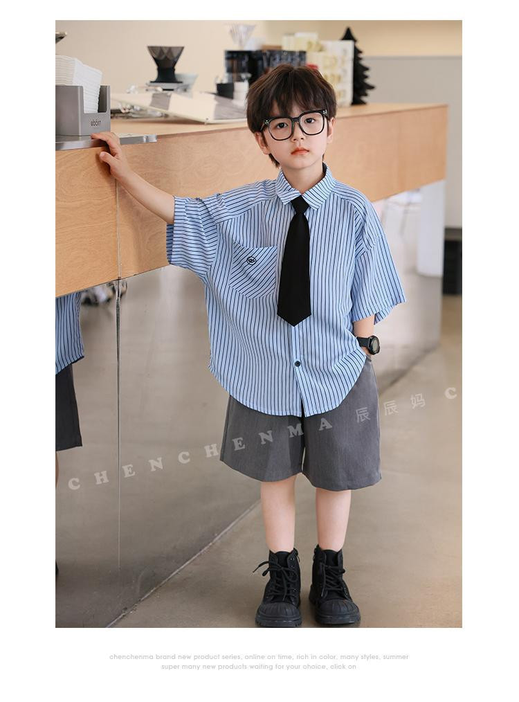 Blue stripes short-sleeved gray shorts tie, high quality anti-wrinkle and cool