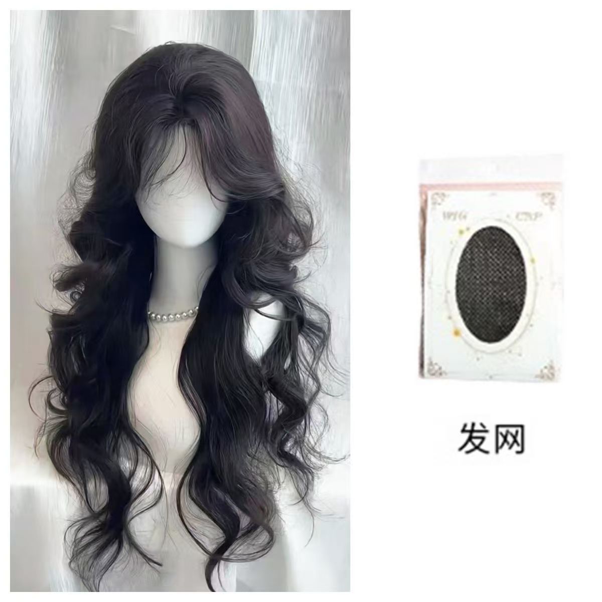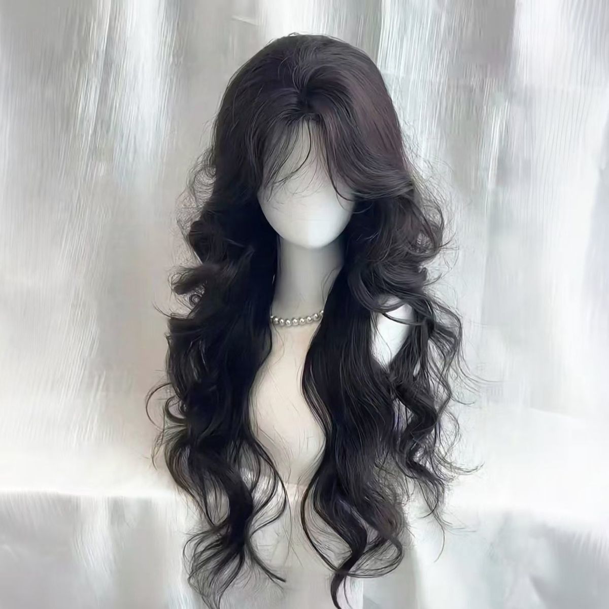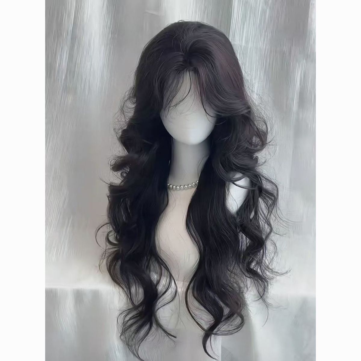 [Luxurious] Korean-Style Elegant Big Wave Black Tea-Colored Wig with Bangs for Women Full Headpiece