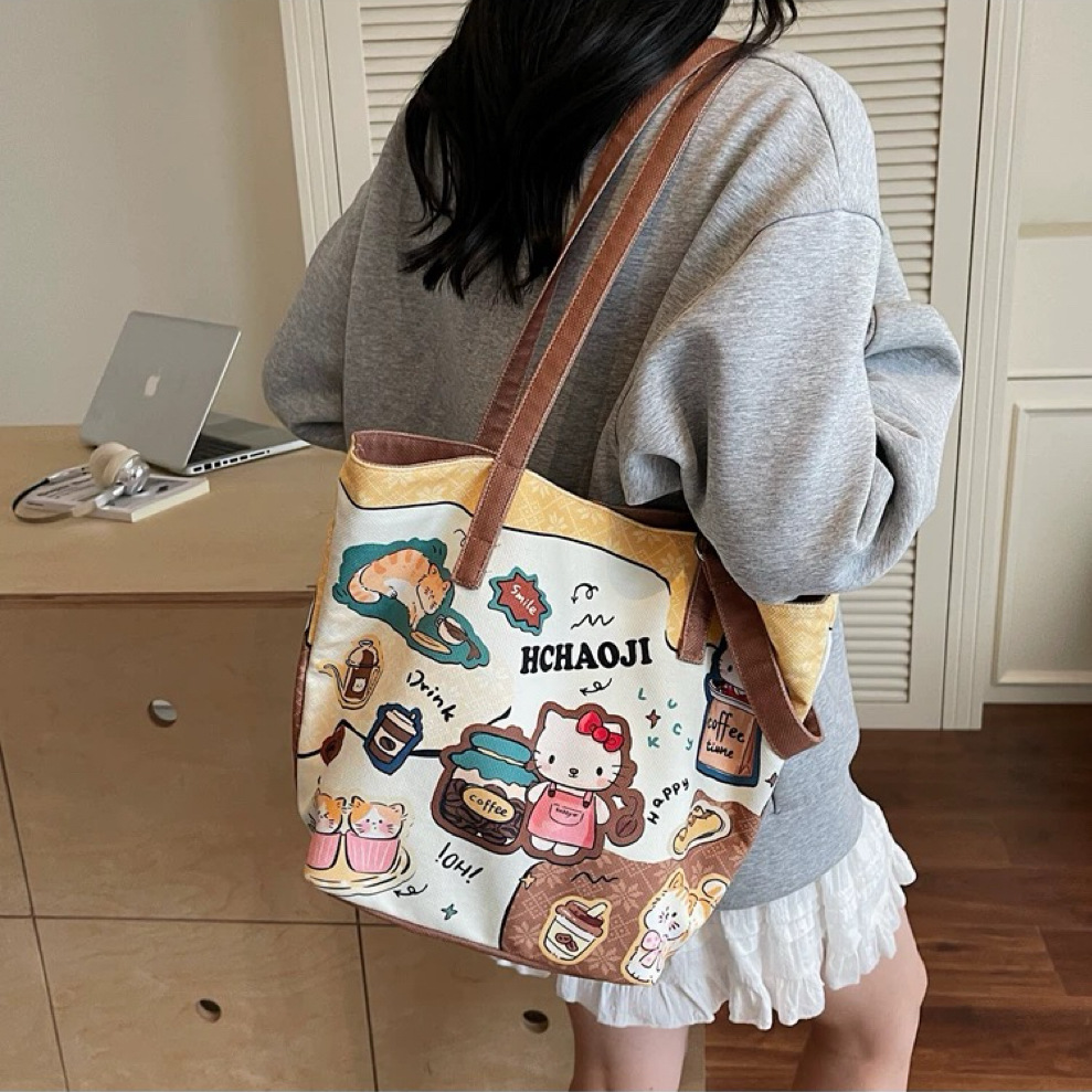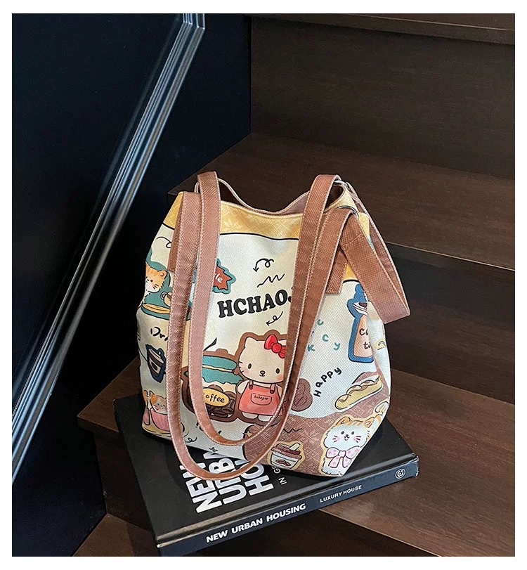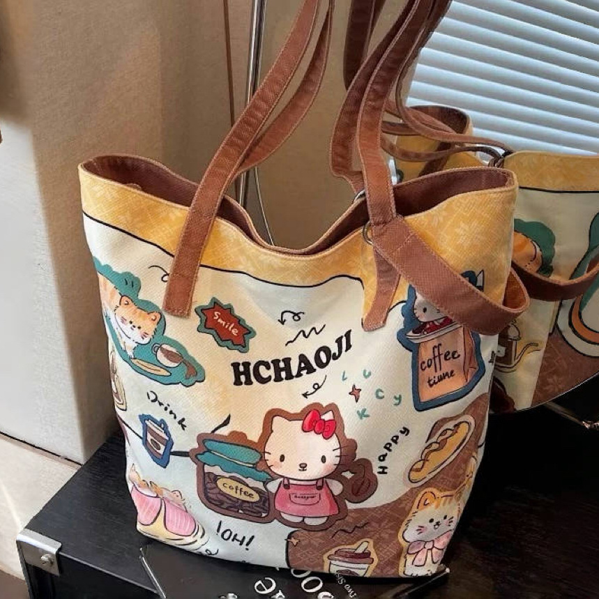 Cute Cartoon Kt Cat Canvas Bag for Women 2025 New Large Capacity Shoulder Bucket Bag Student Class Tote Bag